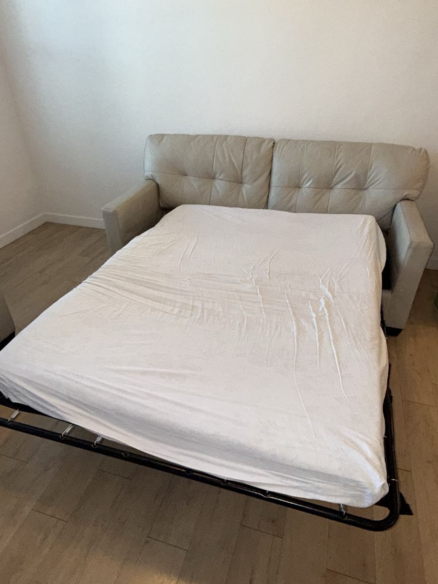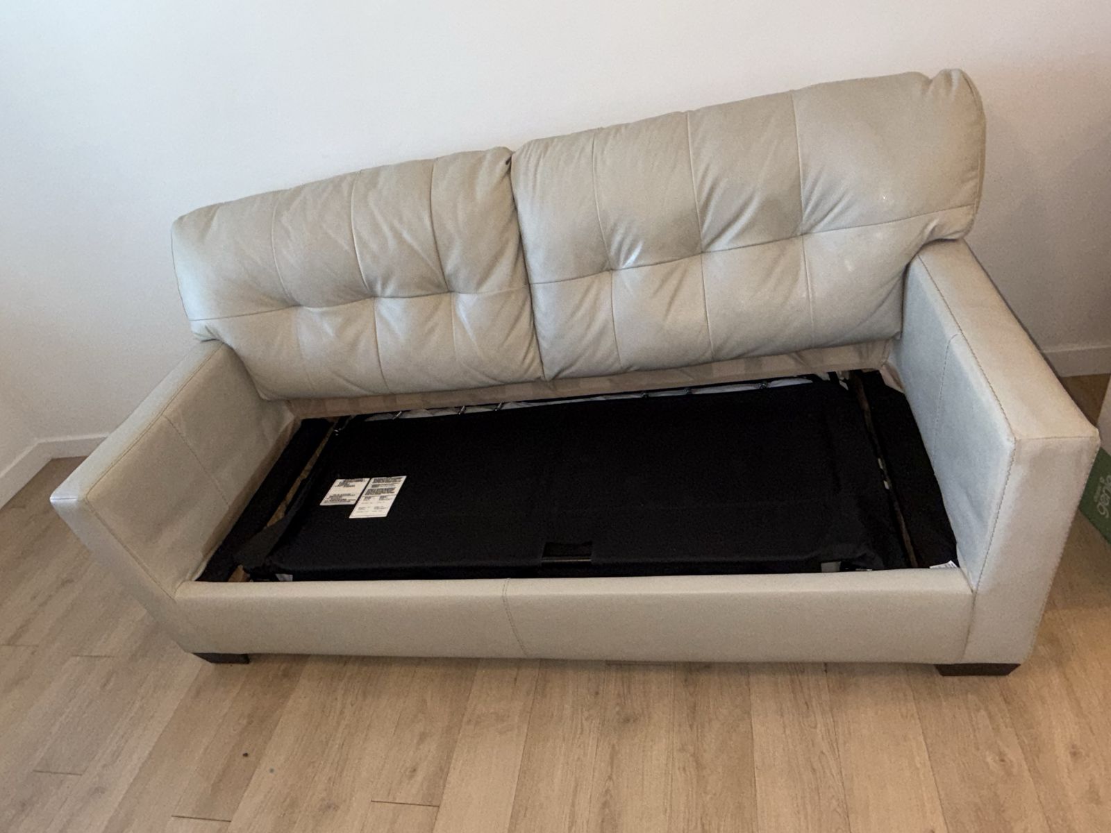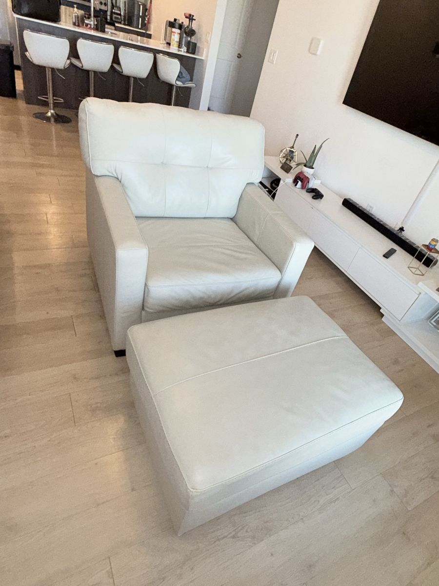 The leather is clean, with no tears, and has been well cared for. Modern light color that fits any space.