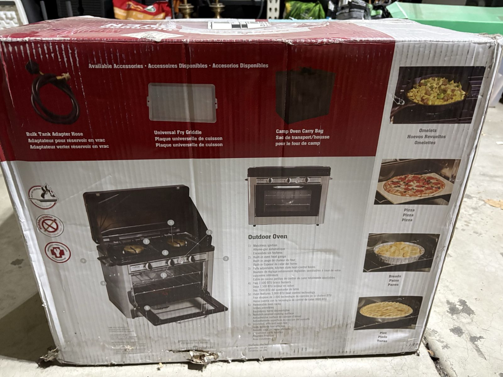 VenmoThe Camp Chef Outdoor Oven is essentially a portable kitchen that bridges the gap between roughing it and "glamping." It combines a powerful two-burner stove with a functional oven, allowing you to bake anything from fresh cinnamon rolls to pizza while at a campsite or during a power outage. Here is a detailed breakdown of its features and specifications: Cooktop Features • Dual Burners: Two 7,500 BTU brass burners provide plenty of heat for boiling water, frying bacon, or simmering sauces simultaneously. • Wind Guard: The lid and side flaps flip up to create a three-sided windshield, which is crucial for maintaining a steady flame in outdoor conditions. • Matchless Ignition: It features a piezo igniter, so you don't have to worry about finding a lighter in the dark. Oven Capabilities • Baking Space: The oven reaches temperatures up to 400°F and is large enough to fit a standard 9x13 inch pan. • Temperature Control: It includes a built-in oven thermometer on the faceplate and an adjustable heat dial. • Insulated Design: The oven is designed with a double-layered glass door and an insulated heat-efficient shell to keep the heat inside, even in cooler weather. Portability & Build • Fuel Source: It is designed to run on a 1lb disposable propane bottle, making it highly portable. However, it can be connected to a standard 20lb bulk tank with an optional adapter hose. • Construction: The unit is made of stainless steel for durability and easy cleaning, with a non-stick enamel cooking surface on the oven floor. • Weight: It weighs roughly 32–35 lbs, making it manageable for car camping or tailgating, though it's too heavy for backpacking. Dimensions • Overall Size: Approximately 21" L x 12.5" W x 18" H. • Internal Oven: Approximately 11" L x 16" W x 8.5" H.