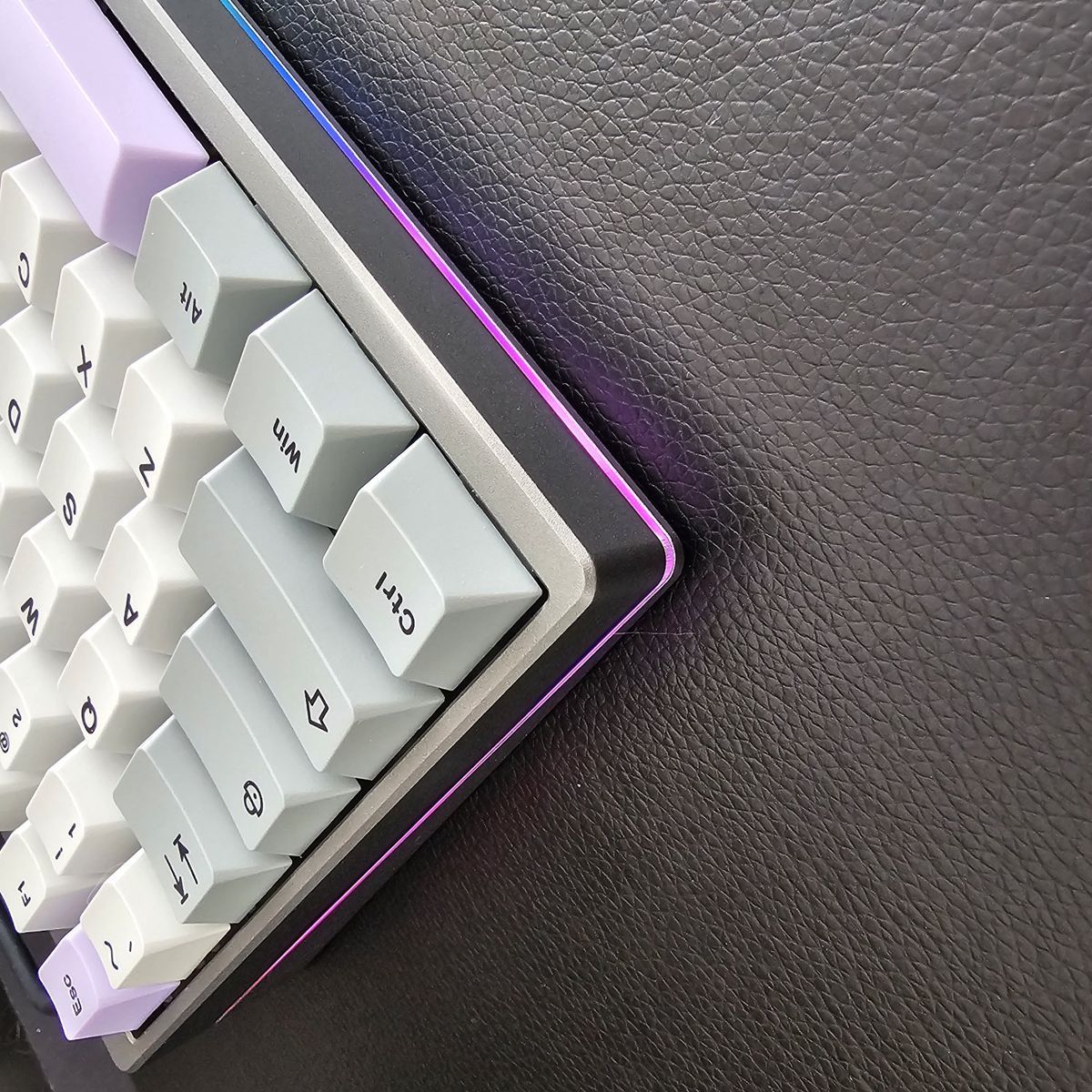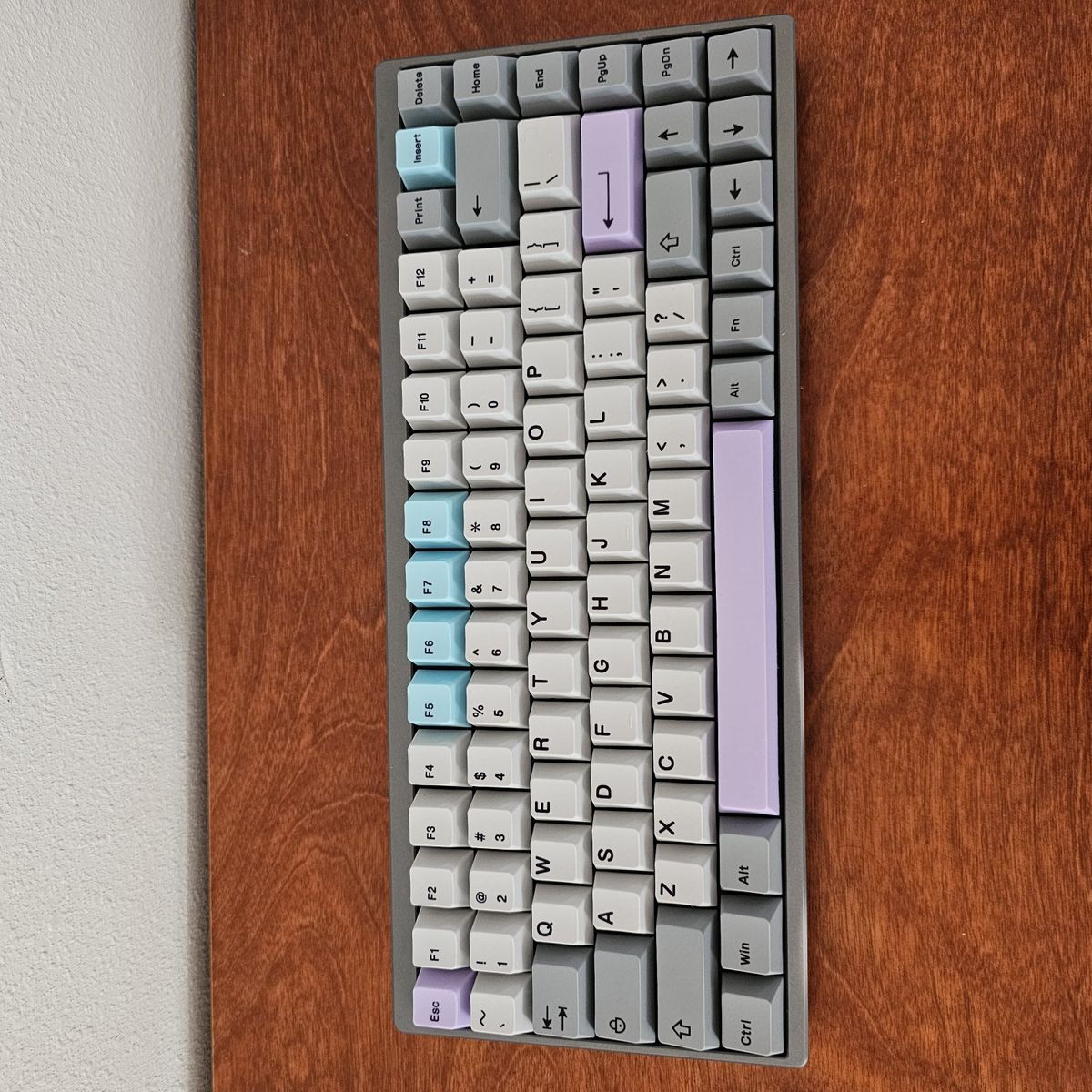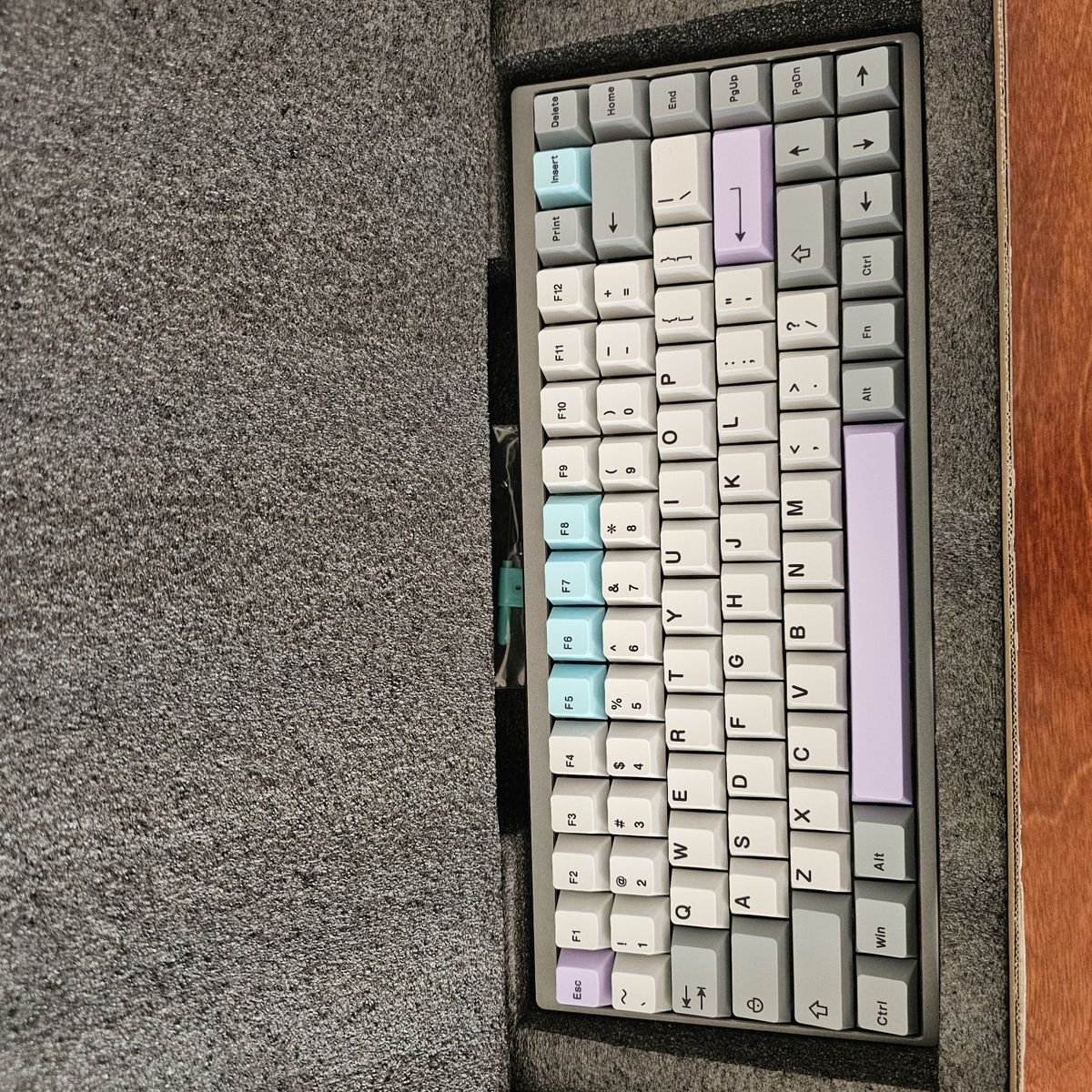 It features a compact 75% keyboard layout that still offers the F-Row Keys, as well as the Arrow keys in the bottom right. The PCB offers Hot-Swappable Switches and has RGB. It Currently has installed Gazzew Boba U4t Silent tactile switches which have all been hand-lubed with Krytox 205g0. Stabilizers were lubed with Krytox 205g0 as well and have been holee modded. It has been tape modded with 2-Layers and extra foam was added as well to help give it a more "Silent Thocky" sound profile. This is a great keyboard for the office to not disturb others or if you're trying to work late at night at home. It's also pretty heavy for a keyboard.