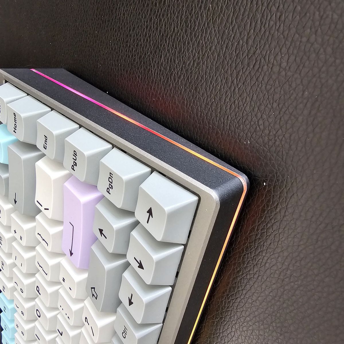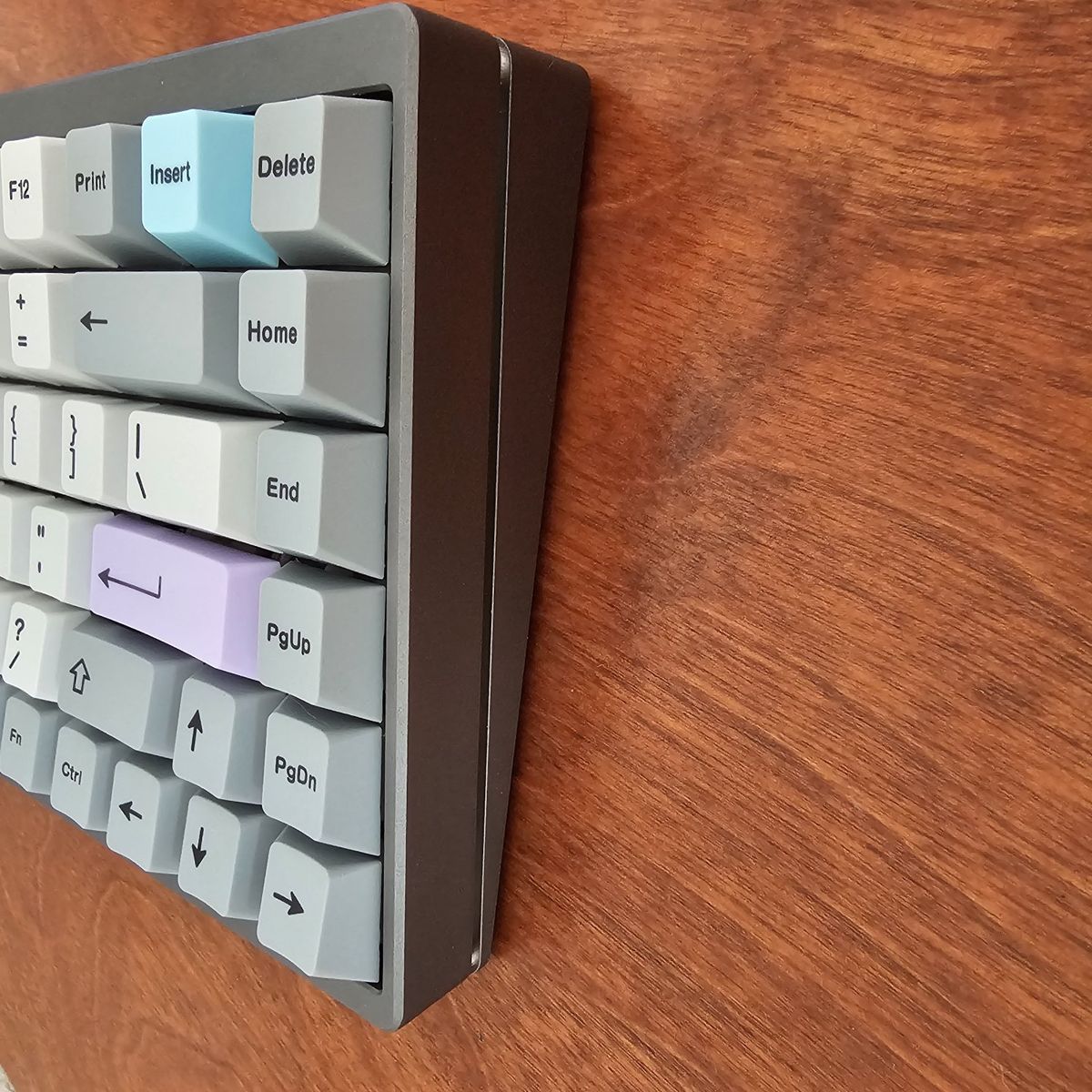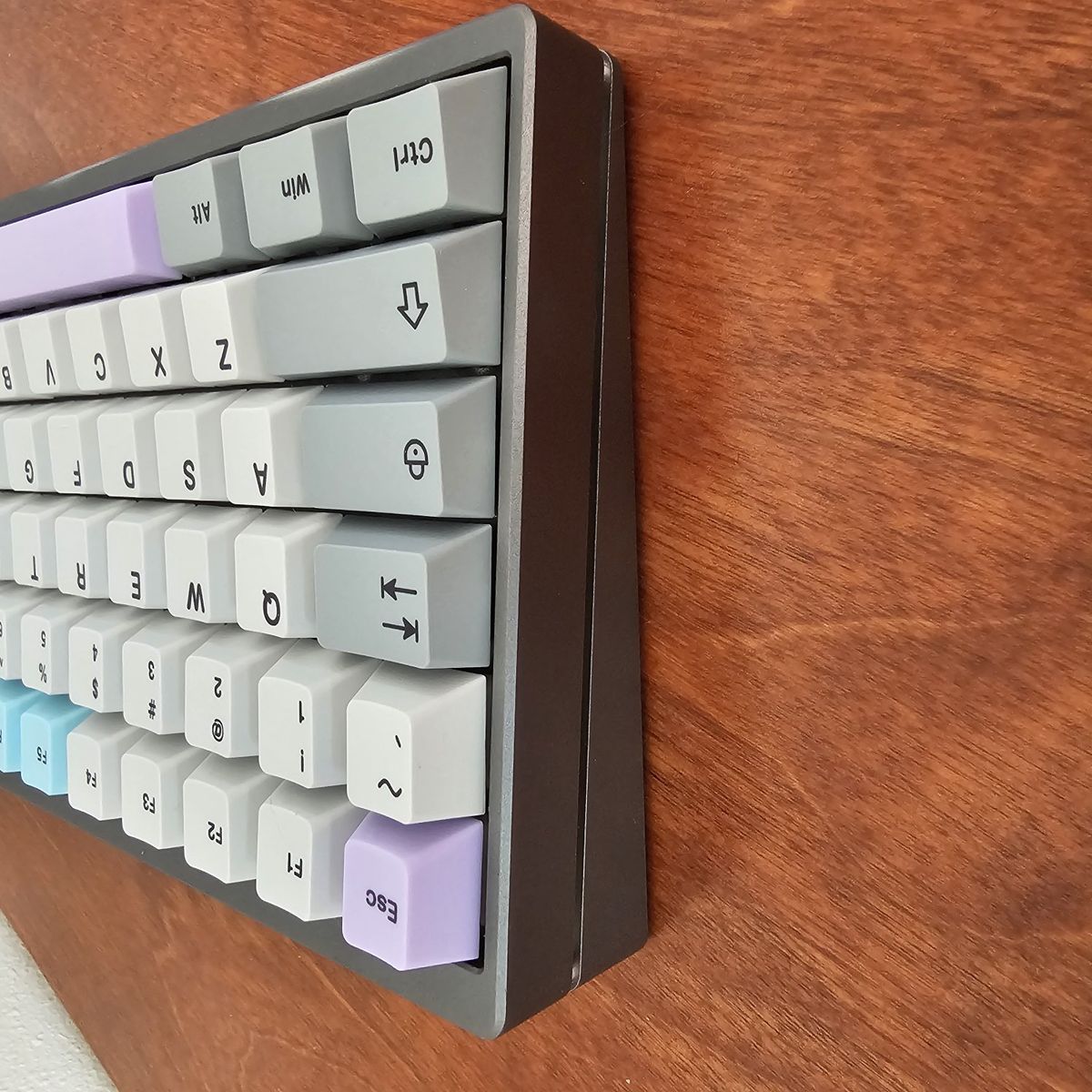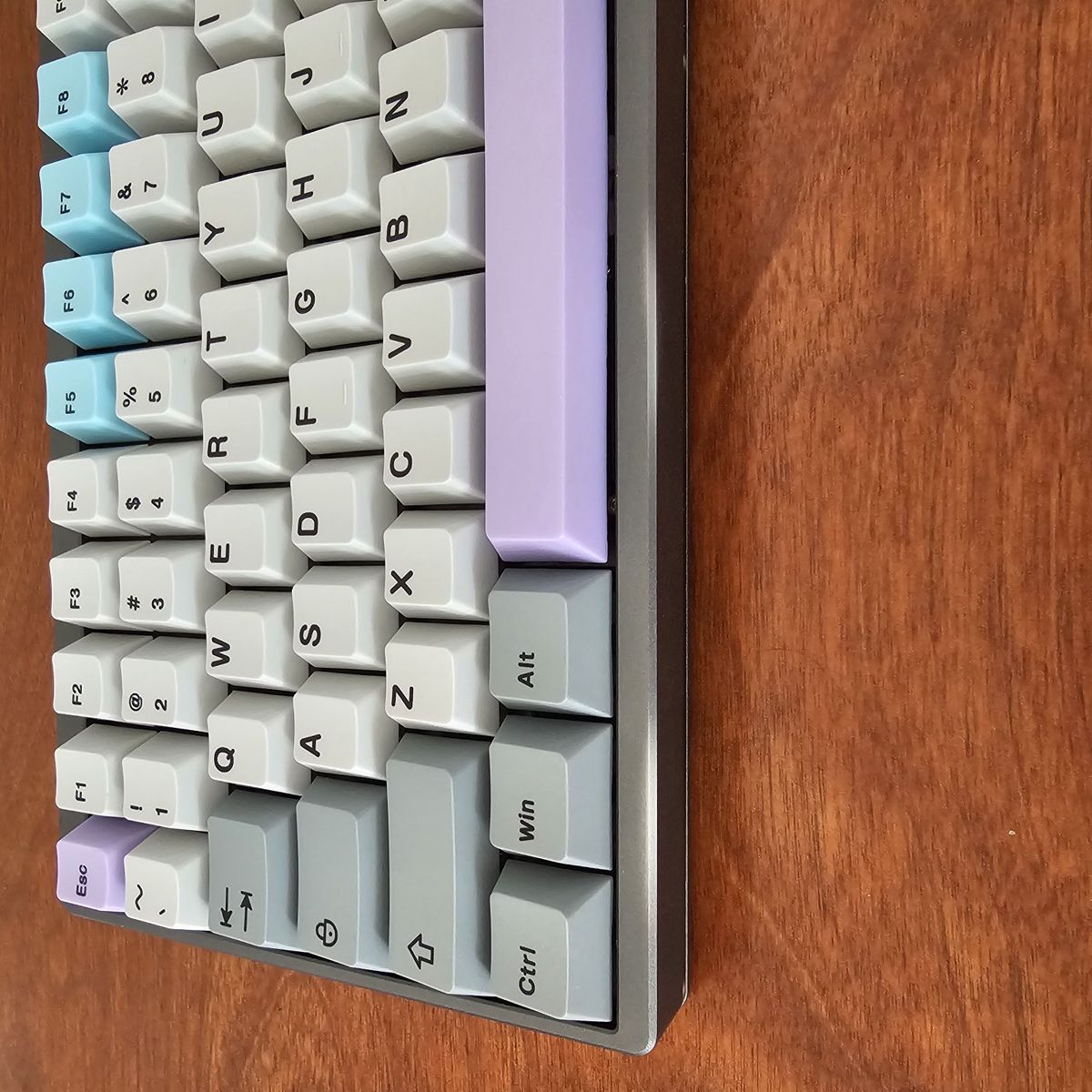 It features a compact 75% keyboard layout that still offers the F-Row Keys, as well as the Arrow keys in the bottom right. The PCB offers Hot-Swappable Switches and has RGB. It Currently has installed Gazzew Boba U4t Silent tactile switches which have all been hand-lubed with Krytox 205g0. Stabilizers were lubed with Krytox 205g0 as well and have been holee modded. It has been tape modded with 2-Layers and extra foam was added as well to help give it a more "Silent Thocky" sound profile. This is a great keyboard for the office to not disturb others or if you're trying to work late at night at home. It's also pretty heavy for a keyboard.