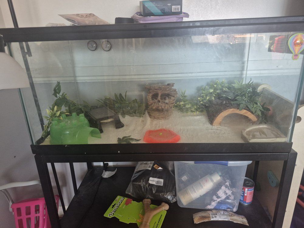VenmoI have a leopard gecko that I am needing to rehome, as I am moving across the country and am just not able to bring him with unfortunately. I rescued him from someone else, so I am not sure how old he is, but I have had him for 7 years now myself. He will come with his 40 gallon breeder tank with the lid, under tank heater with thermostat, 2 water dishes, all decor shown in the photo, and the tank stand. I am charging a rehoming fee to ensure he goes to a good home. $125 OBO.