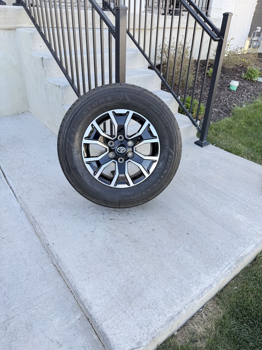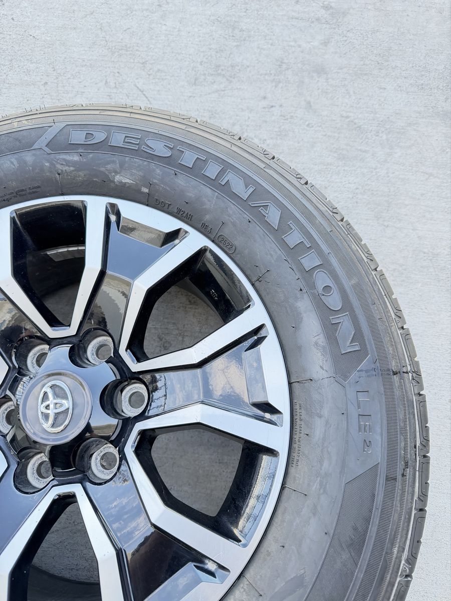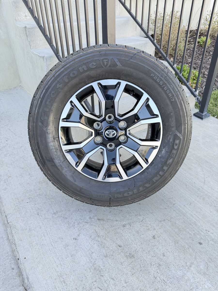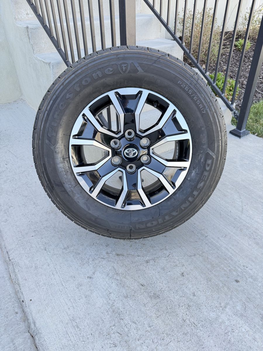 ApplePaySet of 4-Toyota Tacoma 4Runner Rims and Tires 265/65R17 Firestone Destinations like new only 2000 miles on them in excellent condition,asking $1000 obo Tires have only 2000 miles Rims are in great condition,no curb rash 2 center caps are missing I can sell the rims or tires separately Bolt pattern 6-5.5/6-139.7 They will fit Toyota Tacoma 4runner tundra sequoia FJ Crusier Text anytime 385-402-2292