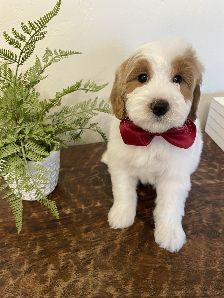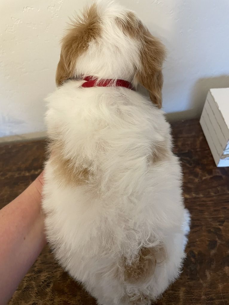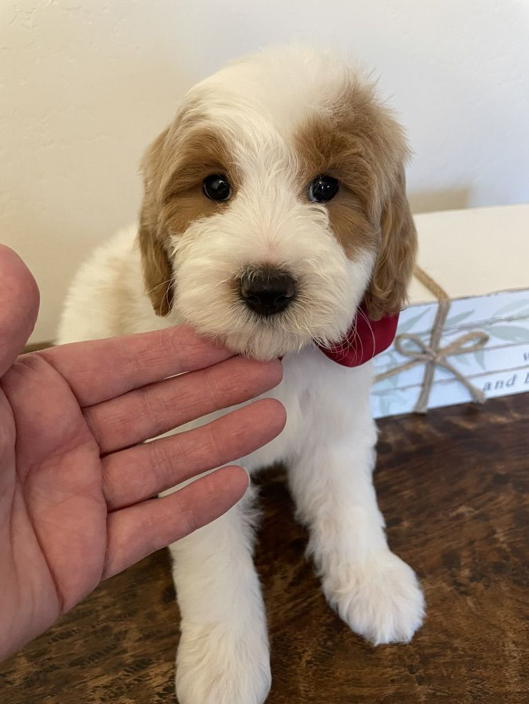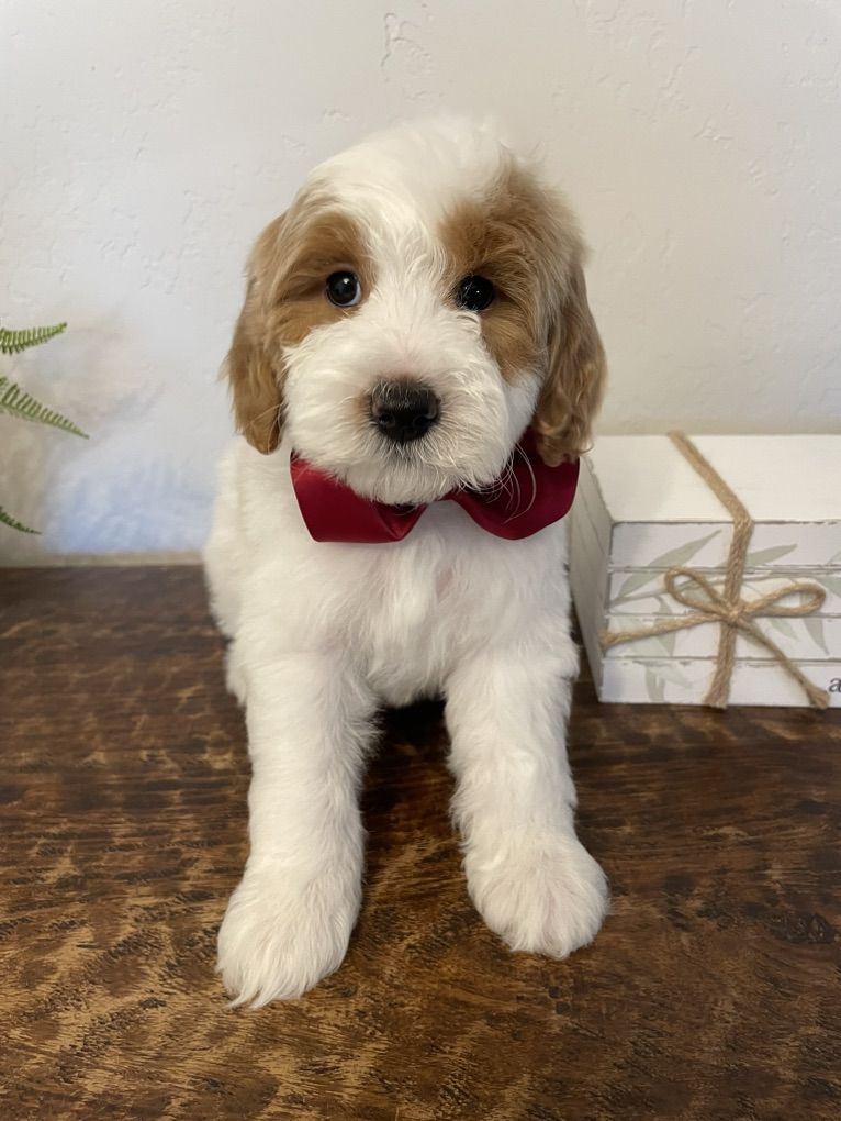 ZelleMeet “Higgins” red collar boy from Olive and Bentleys litter. He has a gorgeous white with red markings coat. Ready to go now. He will be approx 20 pounds full grown. His parents are 20 and 15 lbs. He has a wavy, non-shedding coat. Parents are DNA tested.
