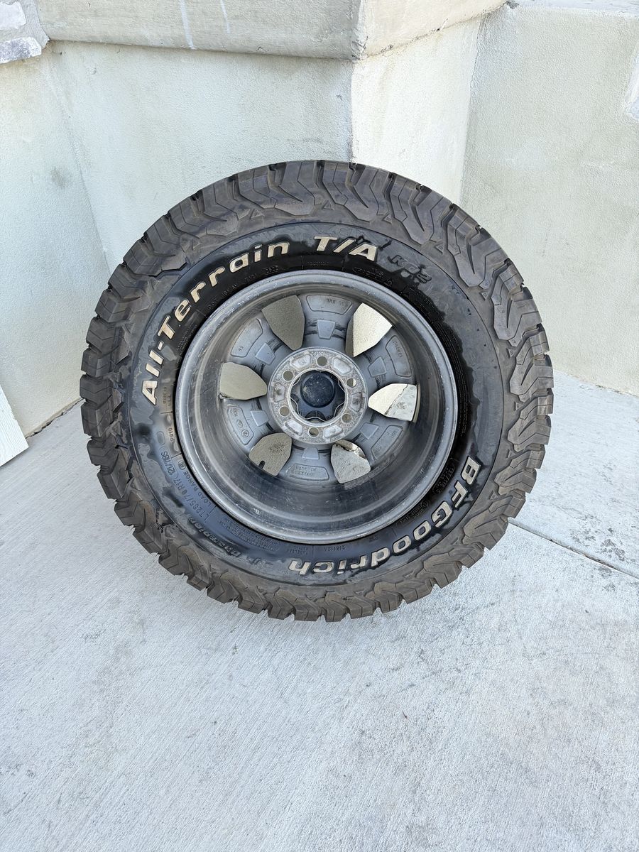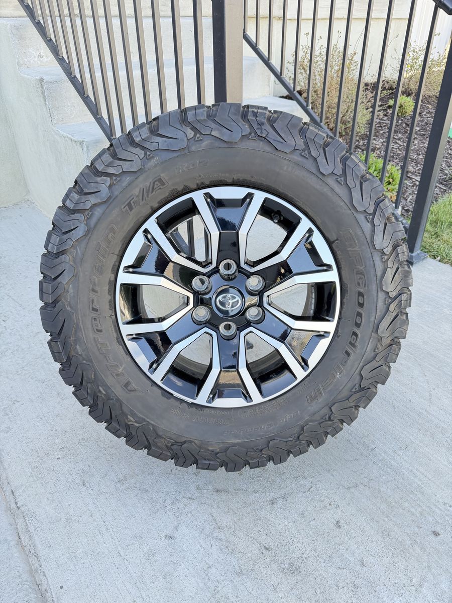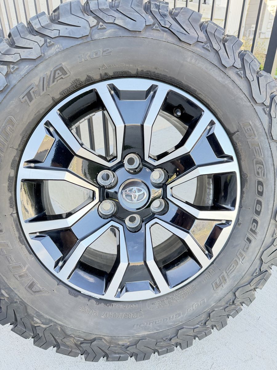 ApplePaySet of 4-Toyota Tacoma 4Runner Rims and Tires 265/70R17 Bfgoodrich Ko2 Load E like new only 1000 miles on them in excellent condition,asking $1350 obo Tires have only 1000 miles Rims are in great condition,no curb rash Missing 2 center caps I can sell the rims or tires separately Bolt pattern 6-5.5/6-139.7 They will fit any 6 lug Toyota truck and suv Text anytime 385-402-2292