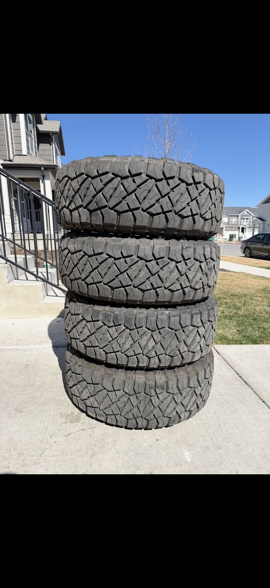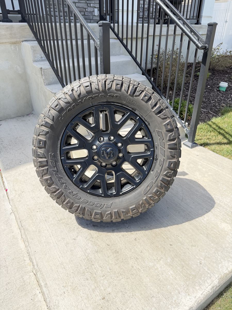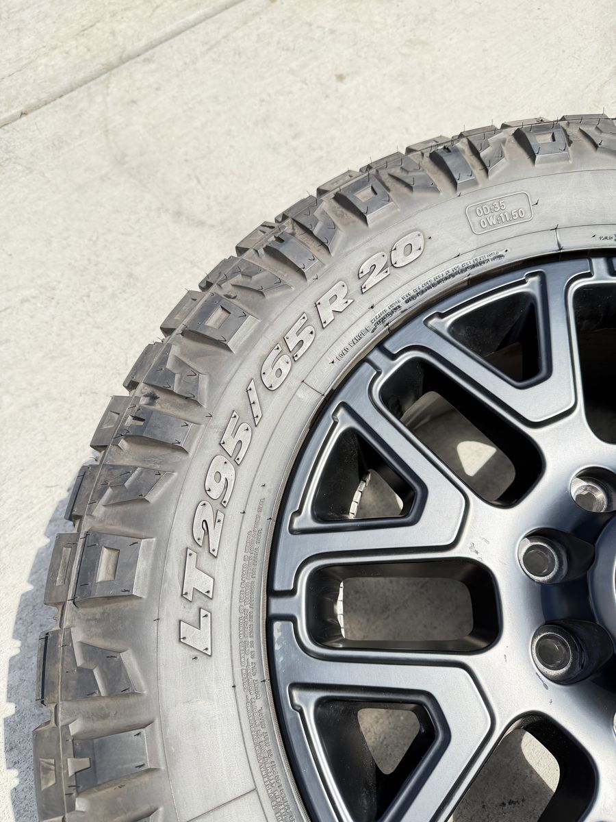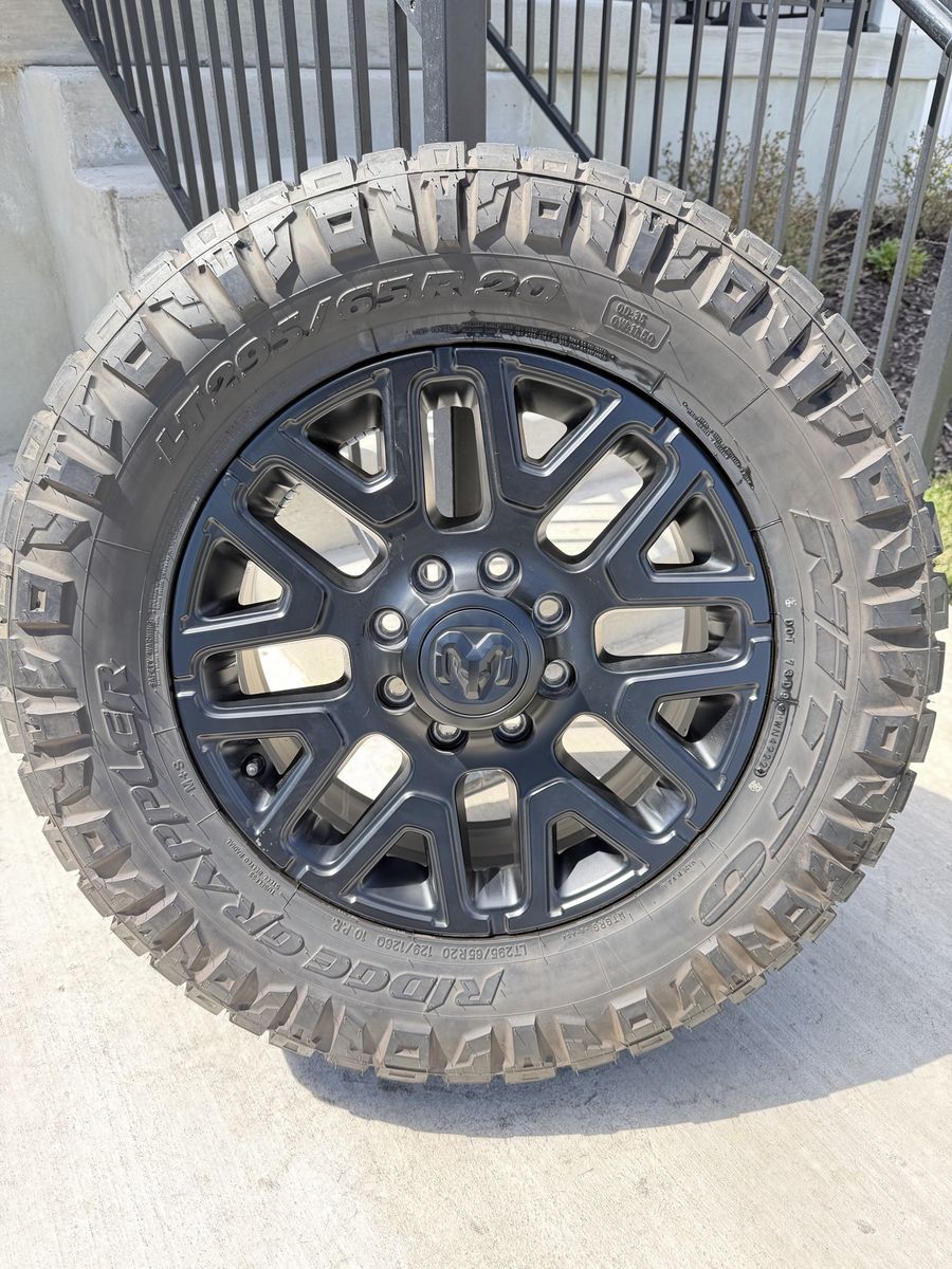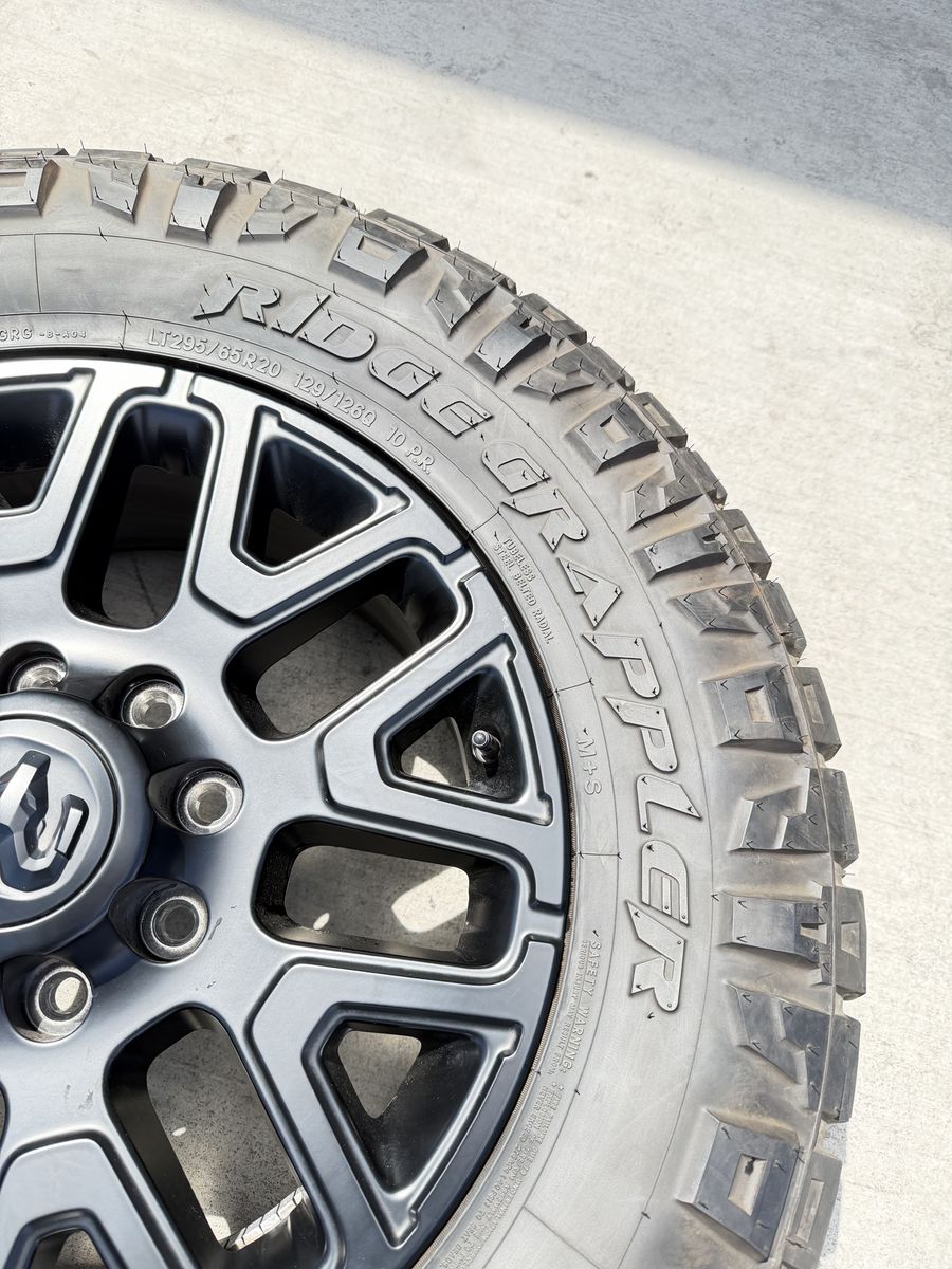 ApplePaySet of 4-Dodge Ram 3500 Limited Rims and Tires 295/65R20 Nitto Ridge Grappler Load E Almost new in excellent condition asking $3000 obo They have 5000 miles on them Rims are in great condition 1 rim has a minor scratch on the center cap I can sell the rims or tires separately Comes with lug nuts Bolt pattern 8-6.5 Text anytime 385-402-2292