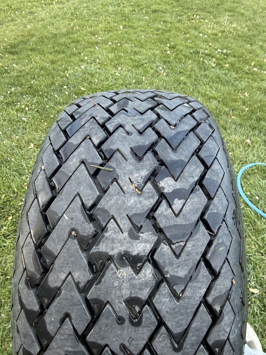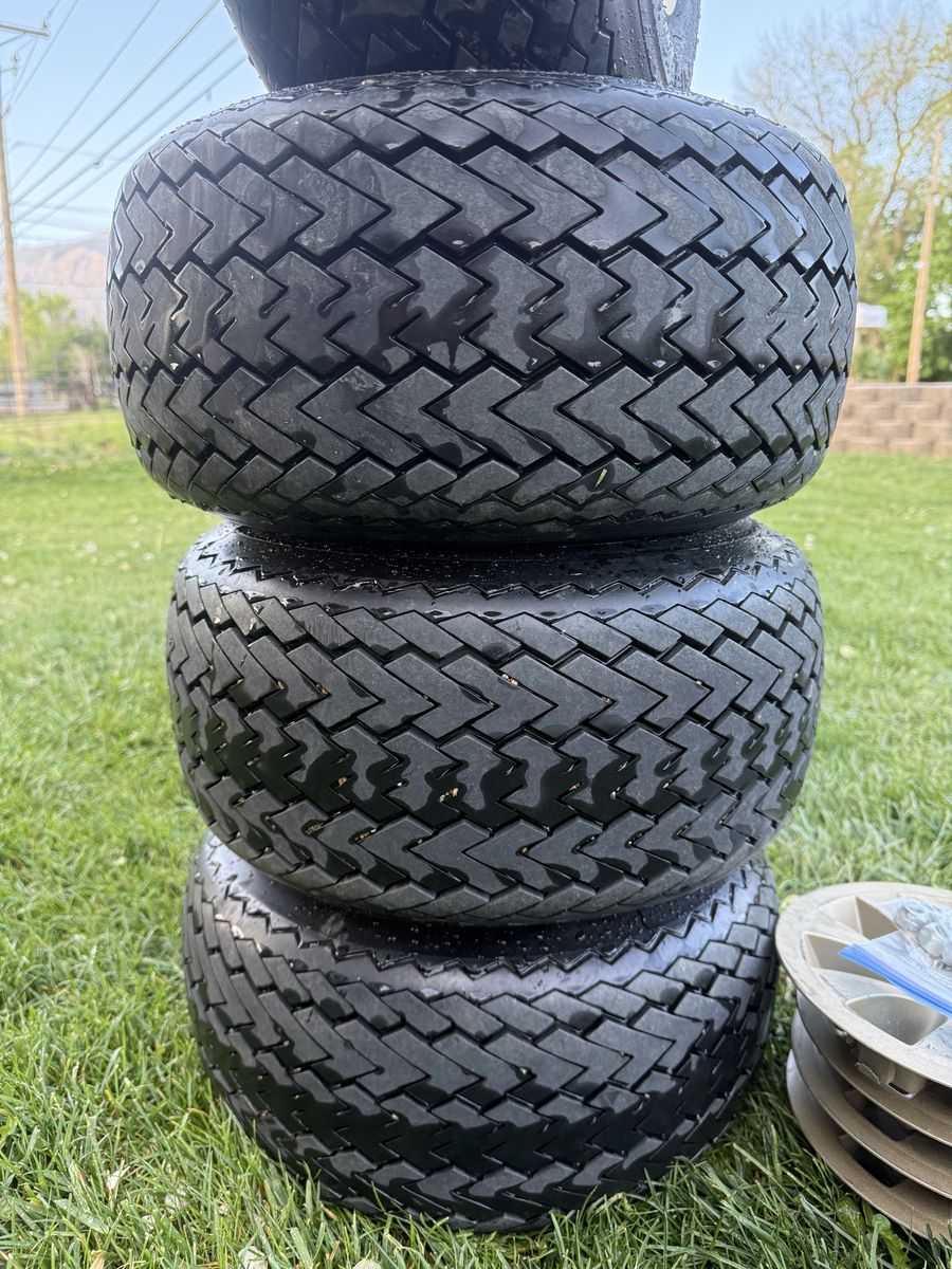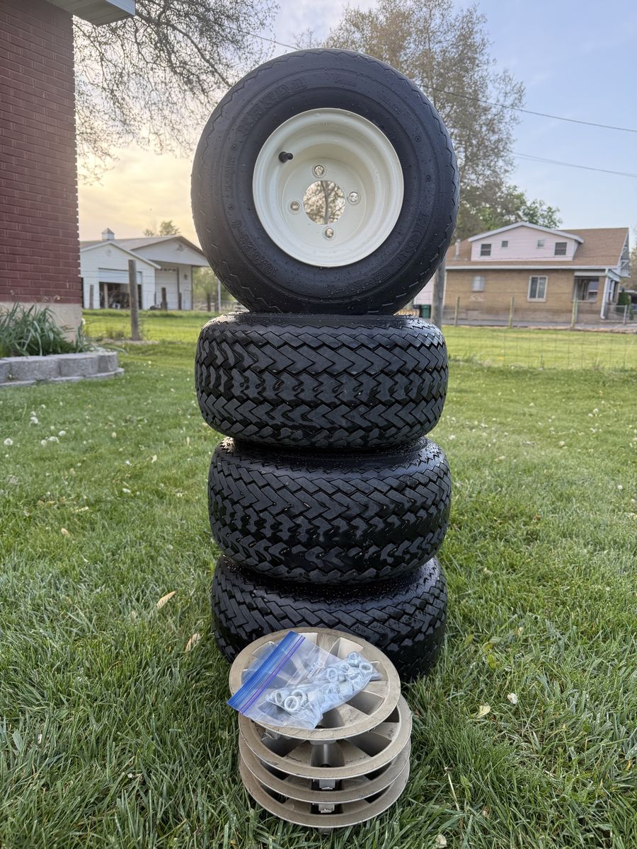 EZGO Golf cart wheels and tires, they are in great condition off of a 2023 cart. They come with lug nuts and hub caps.