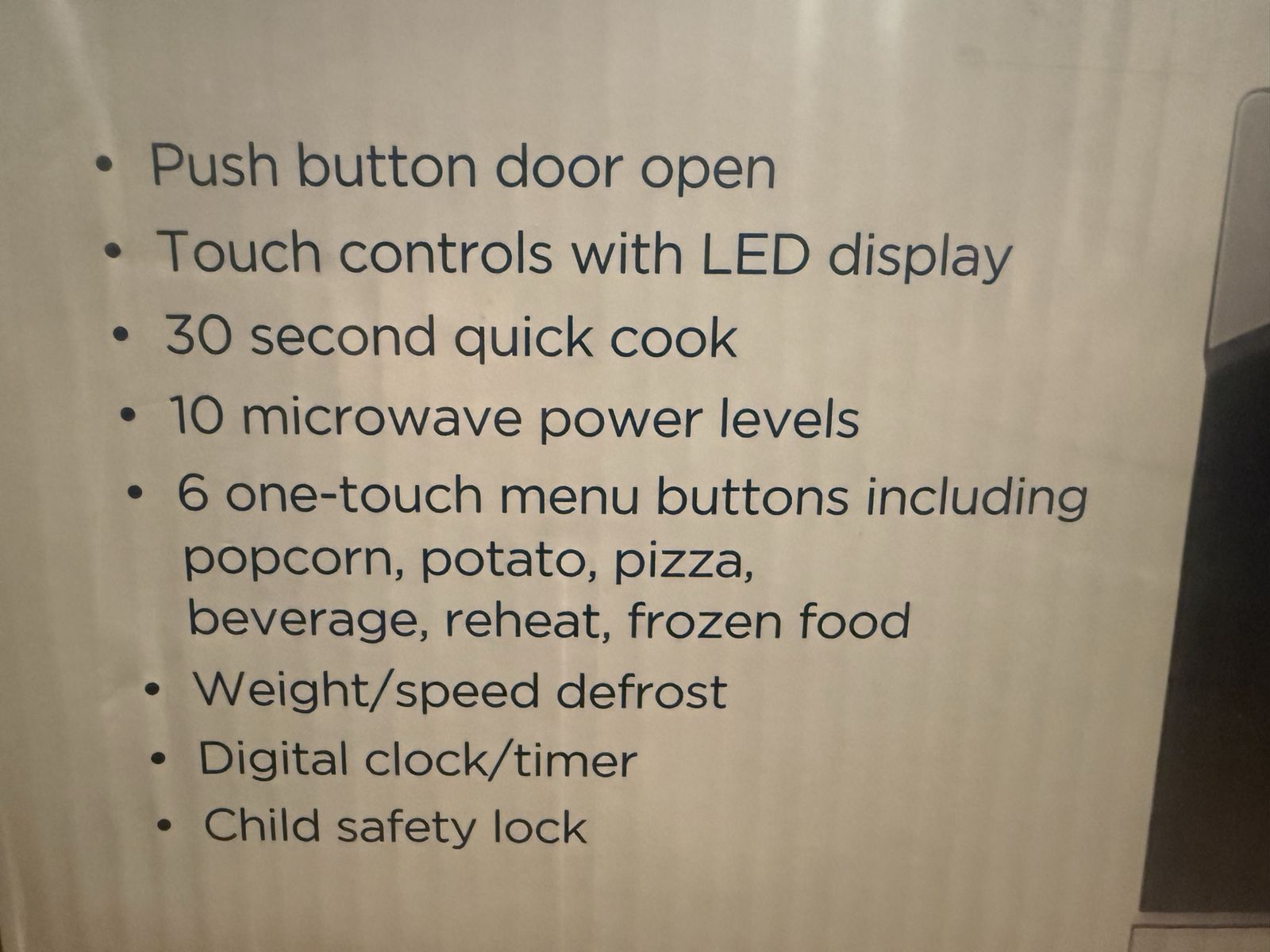 Push button door open • Touch controls with LED display • 30 second quick cook • 10 microwave power levels • 6 one-touch menu buttons including popcorn, potato, pizza, beverage, reheat, frozen food • Weight/speed defrost • Digital clock/timer • Child safety lock