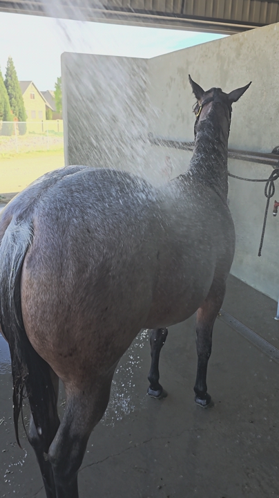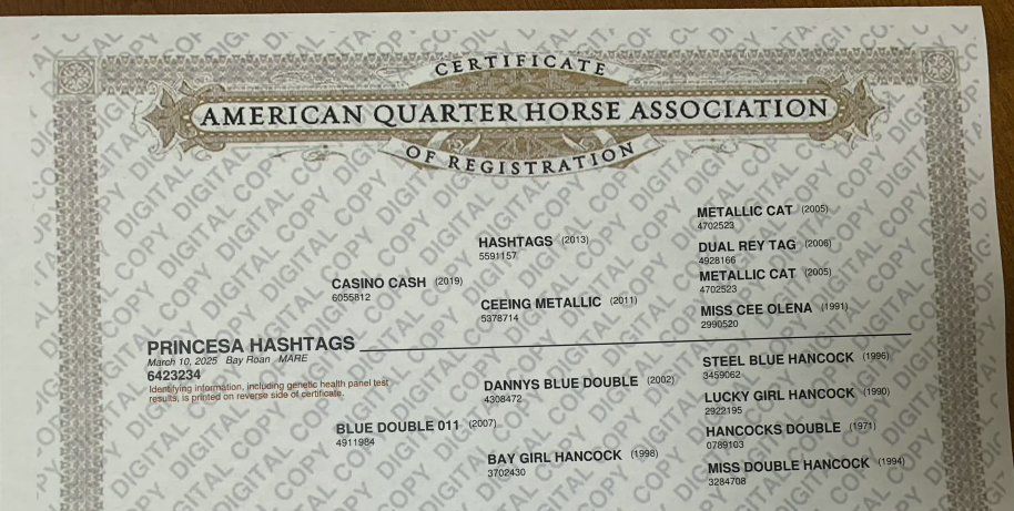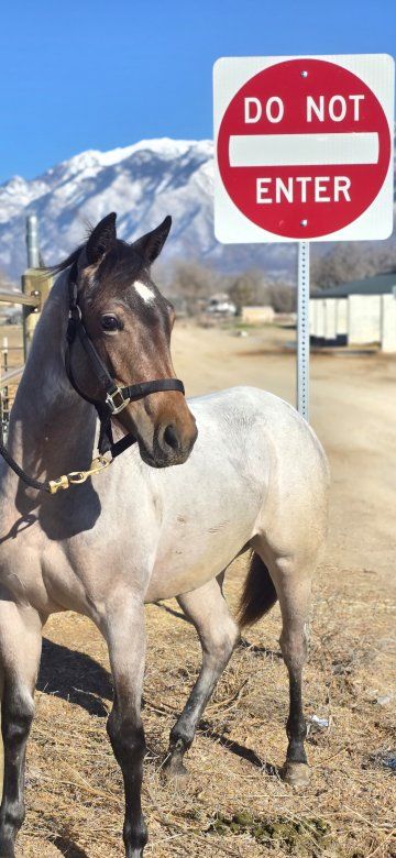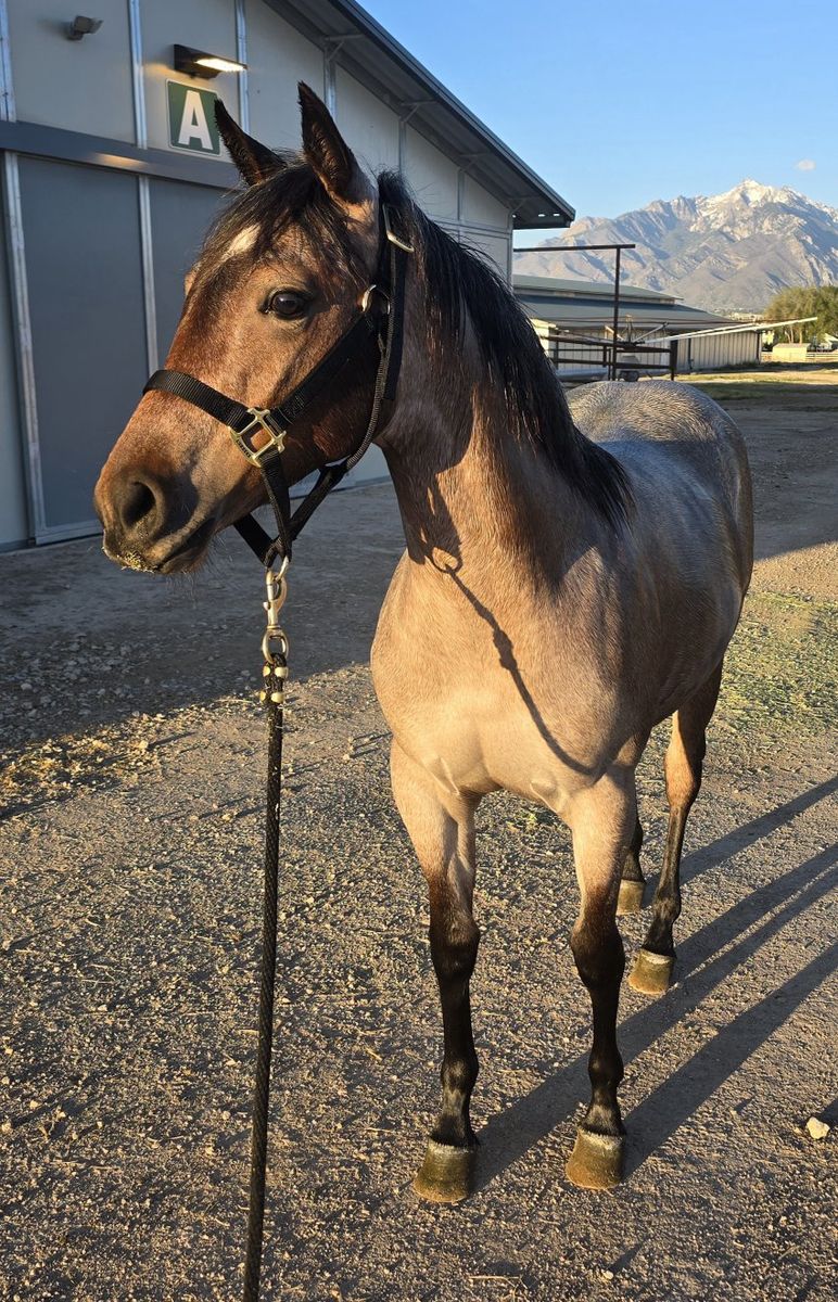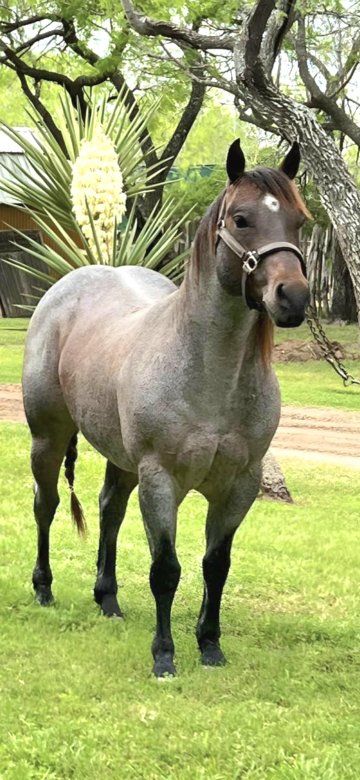 Beautiful 1-year-2-month-old bay roan filly. Very strong and robust. Very healthy. She has excellent bloodlines, including Metallic Cat, and is a granddaughter of the stallion Hashtags. The last photo is of the filly's sire.