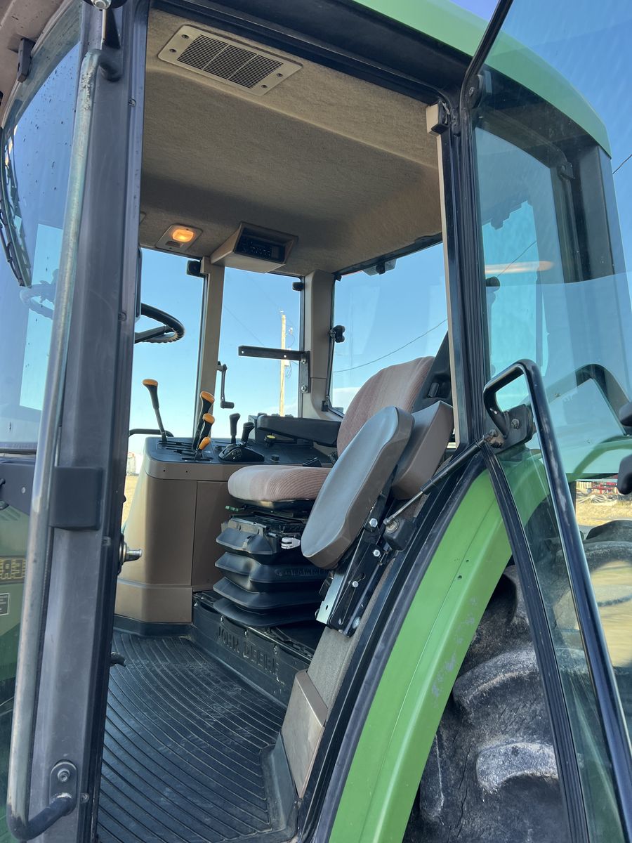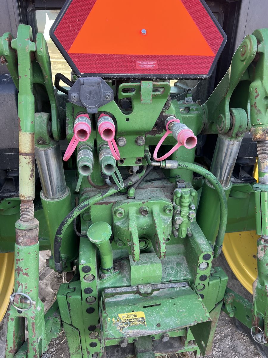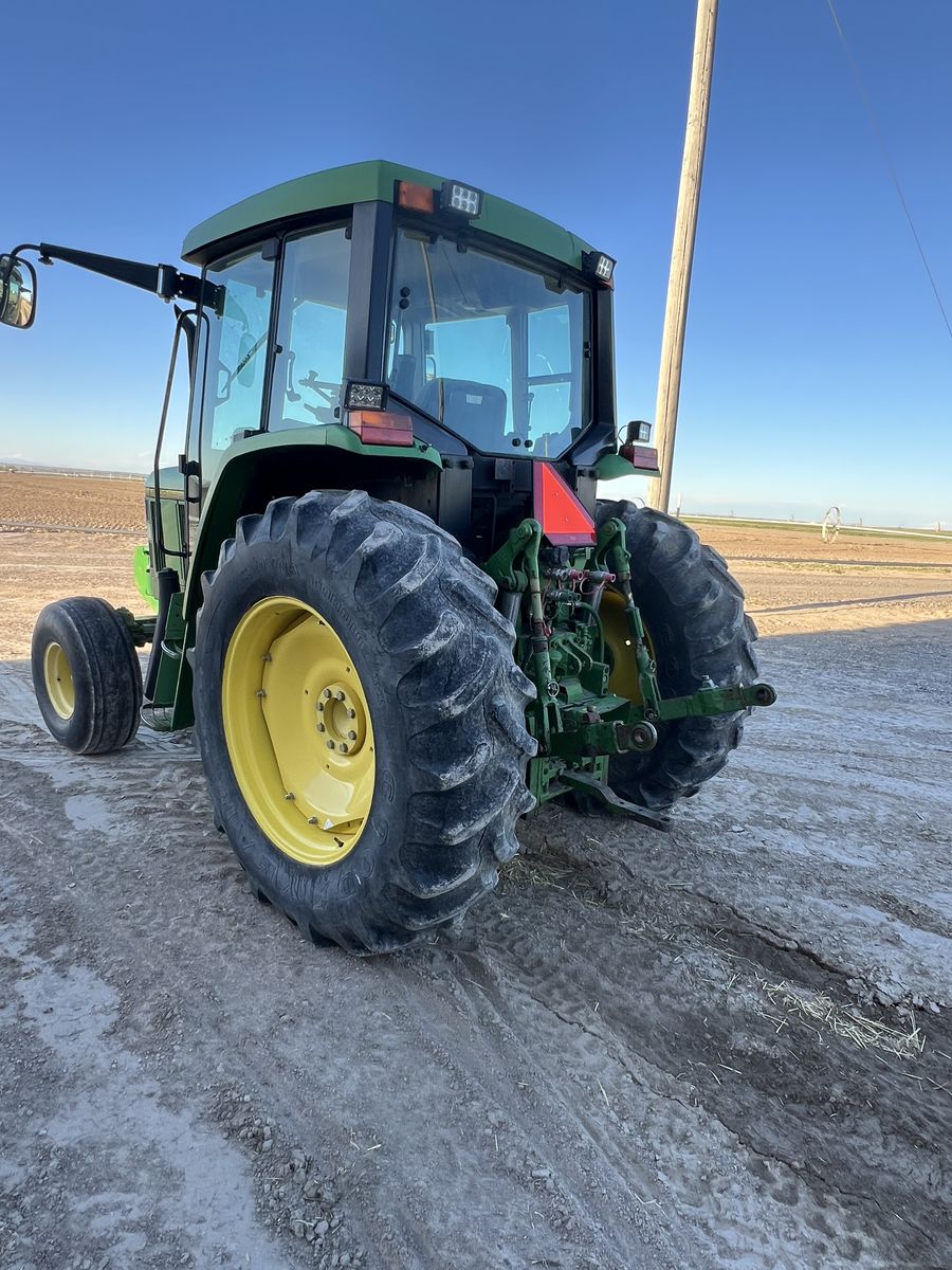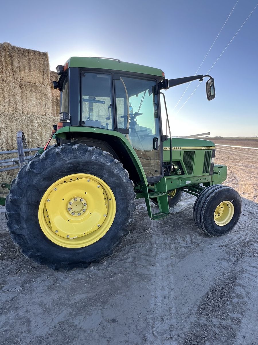 John Deere 6300 Tractor. New air ride seat. 2wd , 16 speed power quad transmission, right hand reverser. 2 remote scv valves. 6314hrs. Air conditioning and heat work great. All new LED lights. Used as a rake tractor, but no longer needed. Has been a very good reliable- comfortable to drive rake tractor. Very good working condition and has been well maintained . Top link not shown in photo- but included. 18.4x34 rear tires, 11.00x16 fronts.