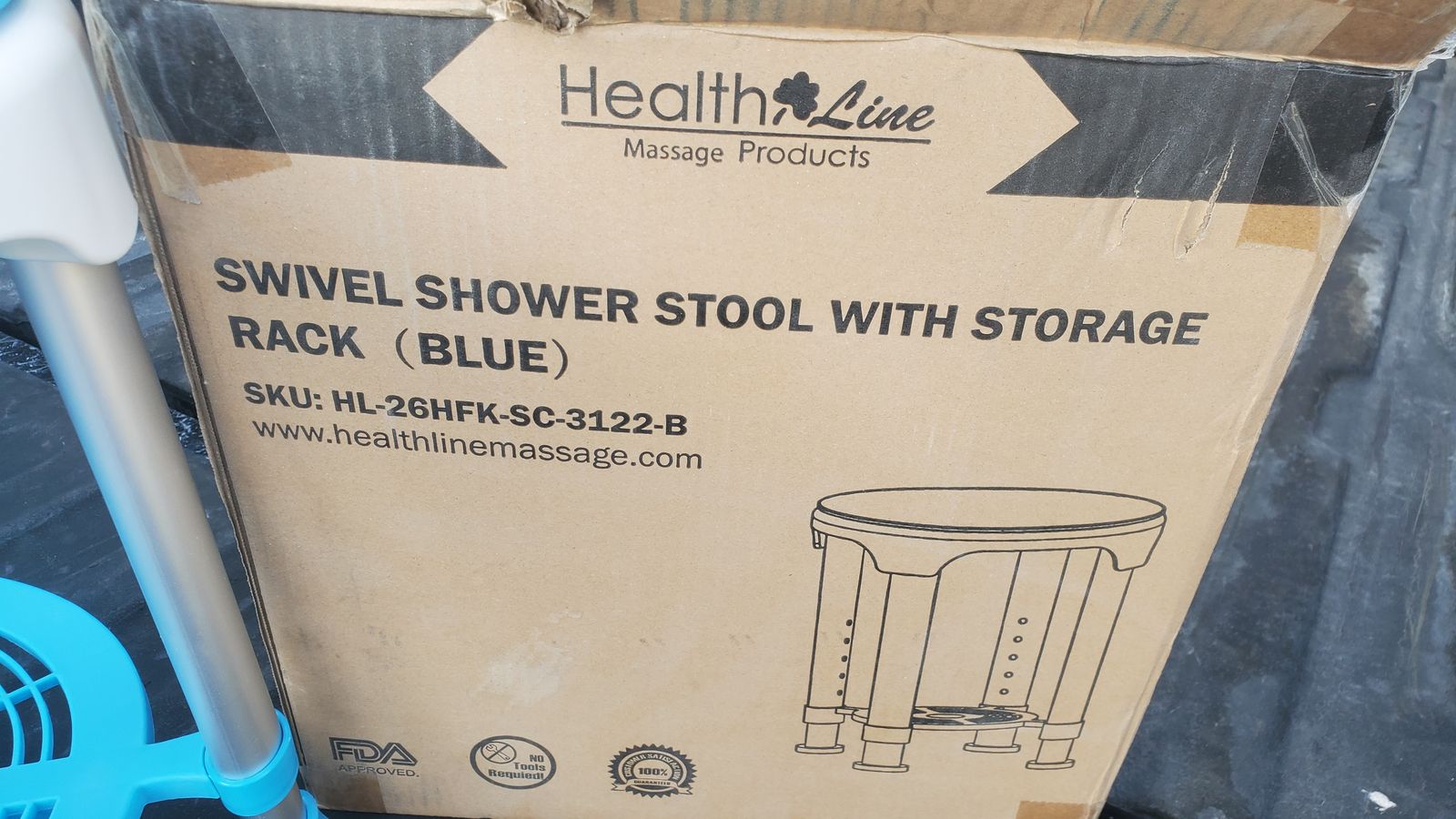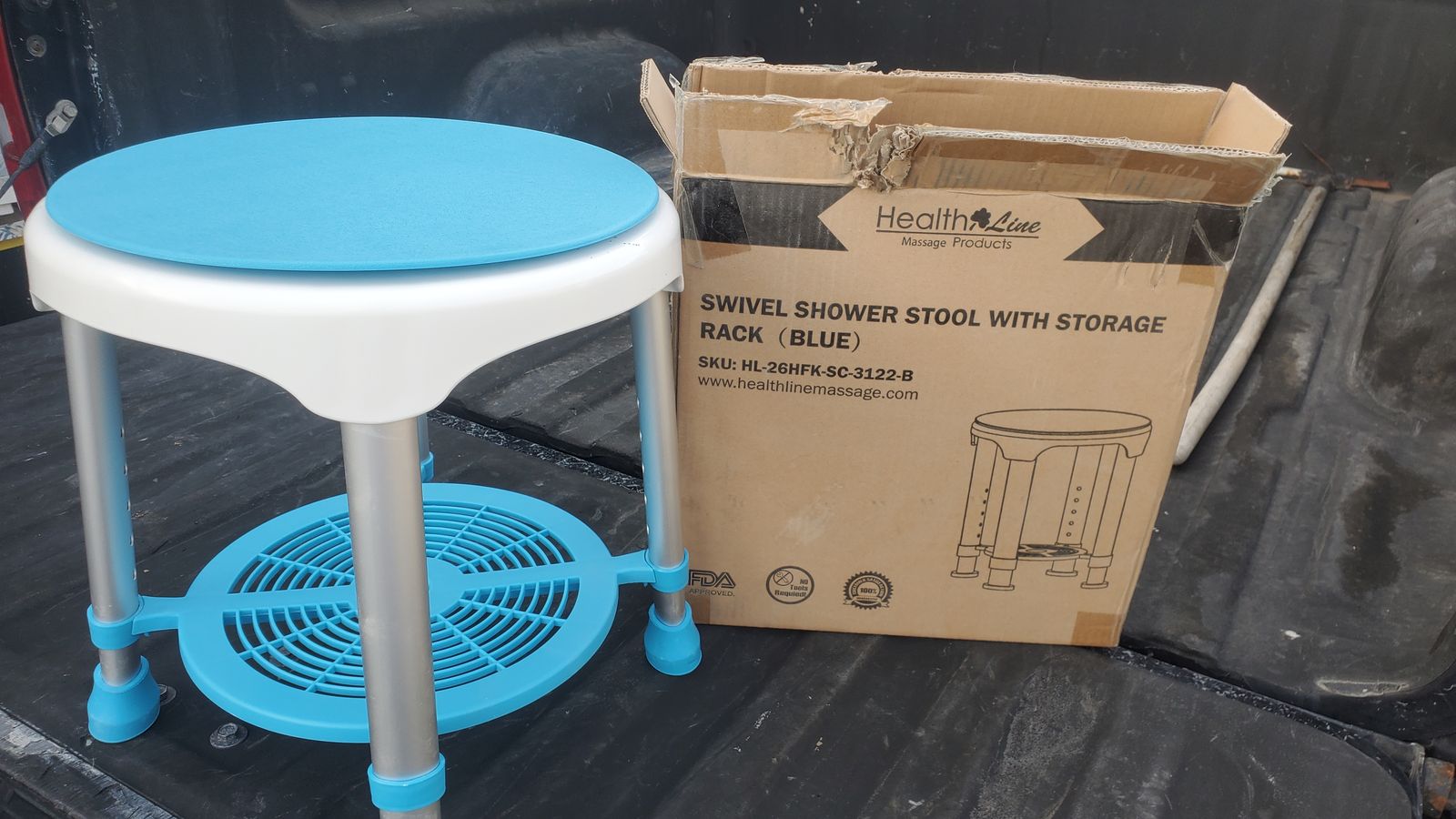 New, in box. Adjustable height, swival seat with storage shelf beneath. Plastic and aluminum. I have multiple.