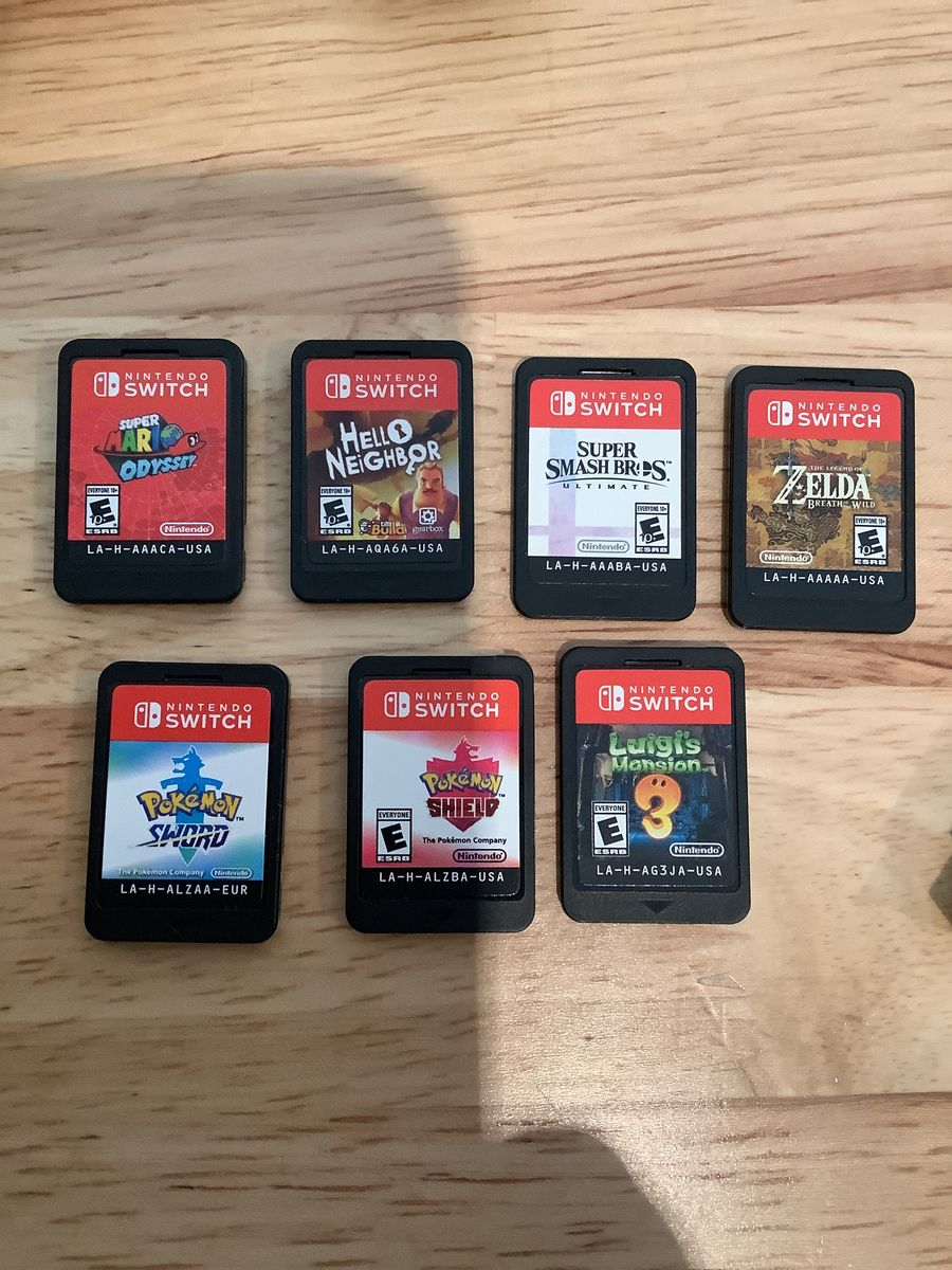 Nintendo Switch 1st Gen Neon Red/Blue 32 GB plus. Like new slightly used! Comes with Gray Case and 7 games. Super Mario Odyssey, Zelda Breath of the wild, Pokémon Sword and Pokémon Shield, Super Smash Bros, Hello Neighbor and Luigi's Mansion 3