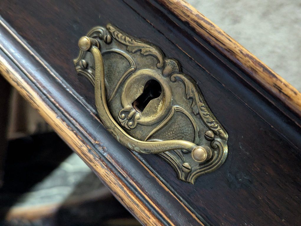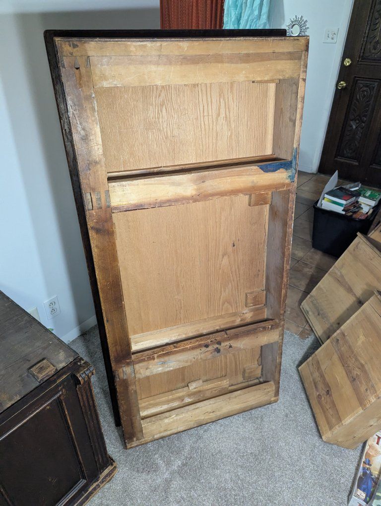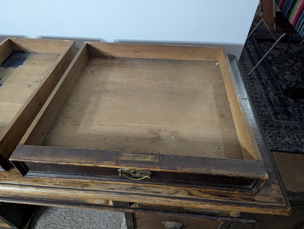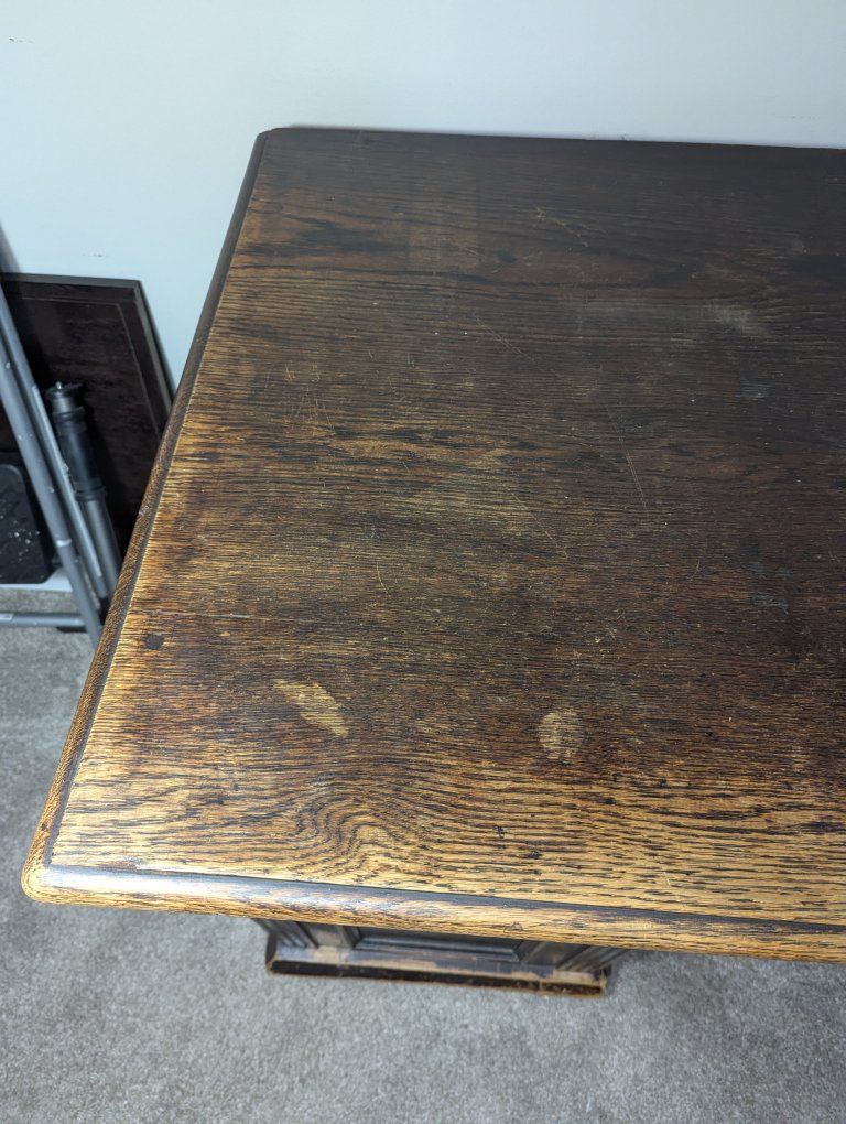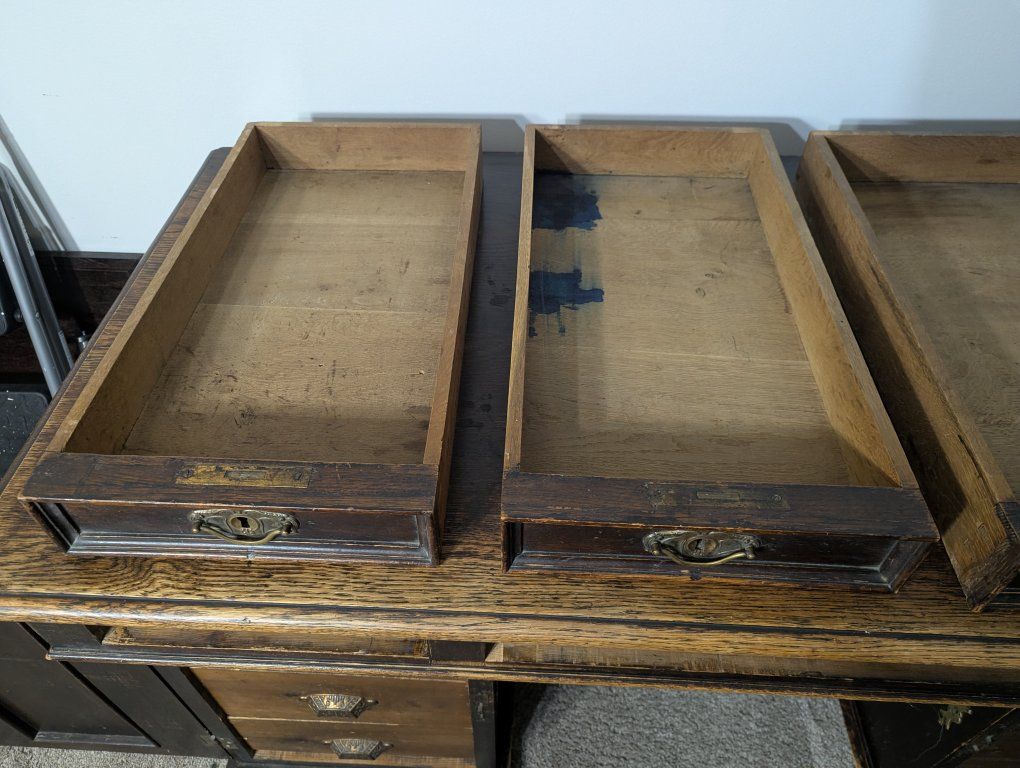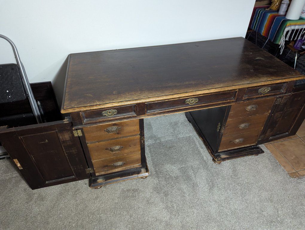 Antique writing desk, well loved, great restoration opportunity. I am not sure of the history of it, but know that my father bought it in Denmark in the 70s. There are some ink stains and a short split across the center, starting on the left side of the top (see pics).
