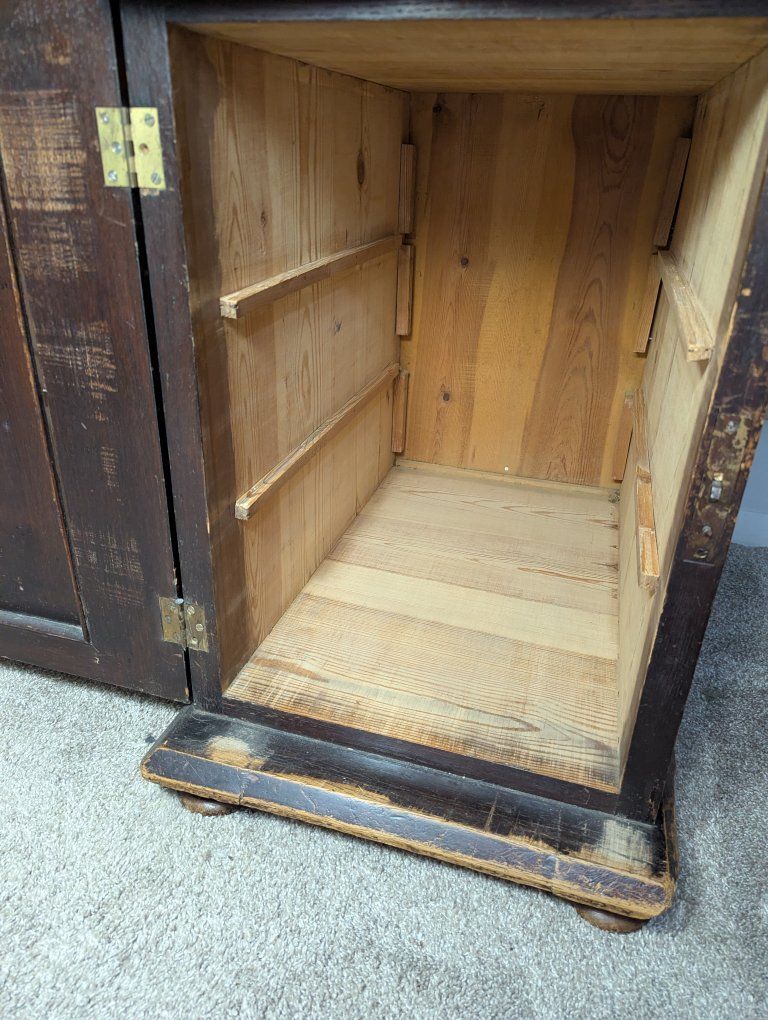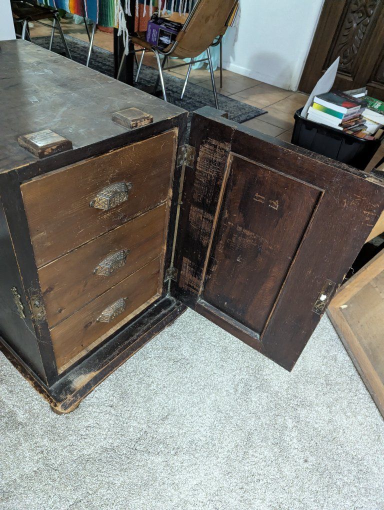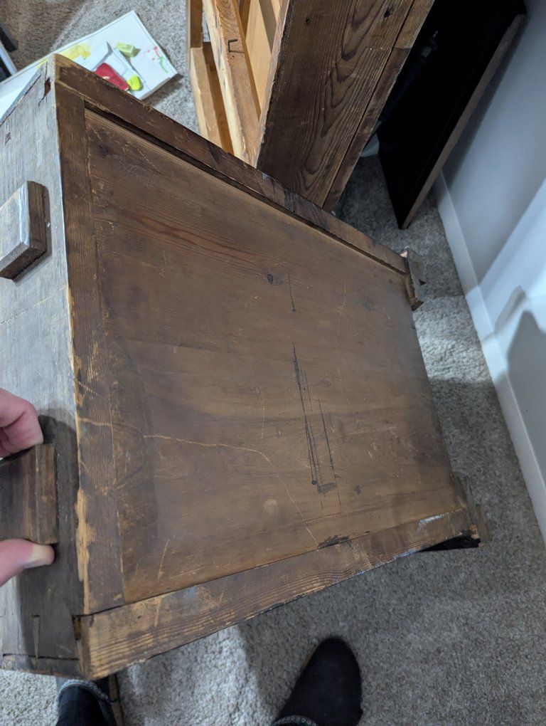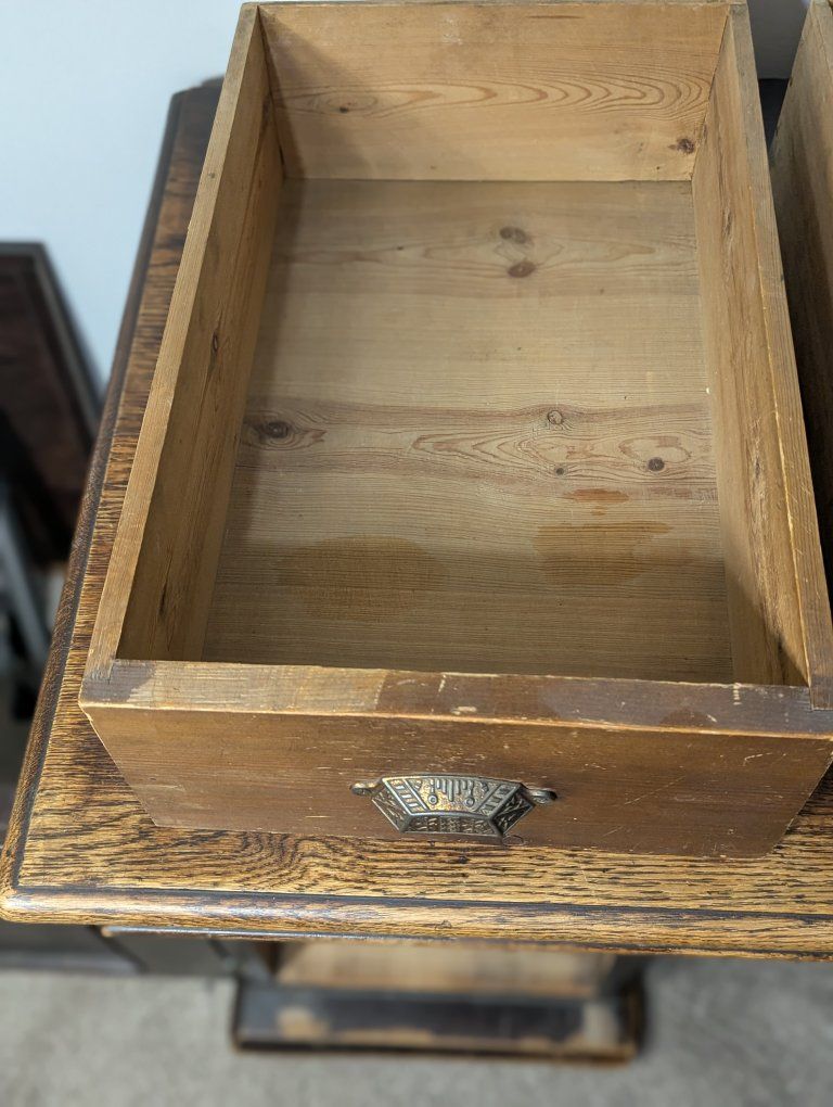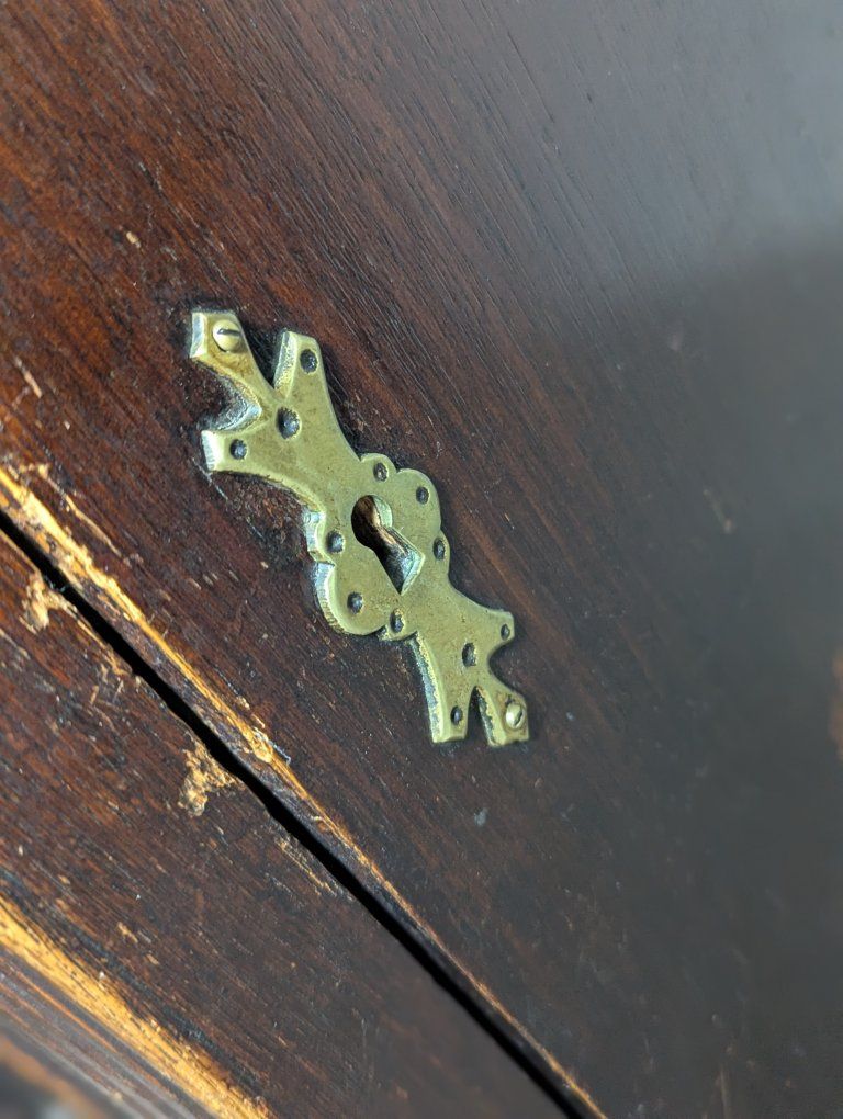 Antique writing desk, well loved, great restoration opportunity. I am not sure of the history of it, but know that my father bought it in Denmark in the 70s. There are some ink stains and a short split across the center, starting on the left side of the top (see pics).