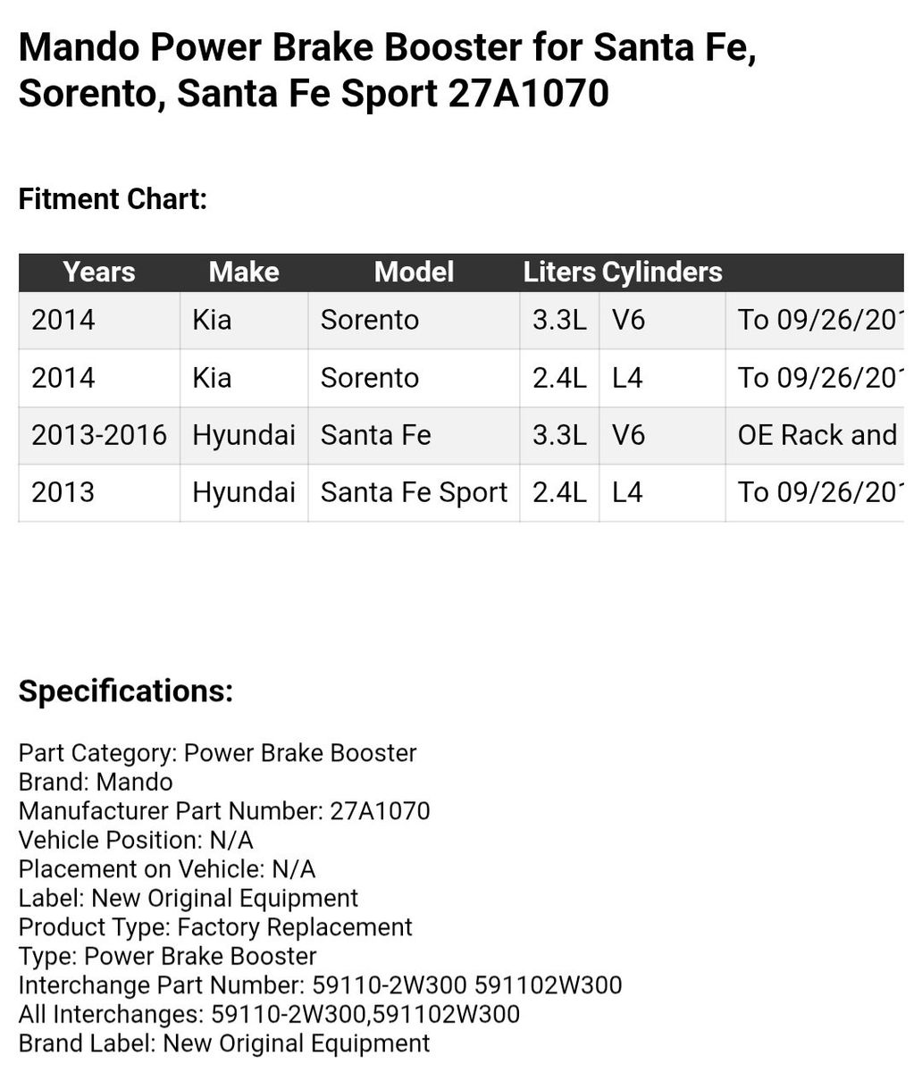Brand New Never Used Mando Power Brake Booster for Santa Fe, Sorento, Santa Fe Sport 27A1070