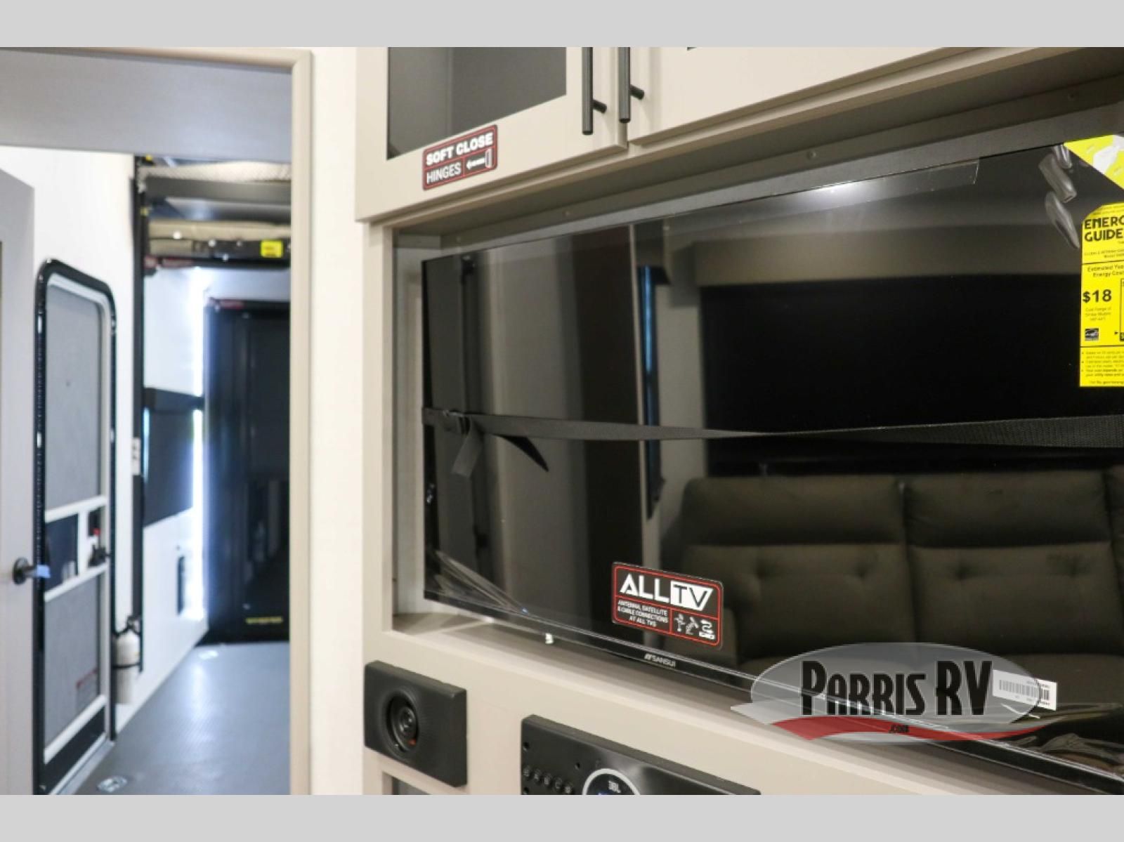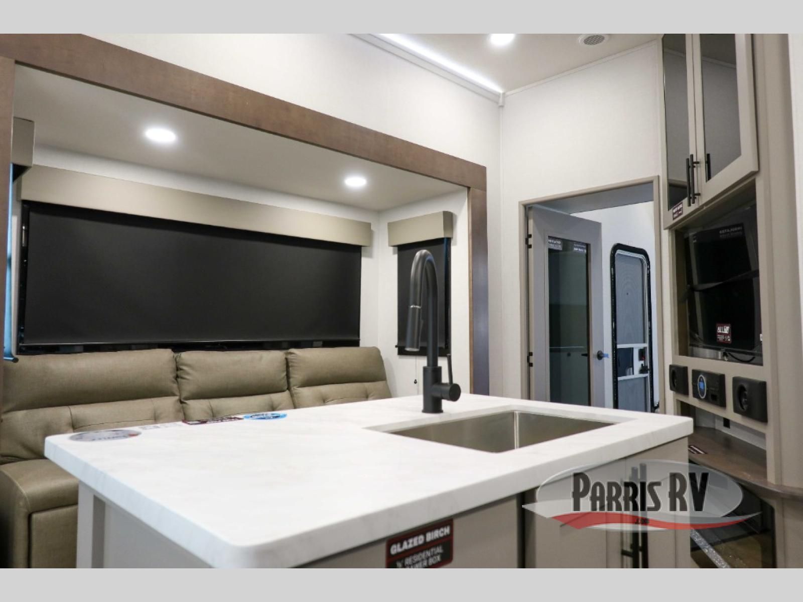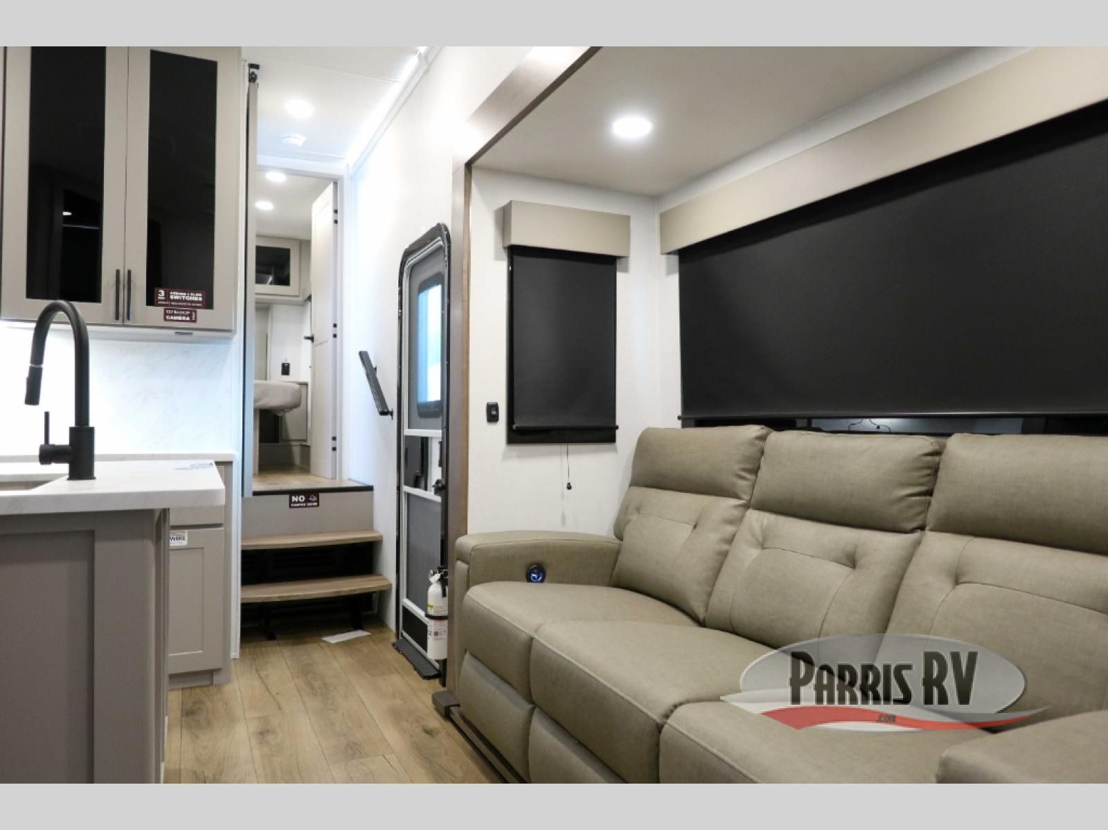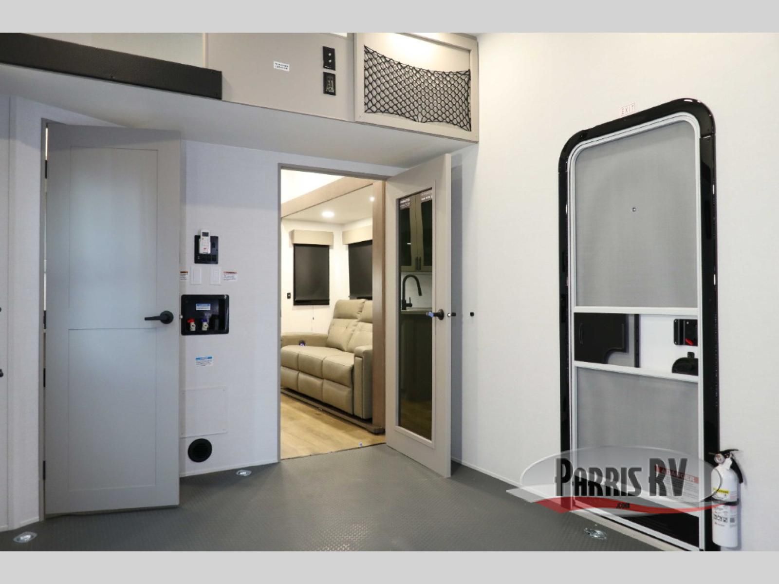 If you're needing more space for your toys, this toy hauler will meet your needs with a 14' separate garage! Once your toys are unloaded using the weather resistant ramp door, relax on the HappiJac roll-over sofas with a folding table in between, and this area can become your guests' bedroom at night since there is a drop-down queen bed, a half bath, plus an additional 30" x 72" bunk/loft bed. You will have the front bedroom all to yourselves that includes a king bed with an optional queen bed plus a wardrobe slide out to keep your space tidy. Everyone can meet in the main living area/kitchen for movie night with the HDTV and sofa slide out, while the chef of makes dinner on the three burner cooktop. There is also a hutch and pantry for storage and a kitchen island for more counter space!