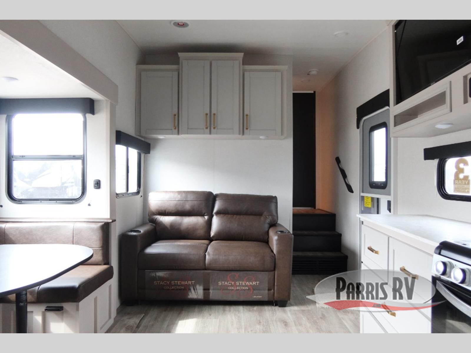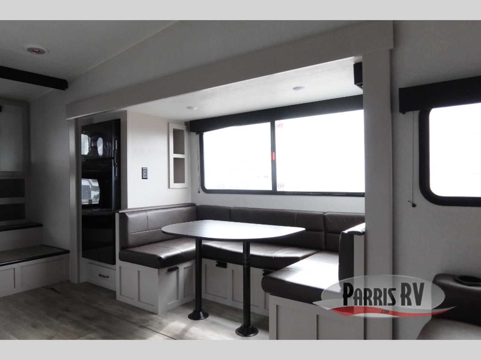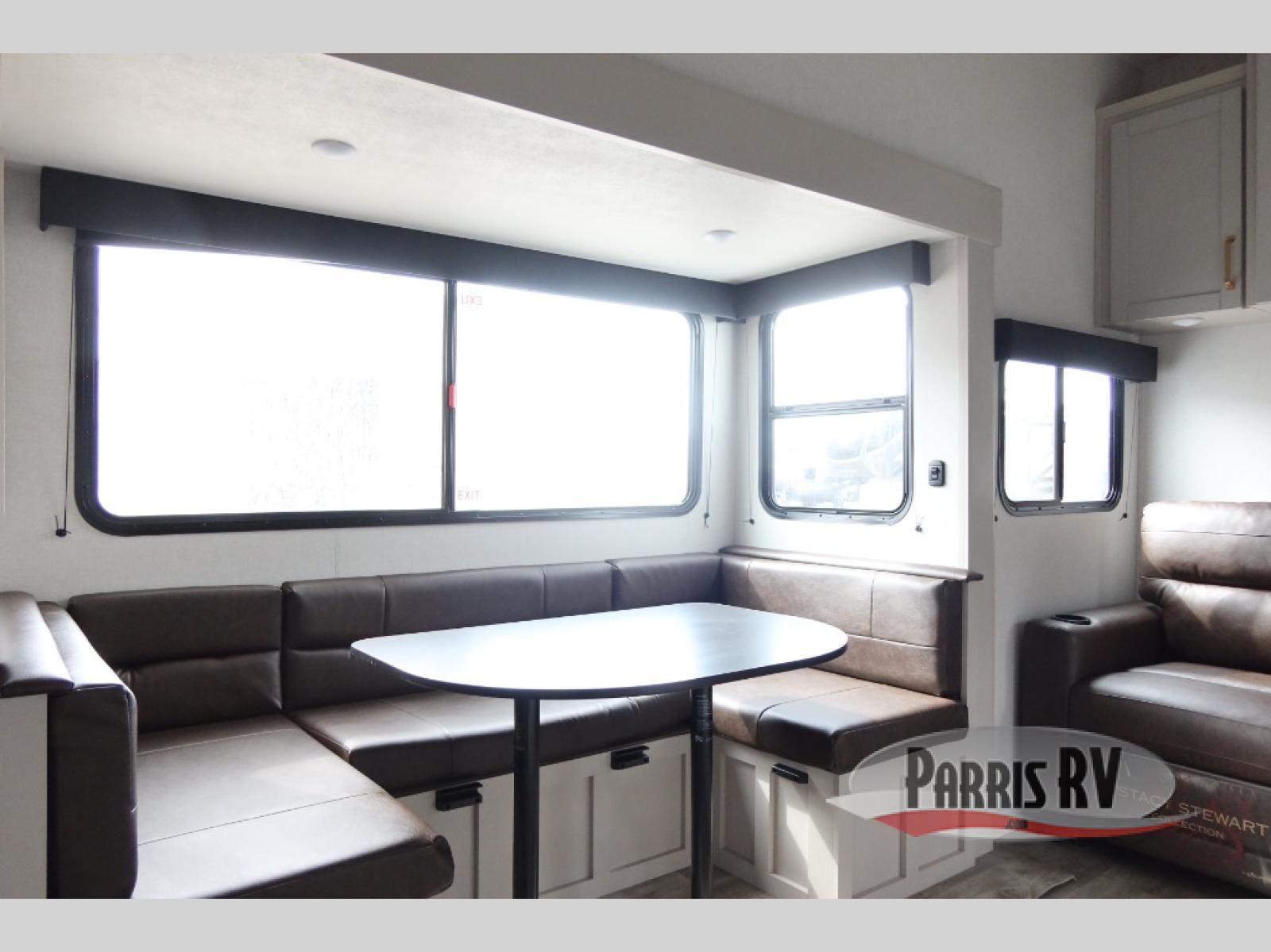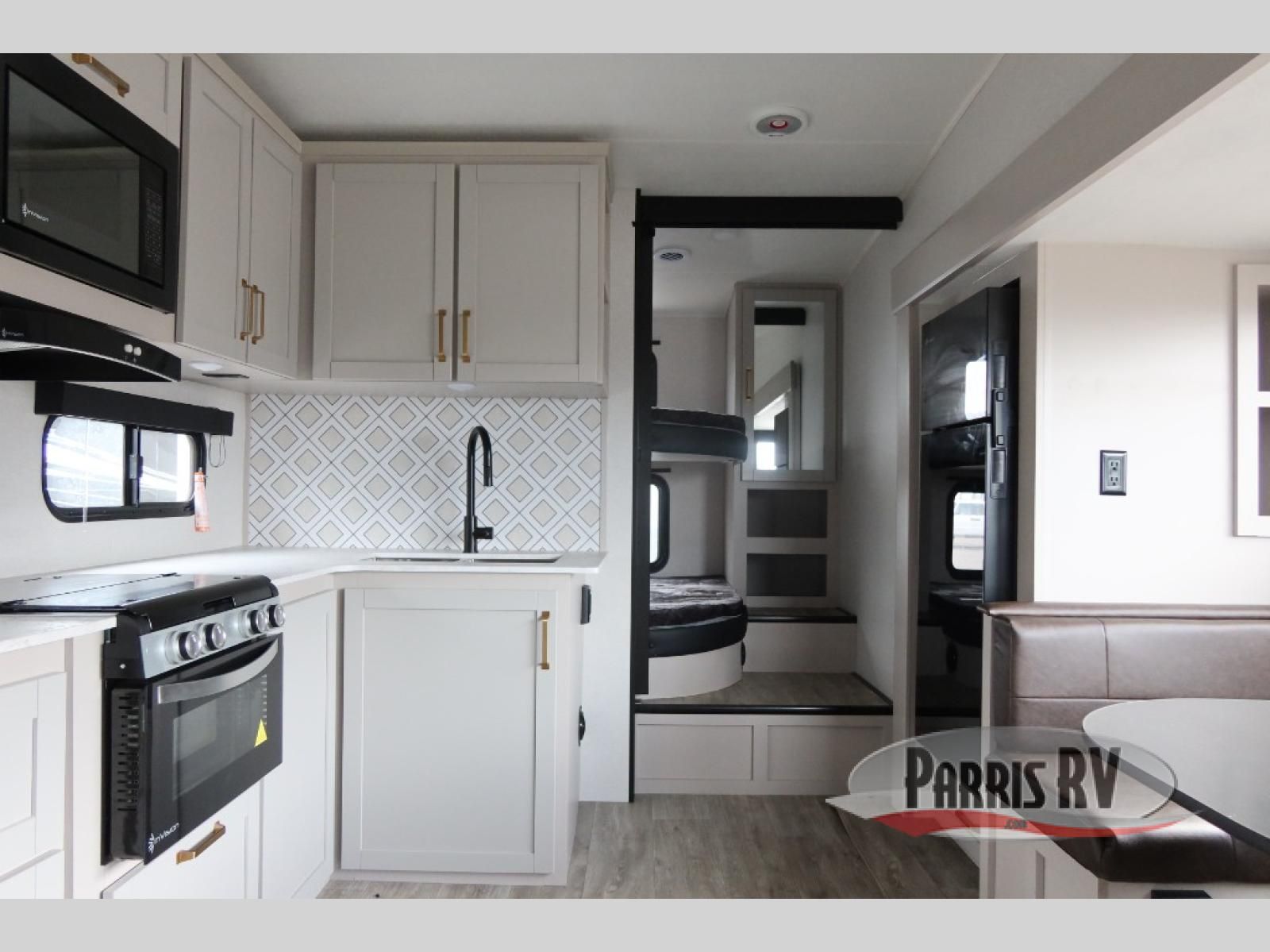 This fifth wheel's spacious interior boasts double-sized bunk beds designed for kids or guests, providing a comfortable sleeping space. A U-shaped dinette that offers ample seating and dining space for meals or even more sleeping space, as well as the 60" tri-fold sofa, which provides additional seating and can be converted into a comfortable sleeping area. In the kitchen area, you will find many amenities to cook delicious meals, such as a microwave, refrigerator, and overhead cabinets that will allow you to keep everything organized. The front bed is spacious, featuring a queen bed ideal for sleeping tight, and the full bath will complete the at-home experience since you will be able to take a refreshing shower on hot days!