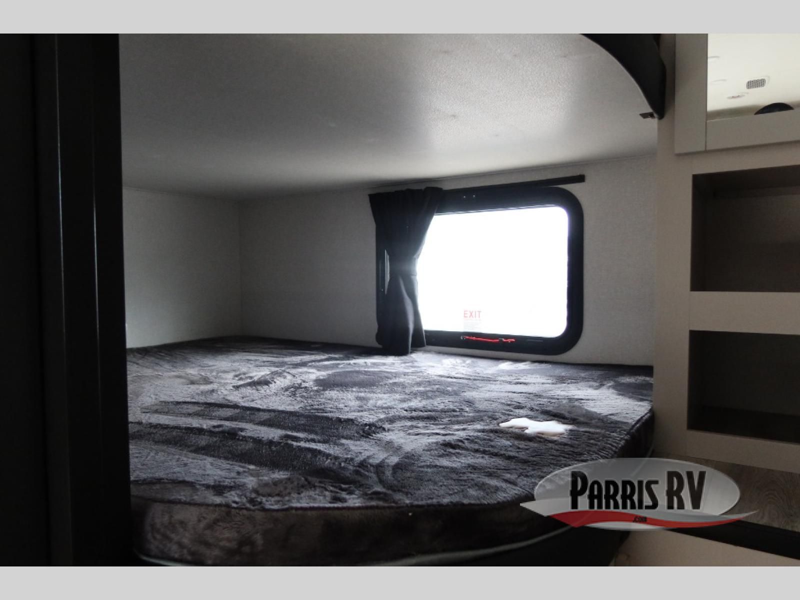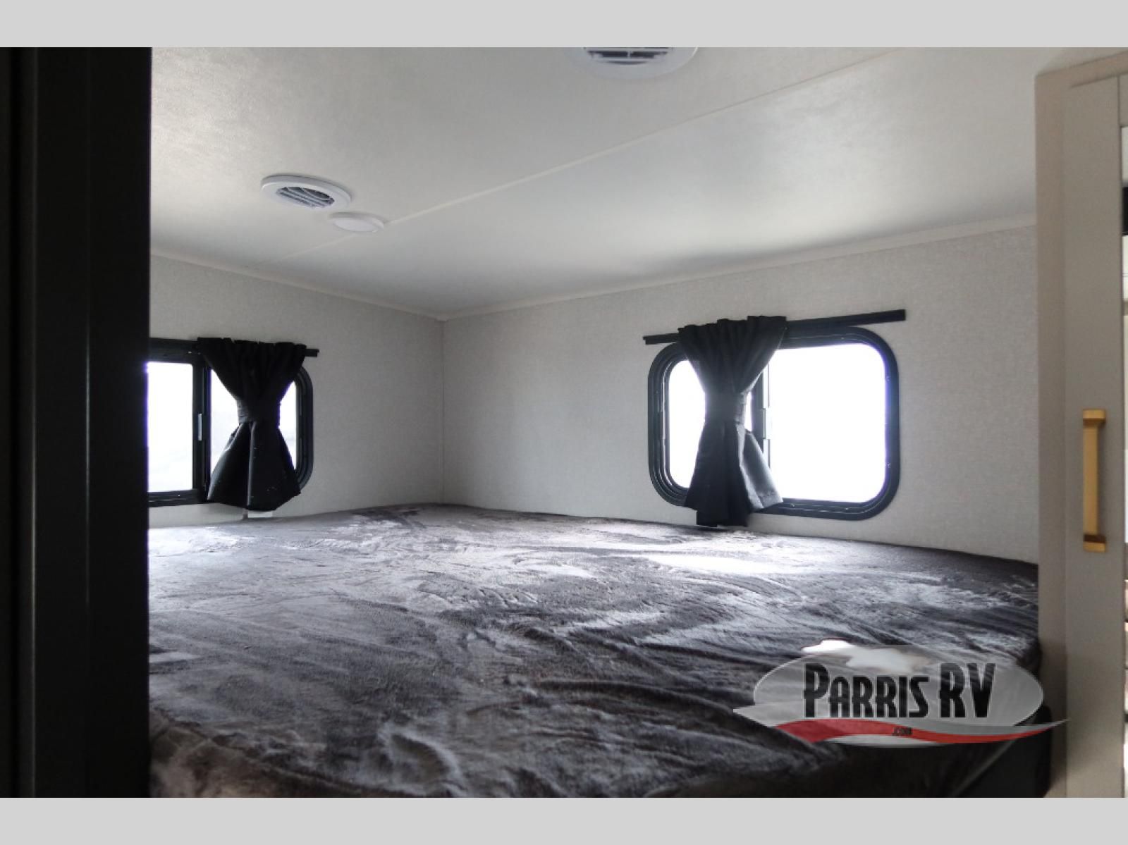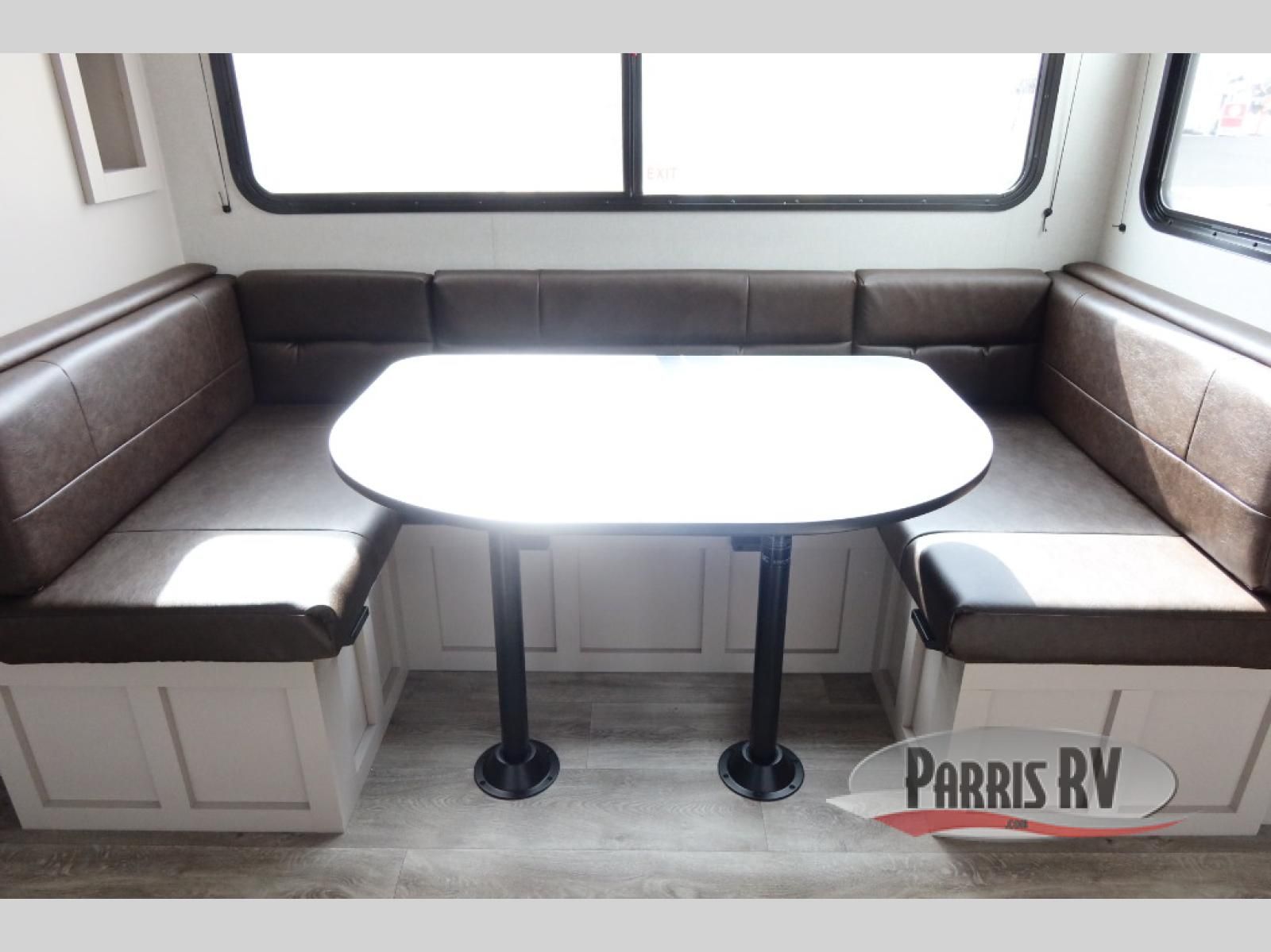 This fifth wheel's spacious interior boasts double-sized bunk beds designed for kids or guests, providing a comfortable sleeping space. A U-shaped dinette that offers ample seating and dining space for meals or even more sleeping space, as well as the 60" tri-fold sofa, which provides additional seating and can be converted into a comfortable sleeping area. In the kitchen area, you will find many amenities to cook delicious meals, such as a microwave, refrigerator, and overhead cabinets that will allow you to keep everything organized. The front bed is spacious, featuring a queen bed ideal for sleeping tight, and the full bath will complete the at-home experience since you will be able to take a refreshing shower on hot days!