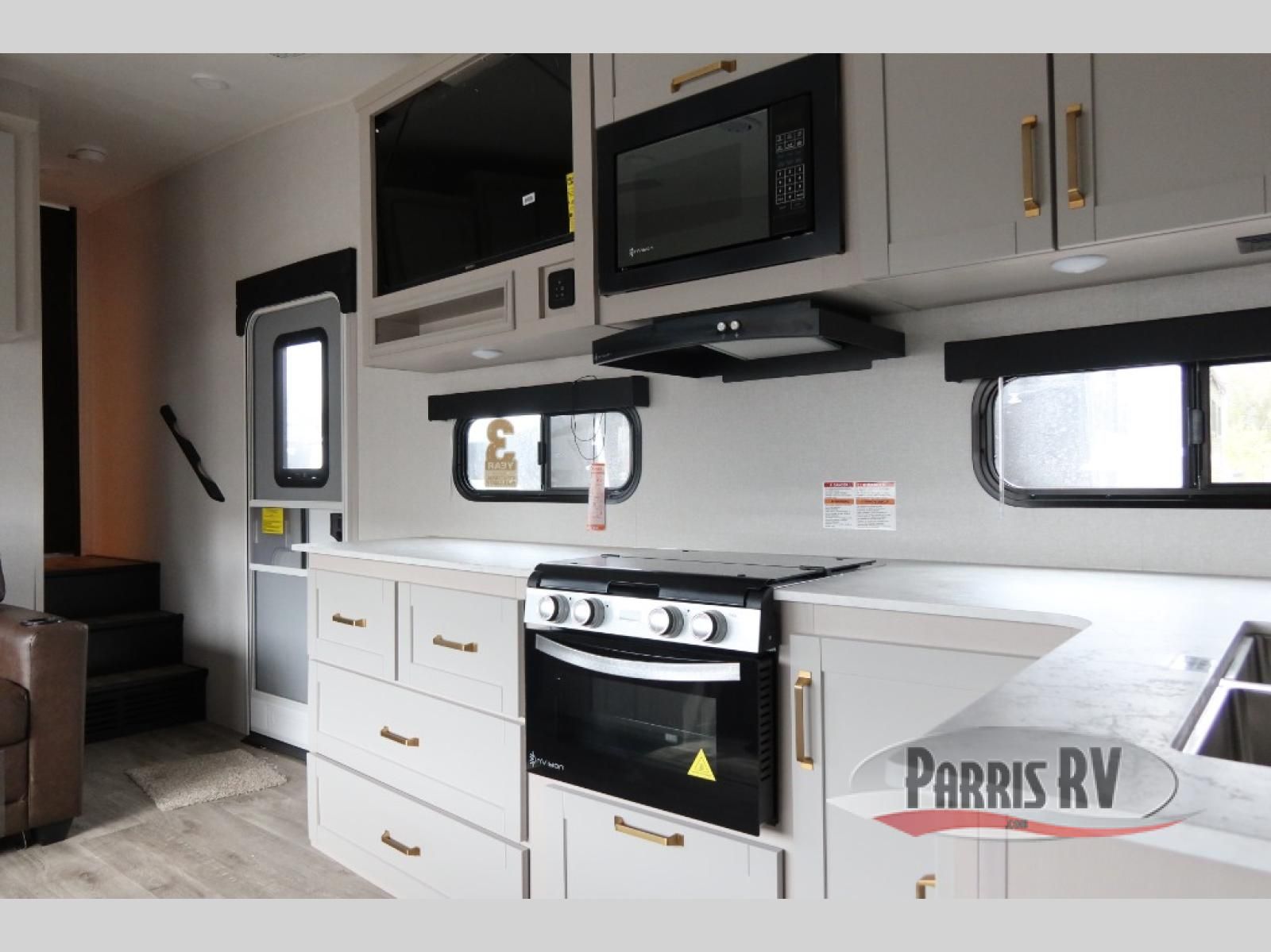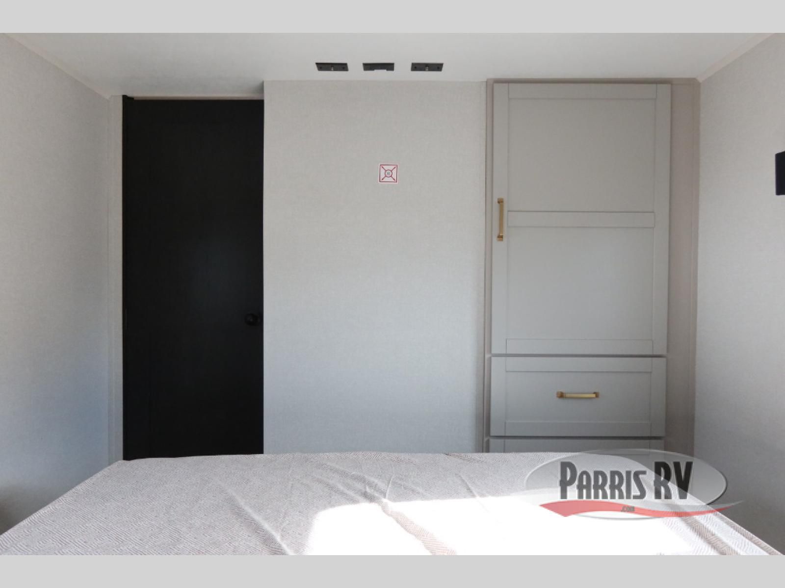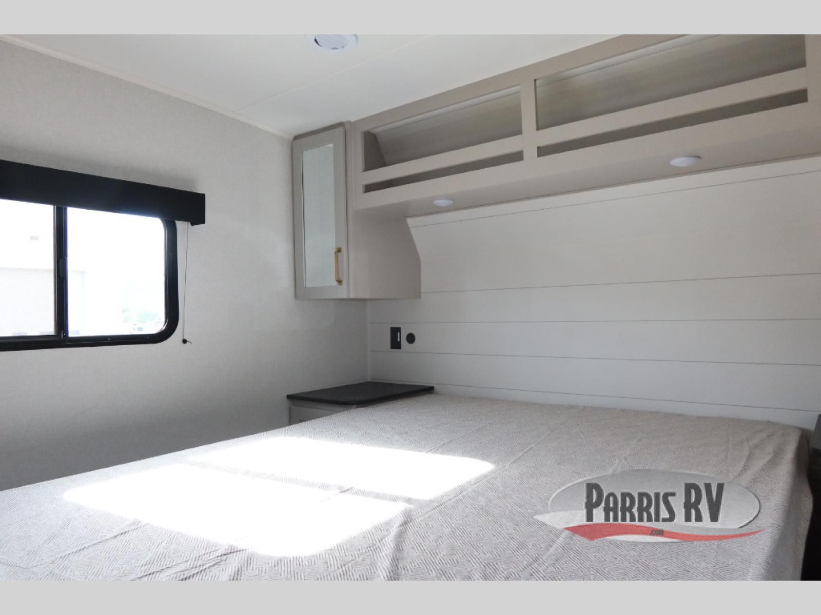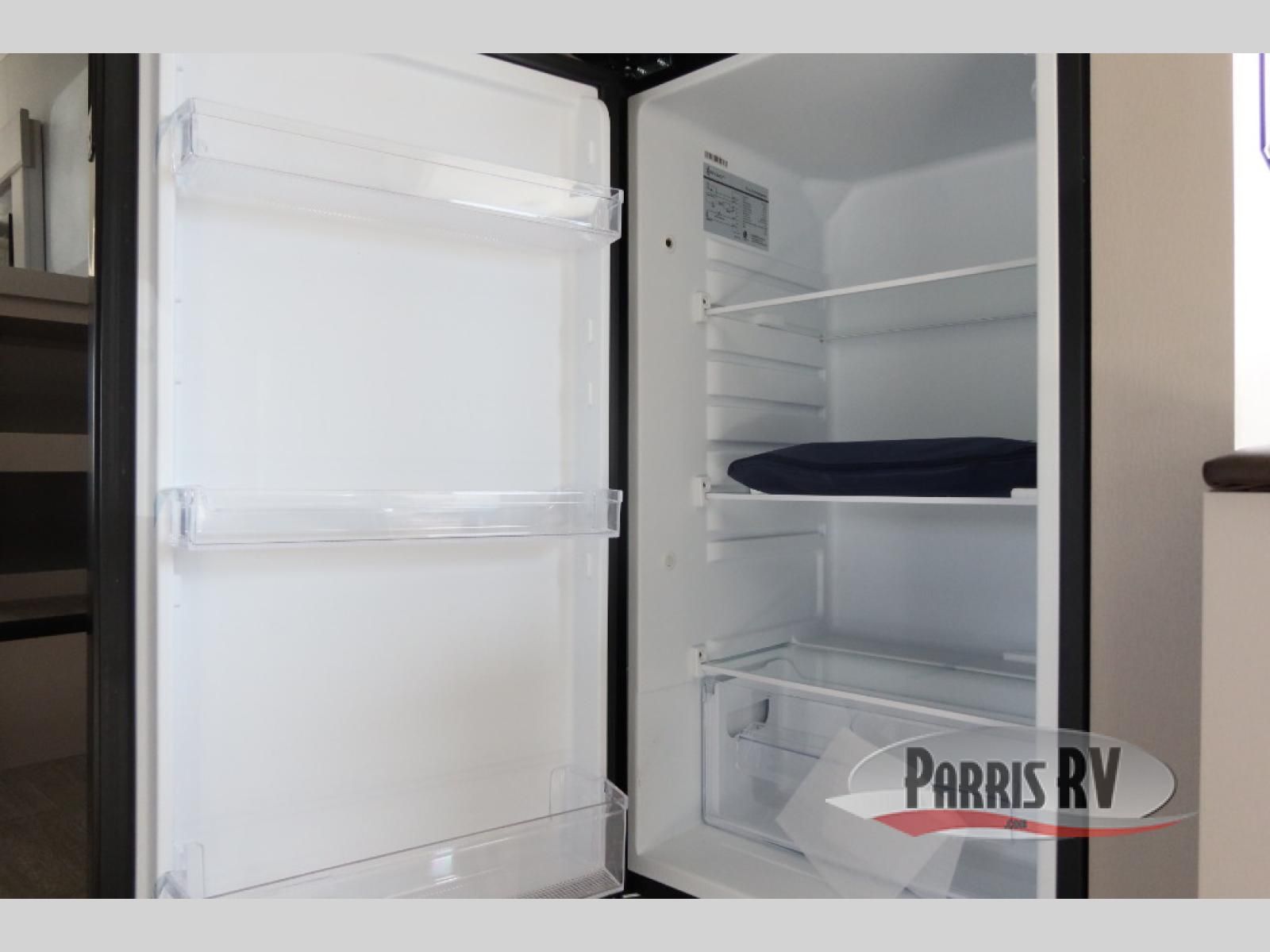 This fifth wheel's spacious interior boasts double-sized bunk beds designed for kids or guests, providing a comfortable sleeping space. A U-shaped dinette that offers ample seating and dining space for meals or even more sleeping space, as well as the 60" tri-fold sofa, which provides additional seating and can be converted into a comfortable sleeping area. In the kitchen area, you will find many amenities to cook delicious meals, such as a microwave, refrigerator, and overhead cabinets that will allow you to keep everything organized. The front bed is spacious, featuring a queen bed ideal for sleeping tight, and the full bath will complete the at-home experience since you will be able to take a refreshing shower on hot days!
