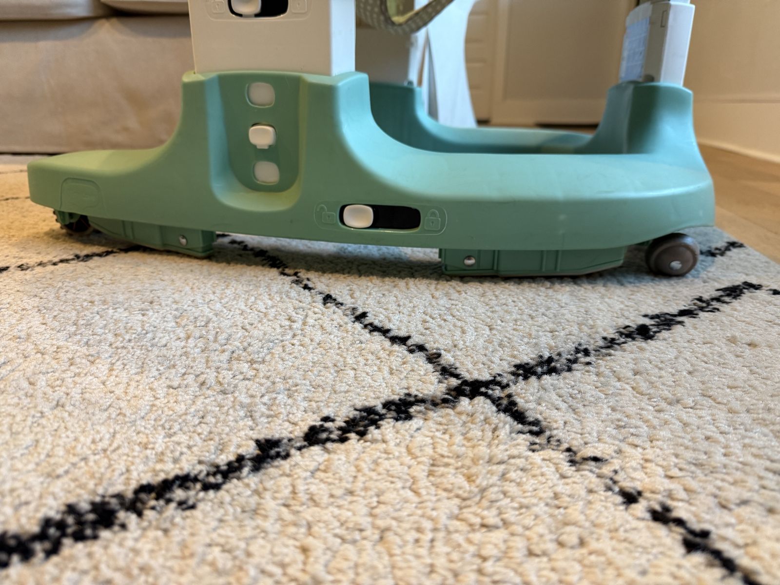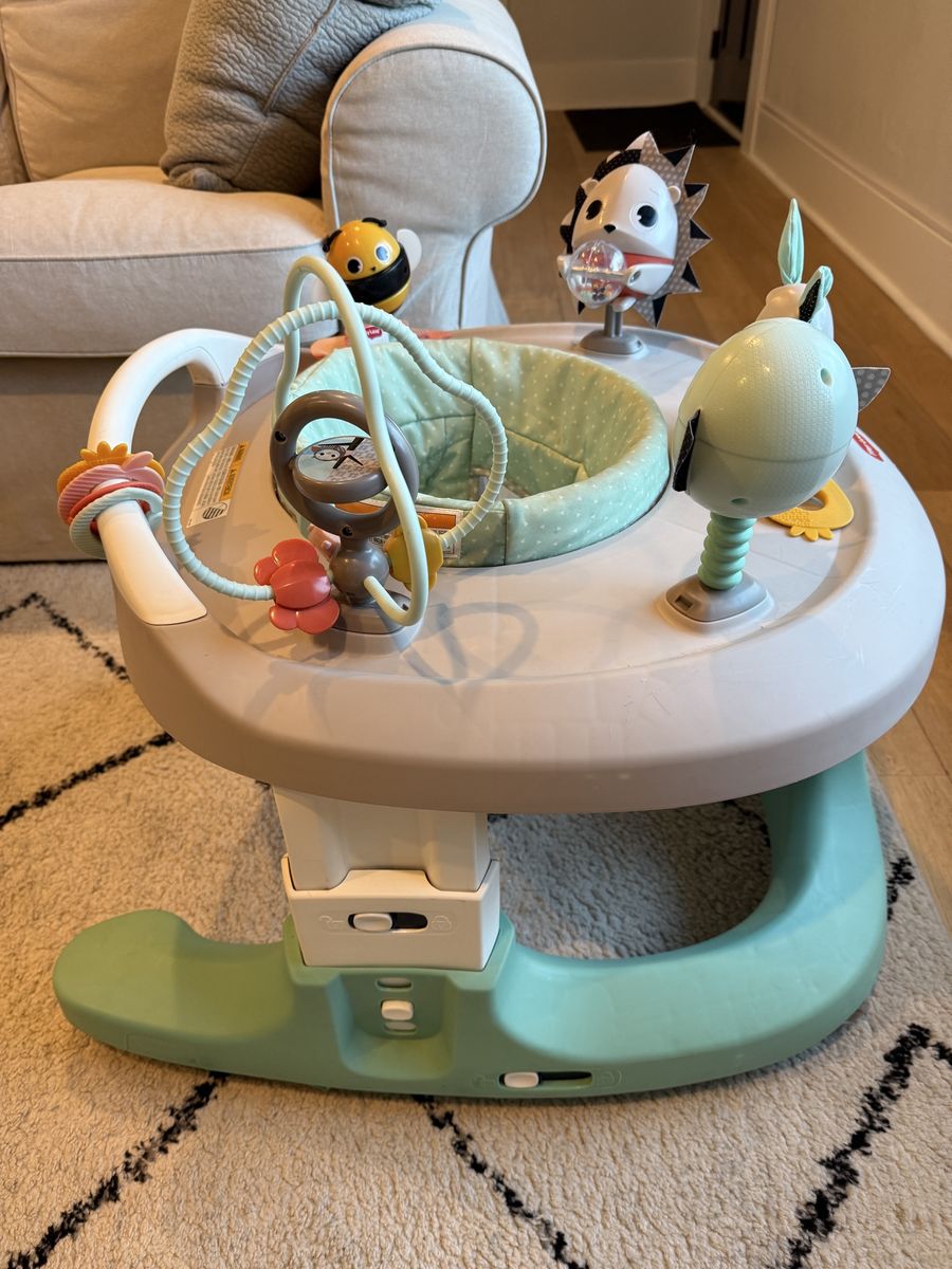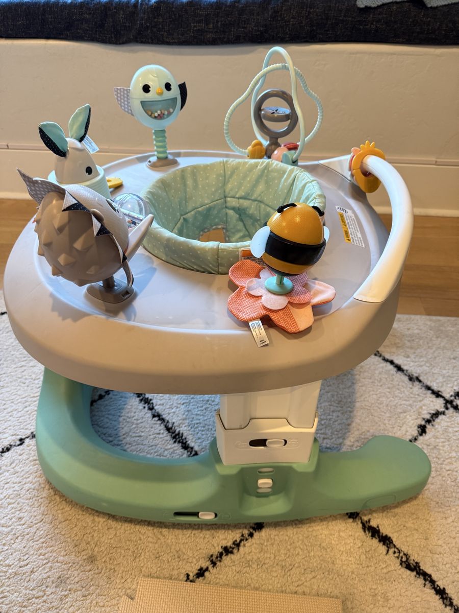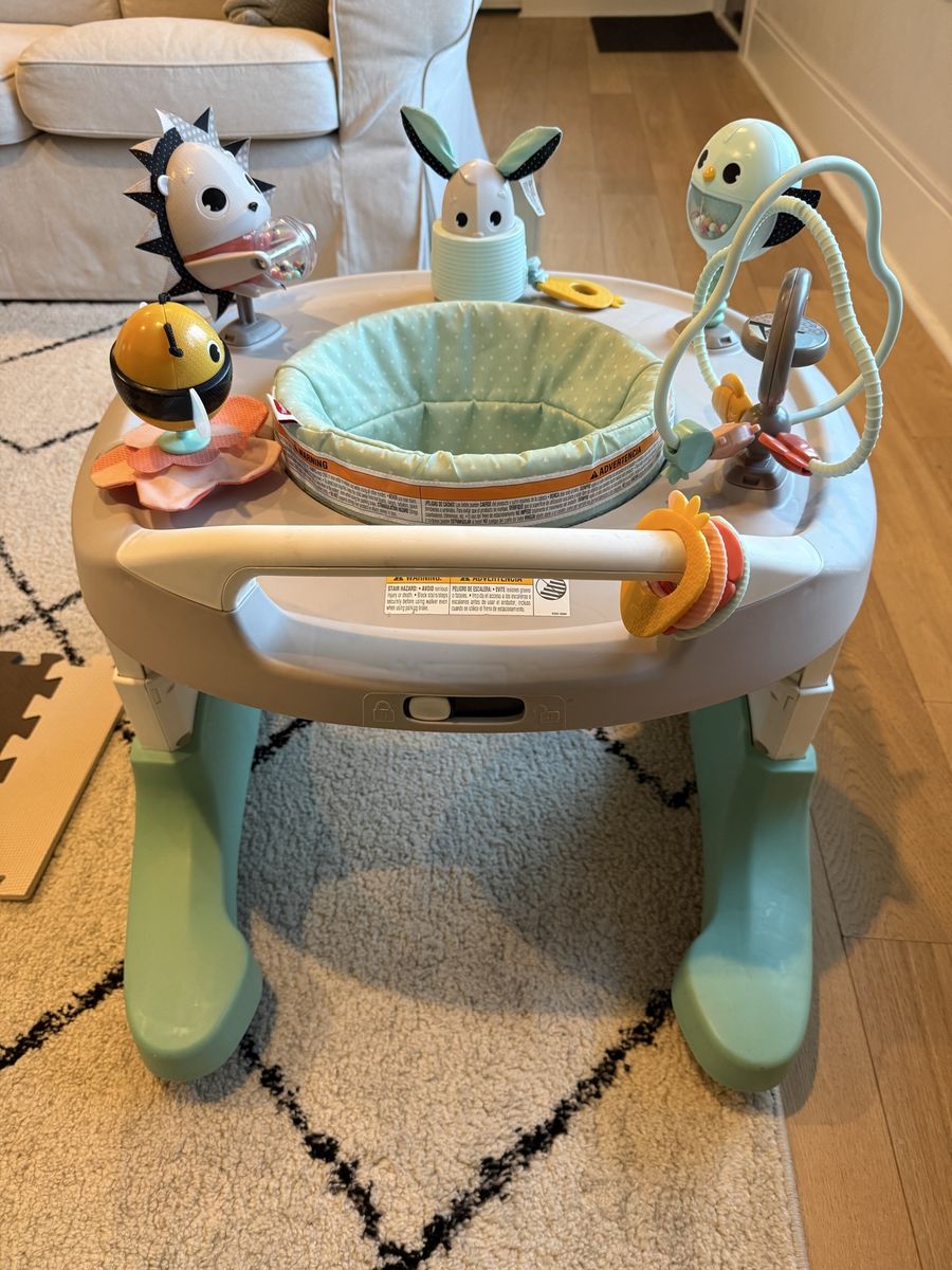 Clean activity center for baby. This Tiny Love 4-in-1 Here I Grow has a bunch of fun toys like a bird, hedgehog, bunny, and a bee. Seat rotates 360 degrees so baby can reach all the toys.
