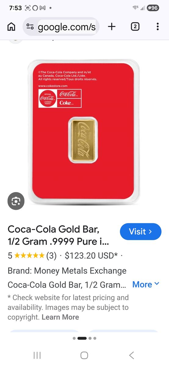 VenmoCoca-Cola Gold Bar, 1/2 Gram .9999 Pure in Assay Package