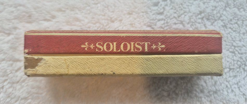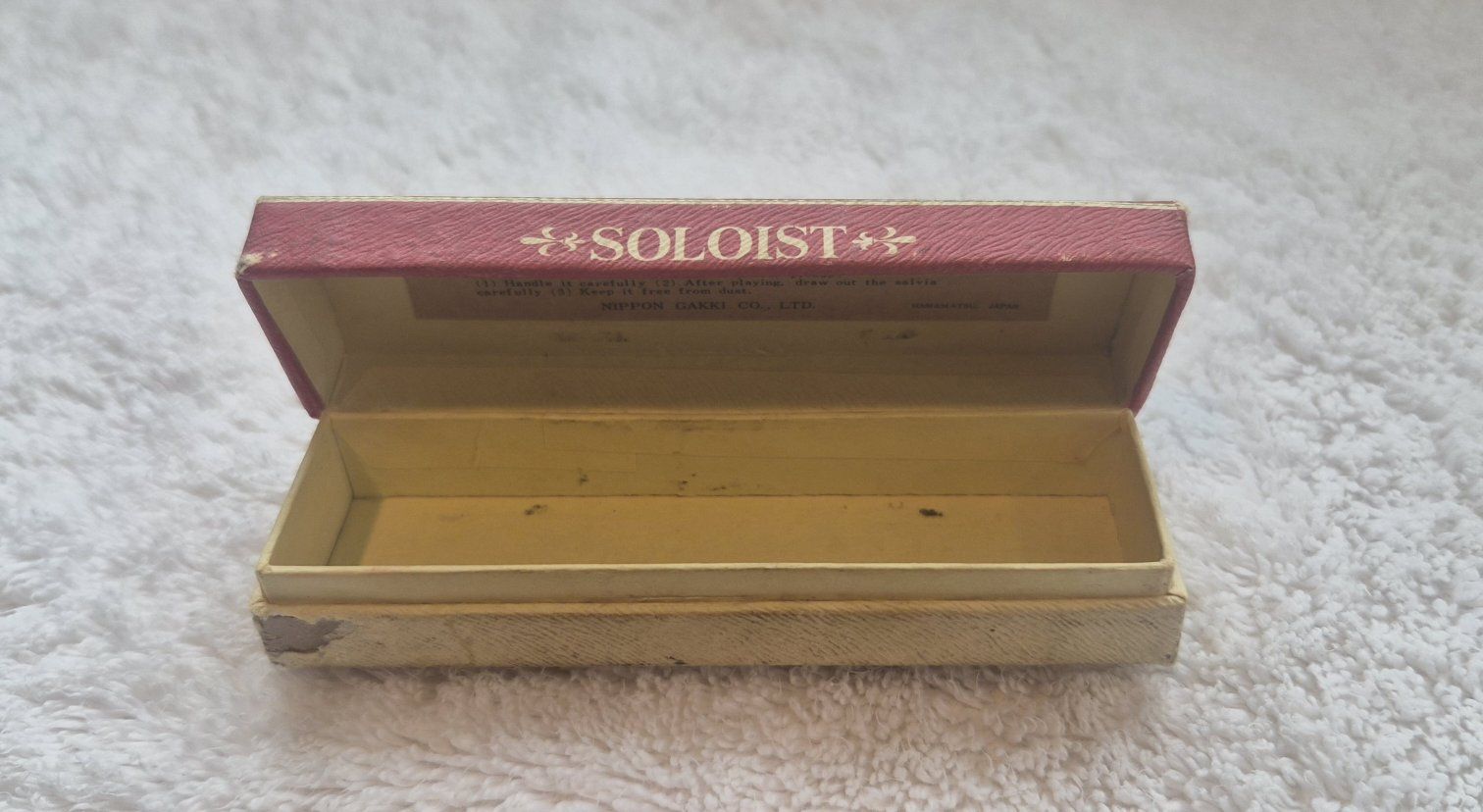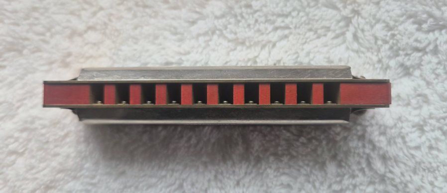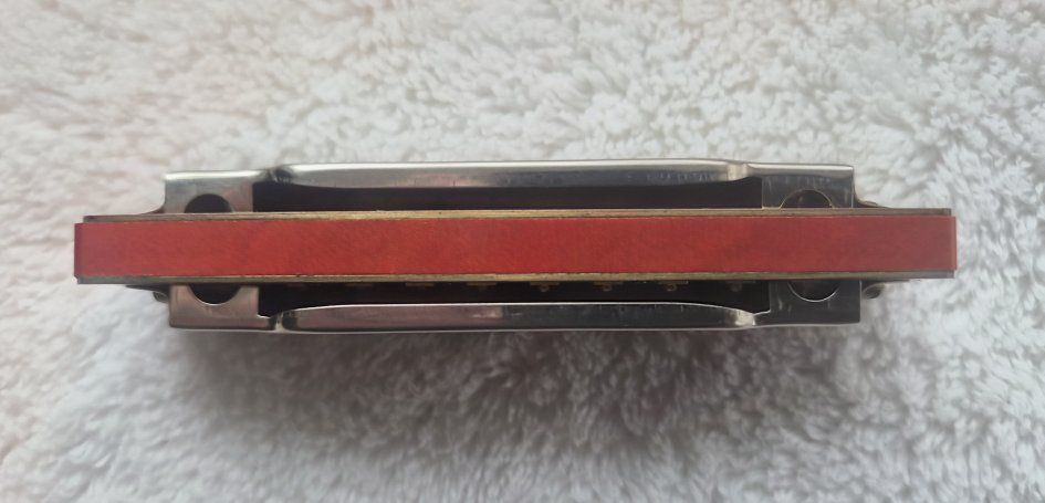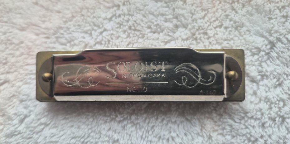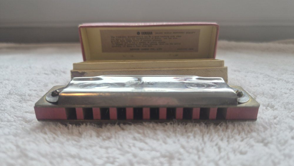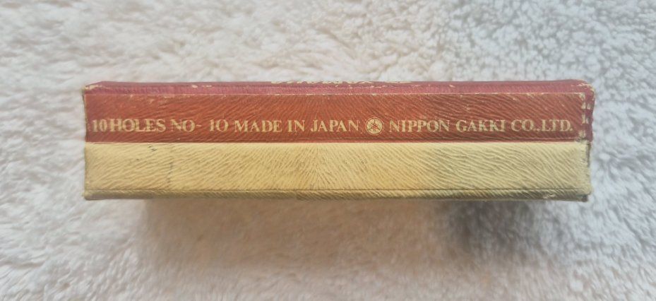VenmoFor sale, is a harmonica made by Nippon Gakki Co., Ltd. (Yamaha) in Japan, undetermined date. It is a Soloist Model No. 10 in the key of C, with 10 single holes and 20 reeds. It is in excellent condition. This harmonica has a red-stained wood comb with metal cover plates attached to the top and bottom with screws. The original cardboard box is included.