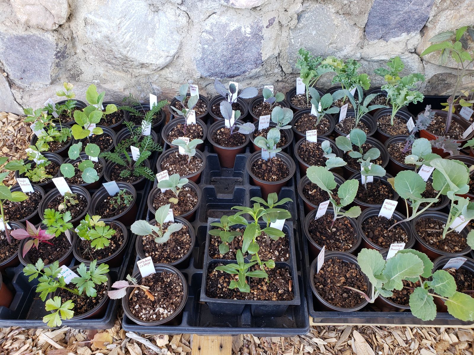 There is celery, egg plant, tomato, pepper, cabbage, broccoli, brussles sprouts, yarrow, and a few flowers and herbs.