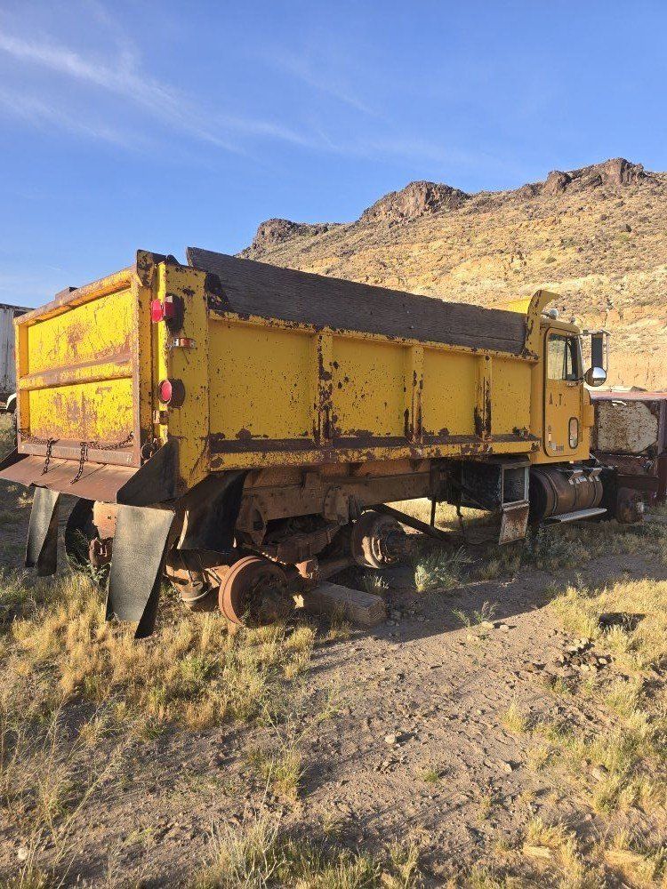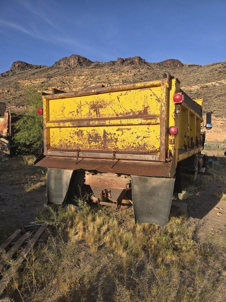 VenmoDump bed for a dumptruck. It measures 13 ft long and is 32" tall below the side boards. The truck frame that it's sitting on is a 1976 International model F4370. The engine and transmission were taken out already. The cab, frame, both drive axles, the front end, all the springs, the cab, hood, doors, radiator, fuel tank, battery box, bumper, hydraulic pump, and hydraulic ram are still there. I am selling the entire thing but if you only want the bed I will remove it for no additional cost.