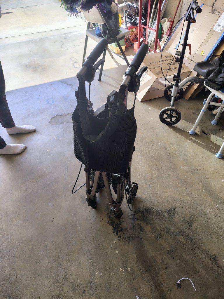 VenmoPortable folding walker has built-in padded seat and backrest for comfort. Metal frame is dark grey with black mesh storage bag underneath. Four wheels and hand brakes provide stability and control. Folds up easily for transport or storage.