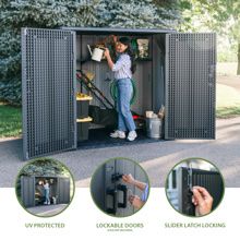 Phone Orders Welcome Open Monday- Saturday 9:30AM-7PM Limited Quantities Ask about Factory Seconds for even more savings! Ask About Install pricing Description: Decluttering your garage and maintaining your yard can be a challenging job. Between all the tools for the upkeep of your yard and the different objects taking up valuable space in your garage, you need the right solution to keep everything organized. The Lifetime Utility Shed is a mid-sized storage solution for households in need of extra storage space. It is large enough for residential garbage containers, lawn mowers, and bikes, but also equipped with shelving and removable wall hooks for smaller items such hand tools, power cords, shovels, and rakes. The double-hinged doors fully open making it convenient to move items in and out of the shed. The slider lock and deadbolts (lock not included) allow you to keep your belongings safe and secure. With the Lifetime Utility Shed, you can free up valuable space in your garage and keep outdoor equipment organized. This shed comes in two-tone gray. Located at the Lifetime Store in Draper 421 West 12300 South Draper, UT 84020 801-571-1798