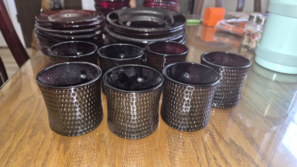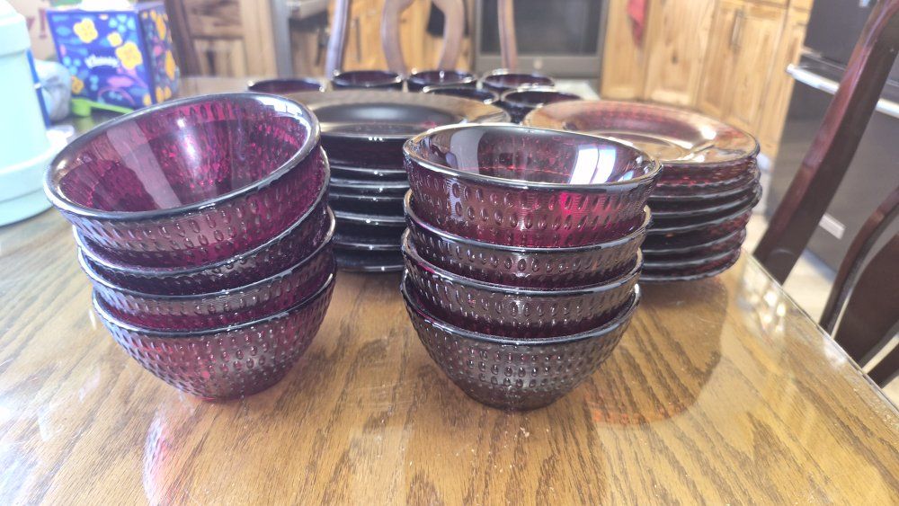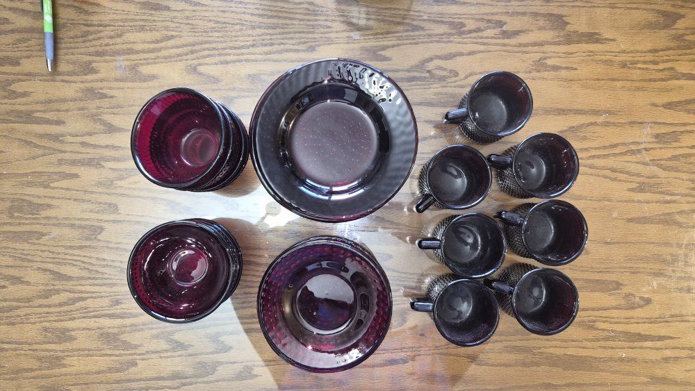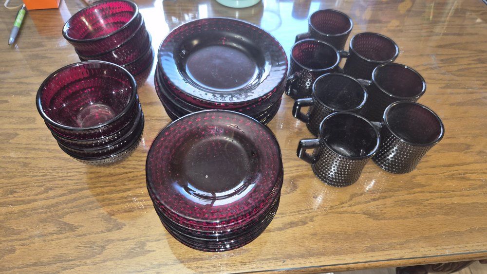 VenmoVintage ruby red Hobnail glass dinnerware. These items are part of the "Vercors" pattern produced by the French company Arcoroc in the 1960s.