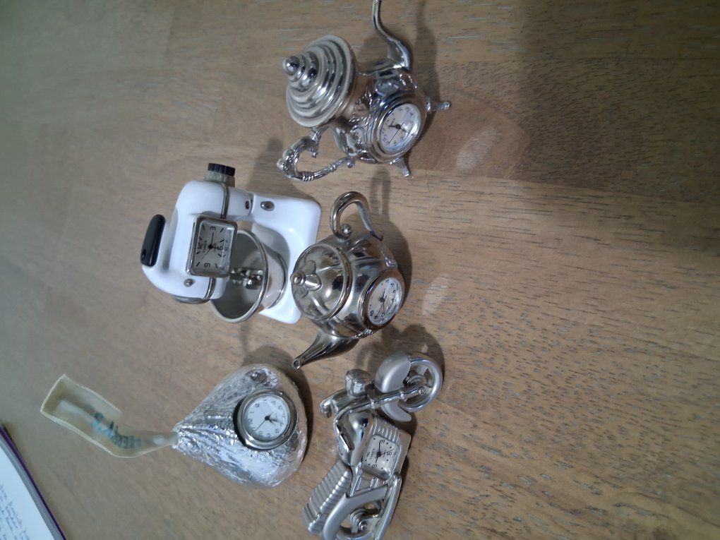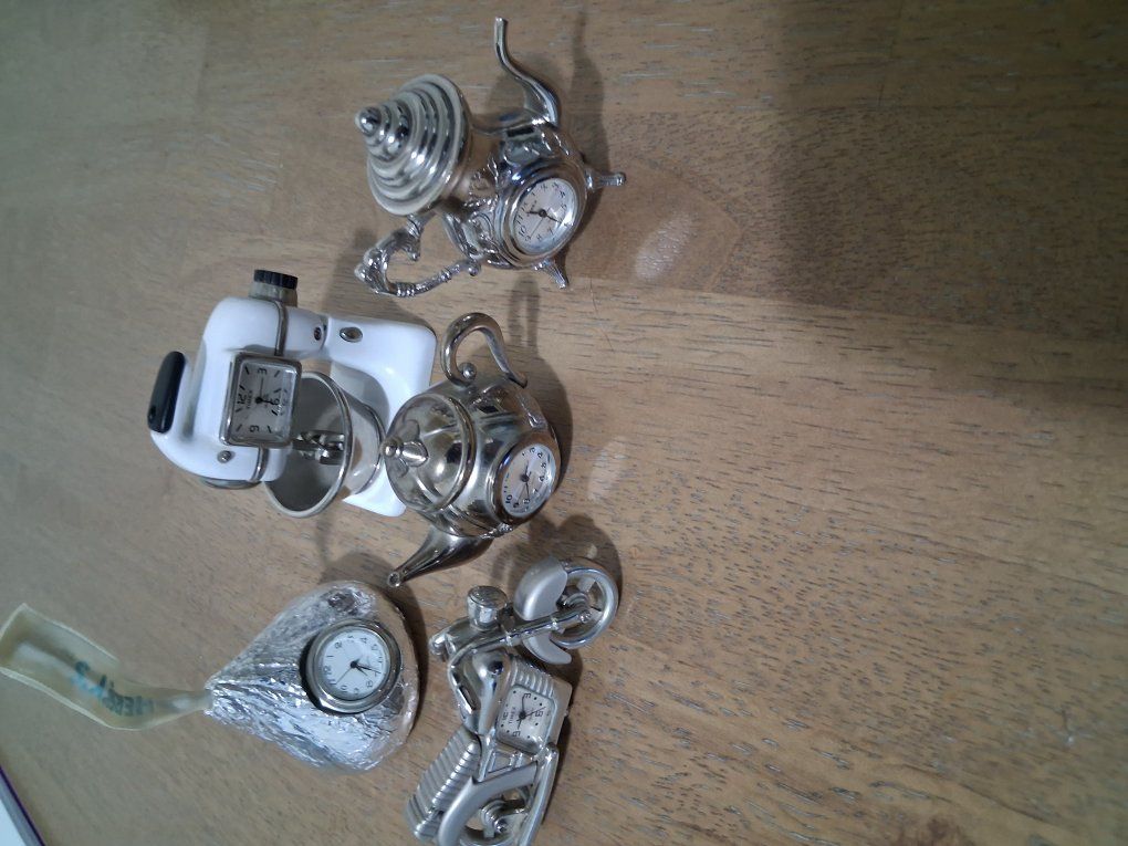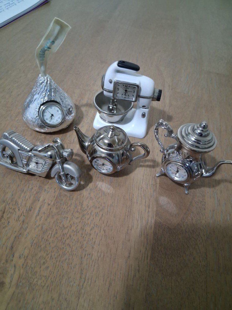 Clocks minature 3 by Timex and 2 quartz brand movement. All have metal bodies and use small watch batteries.all need new battery. the mixer head tilts and motorcycle wheels and handlebars move. set of 5 each
