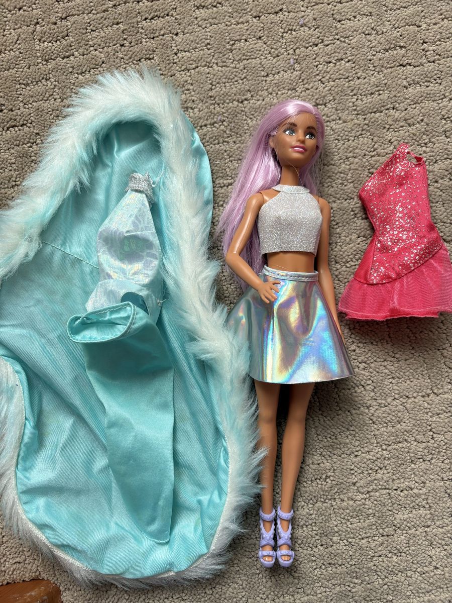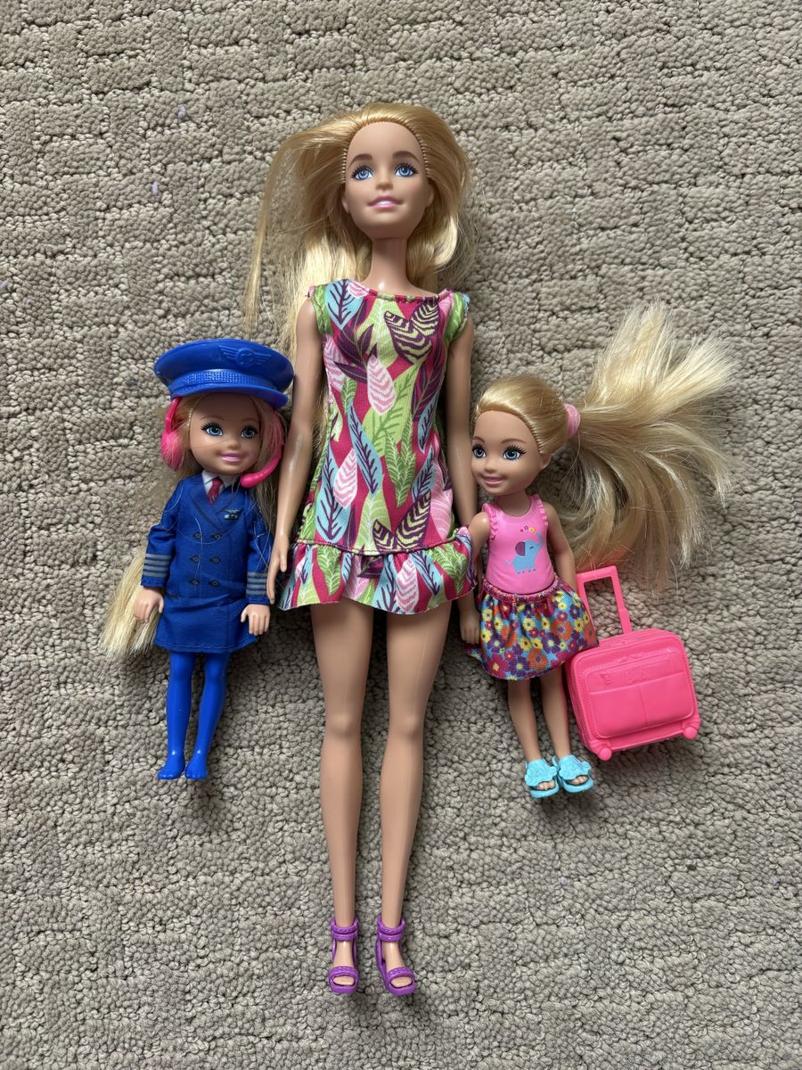 Mermaid Barbie lights up. Travel Barbie set . Performer Barbie also includes a mic. All were hardly played with and need a child to play with them.