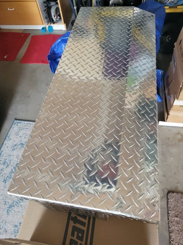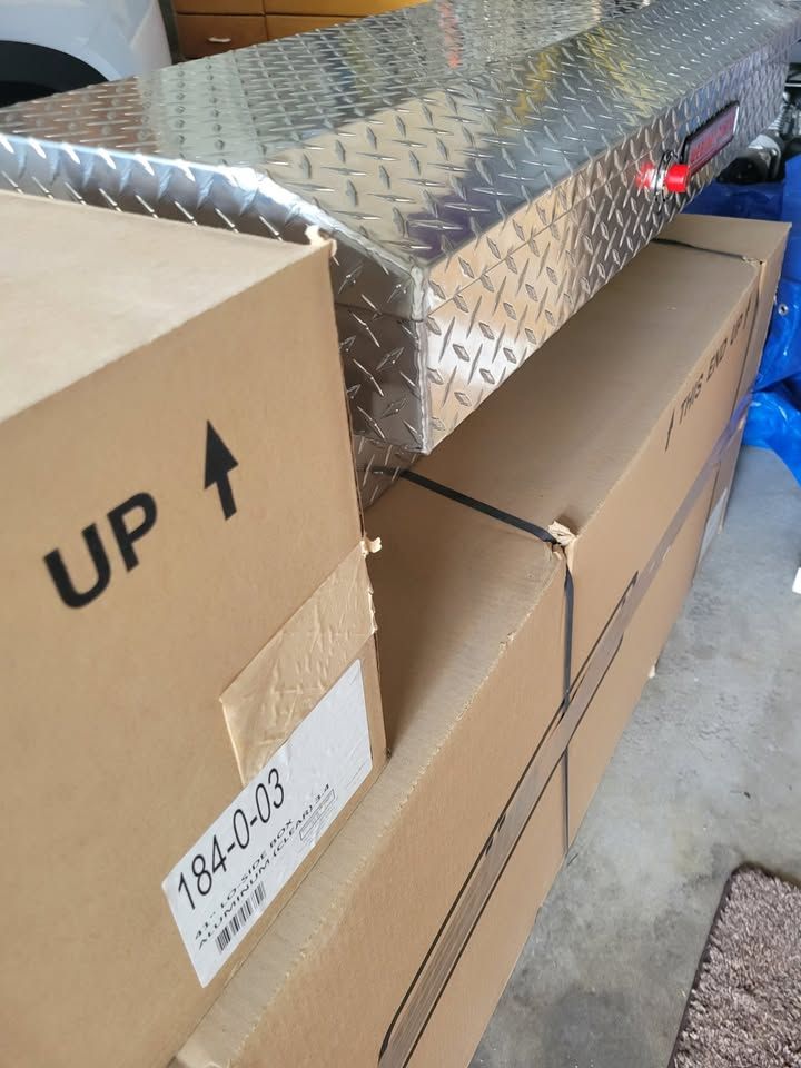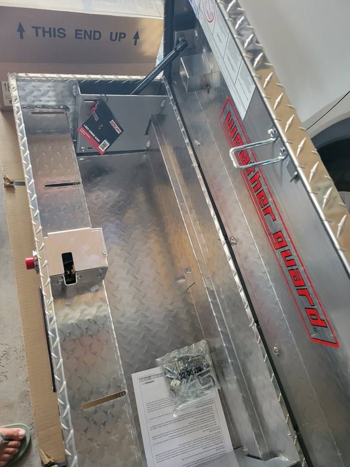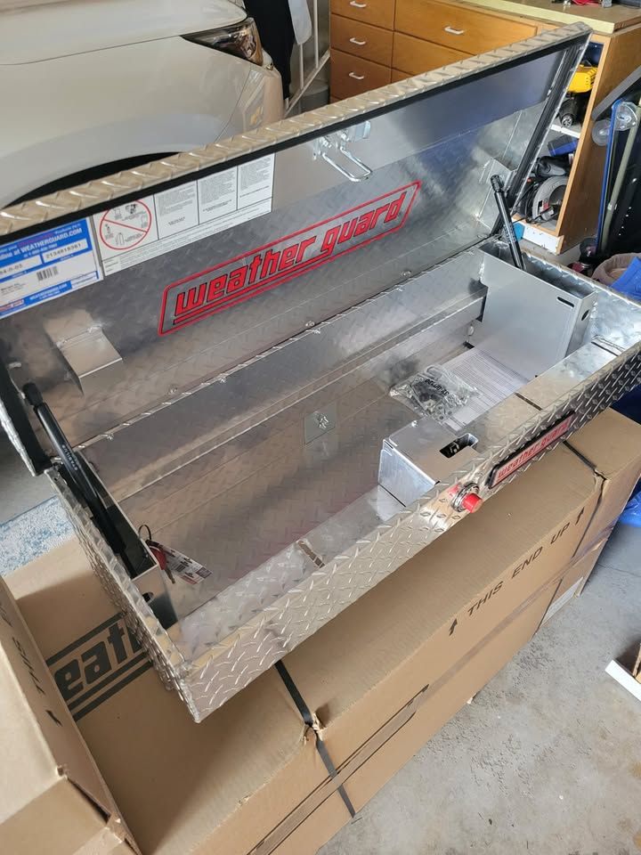 VenmoWeather Guard Lo-Side Box Model 184-0-04 (current version) - 41in aluminum truck tool box. 3.0 cu ft storage. Tamper-resistant codeable push-button lock. 90-degree opening. PowerSync compatible. Clear ARMOR TUF powder coat. Drill-free install. Lifetime warranty.