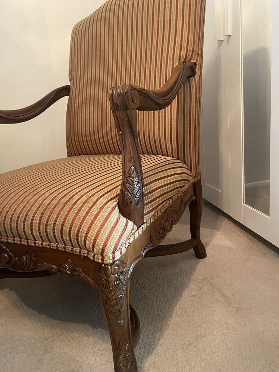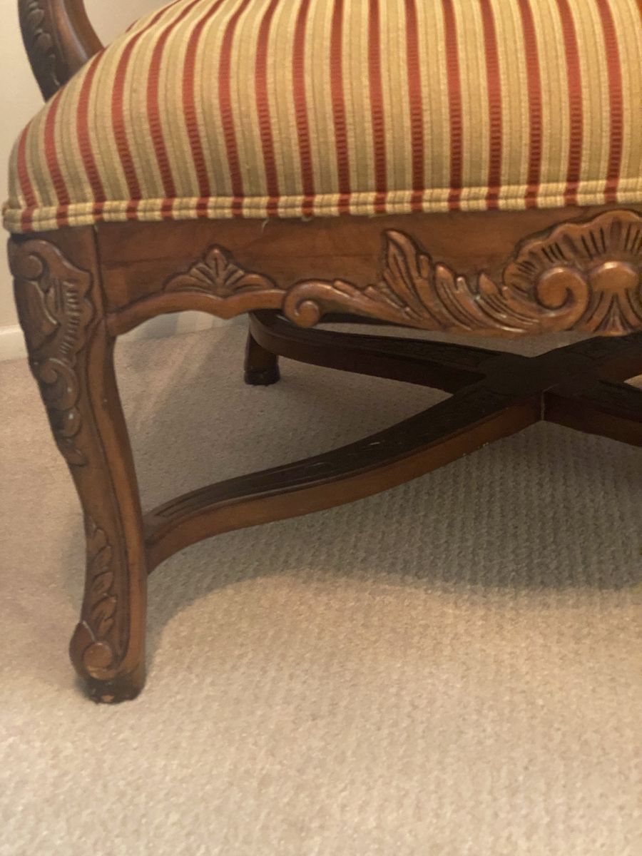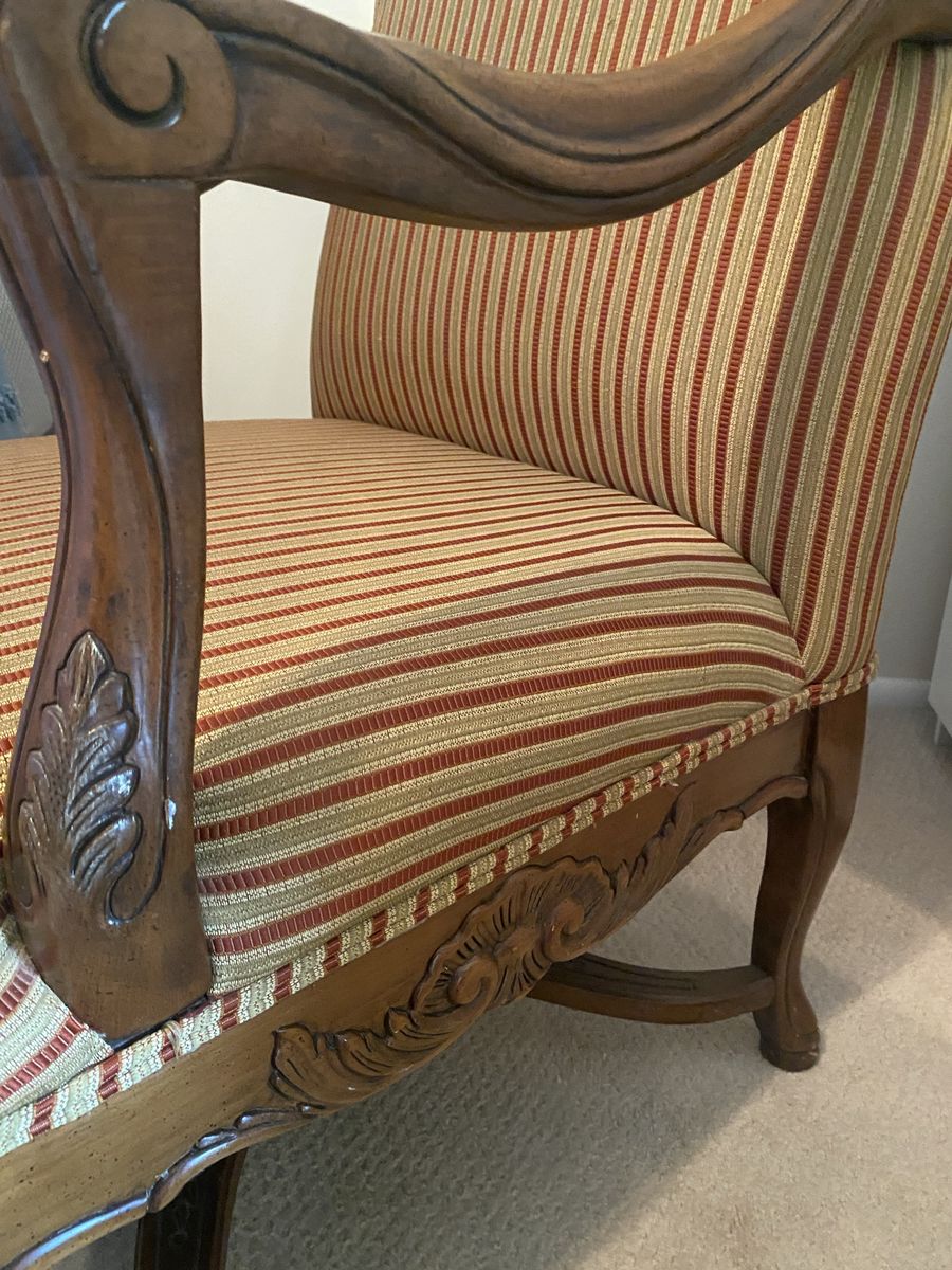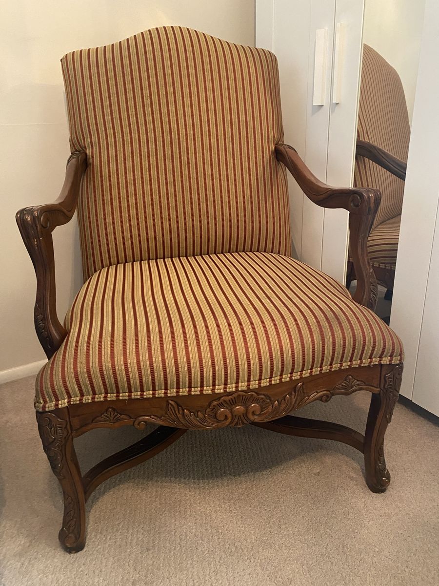 ZelleLarge profile chair with ornate woodcut pattern. Well-made sturdy chair. Designer accents. Reupholster to match your color palette.