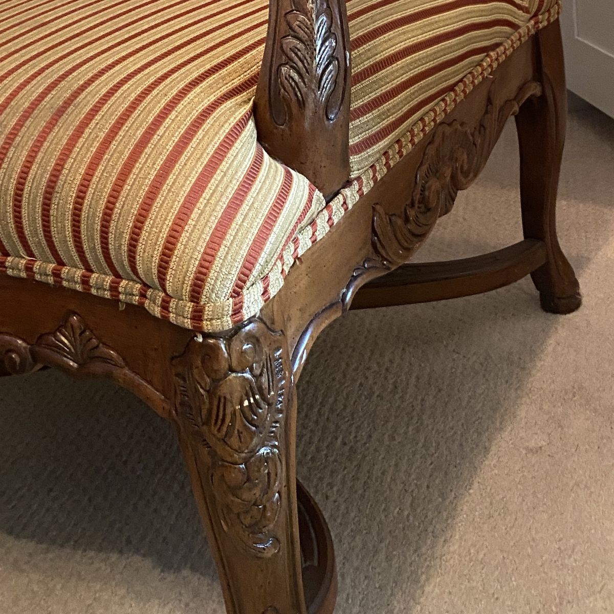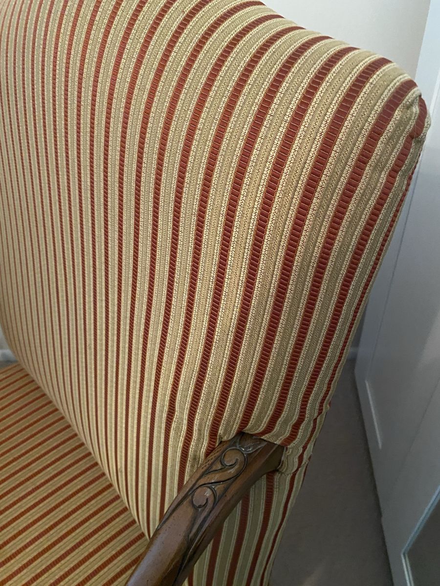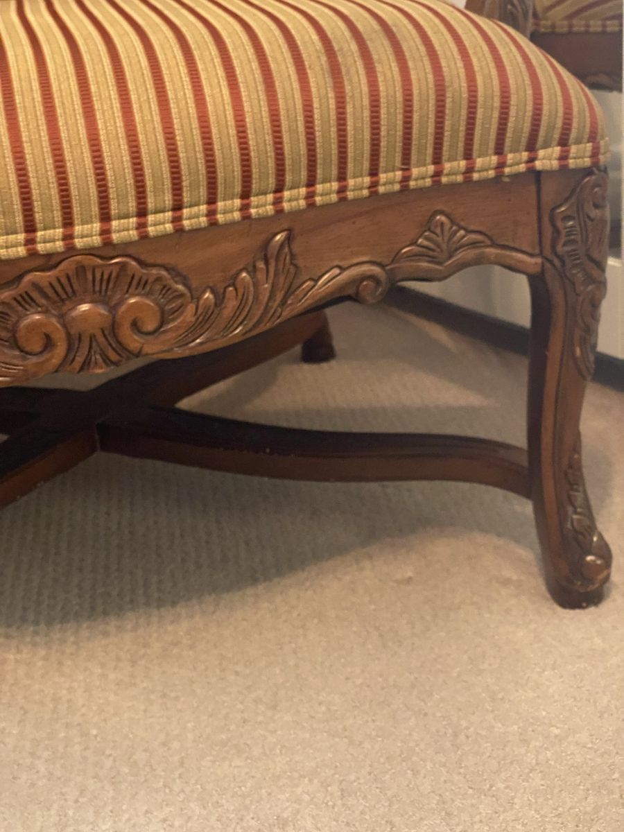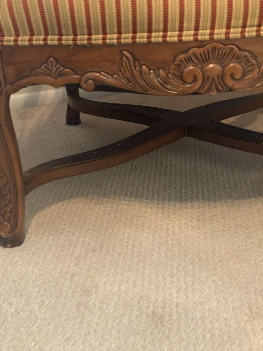 ZelleLarge profile chair with ornate woodcut pattern. Well-made sturdy chair. Designer accents. Reupholster to match your color palette.