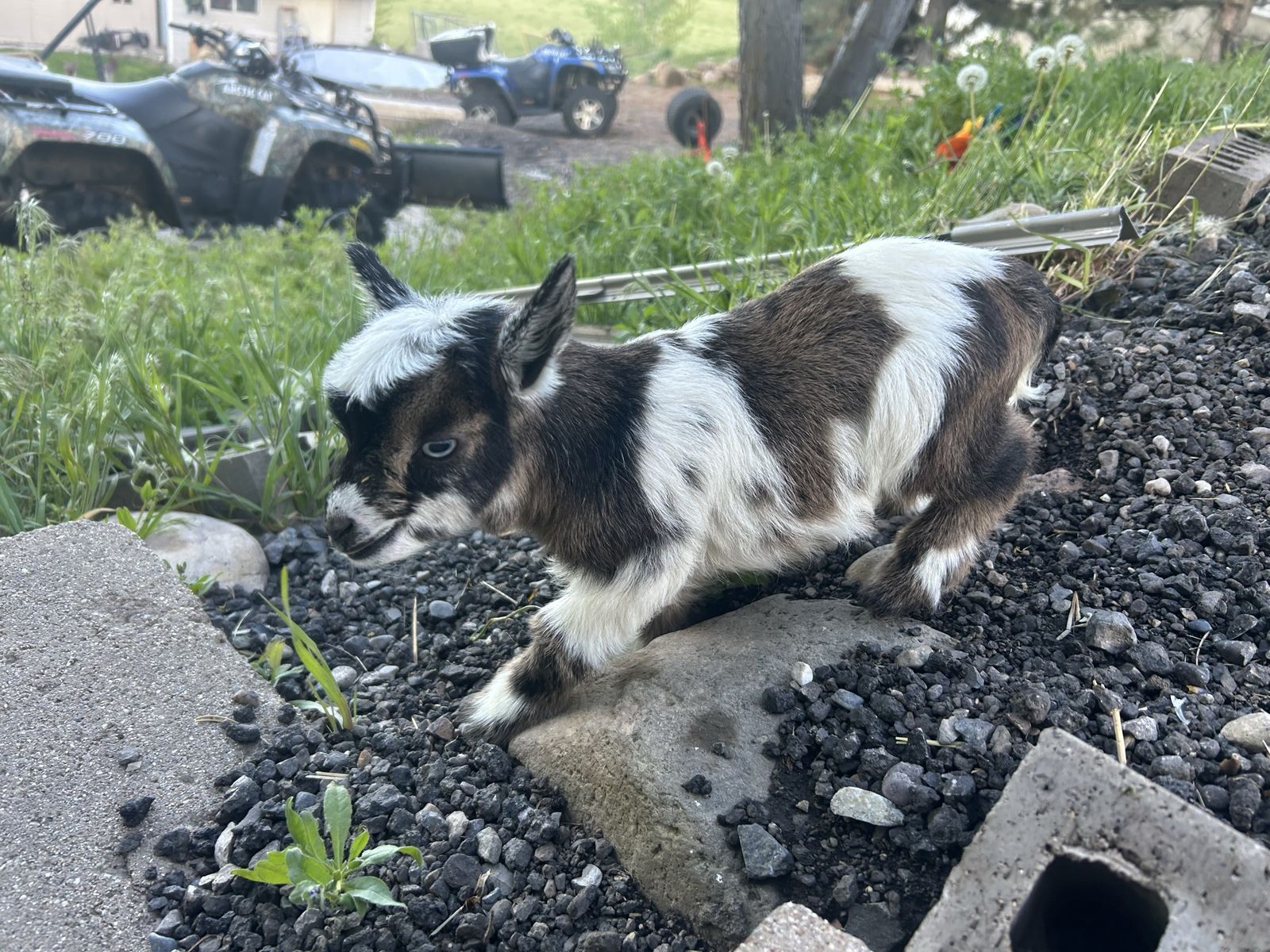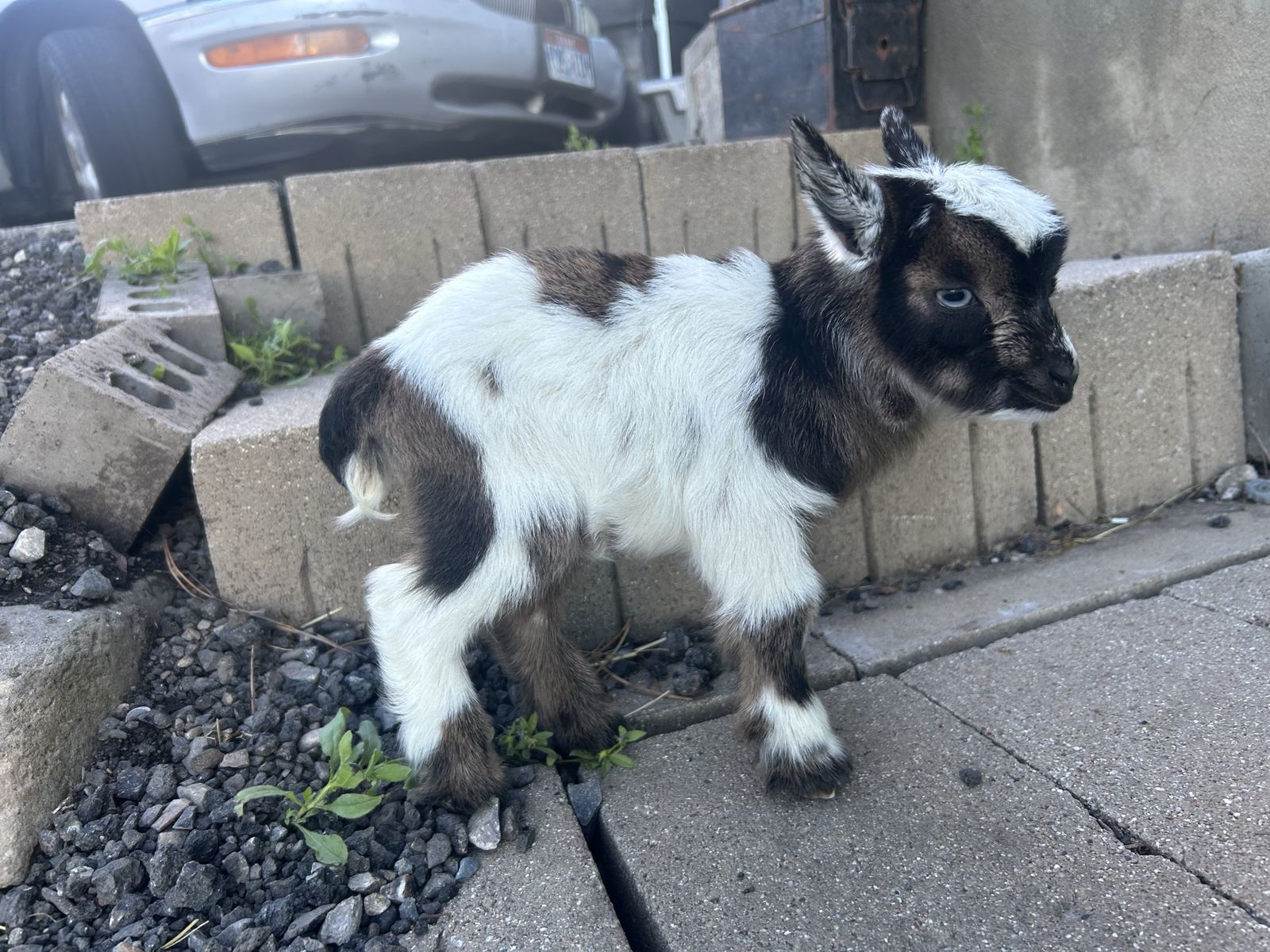 Female Nigerian dwarf. Born 4/23/26 bottle baby. She has waddles and blue eyes. $200 OBO