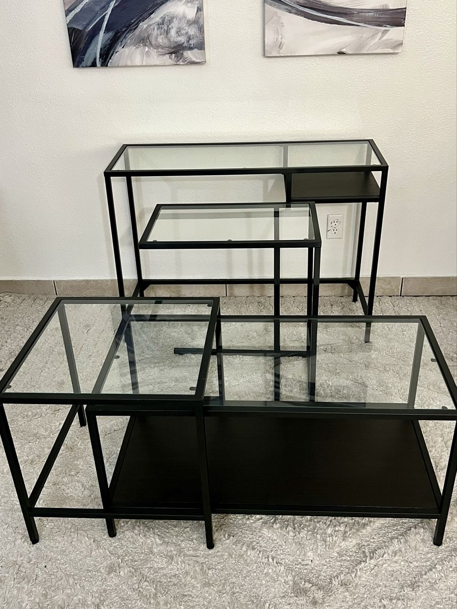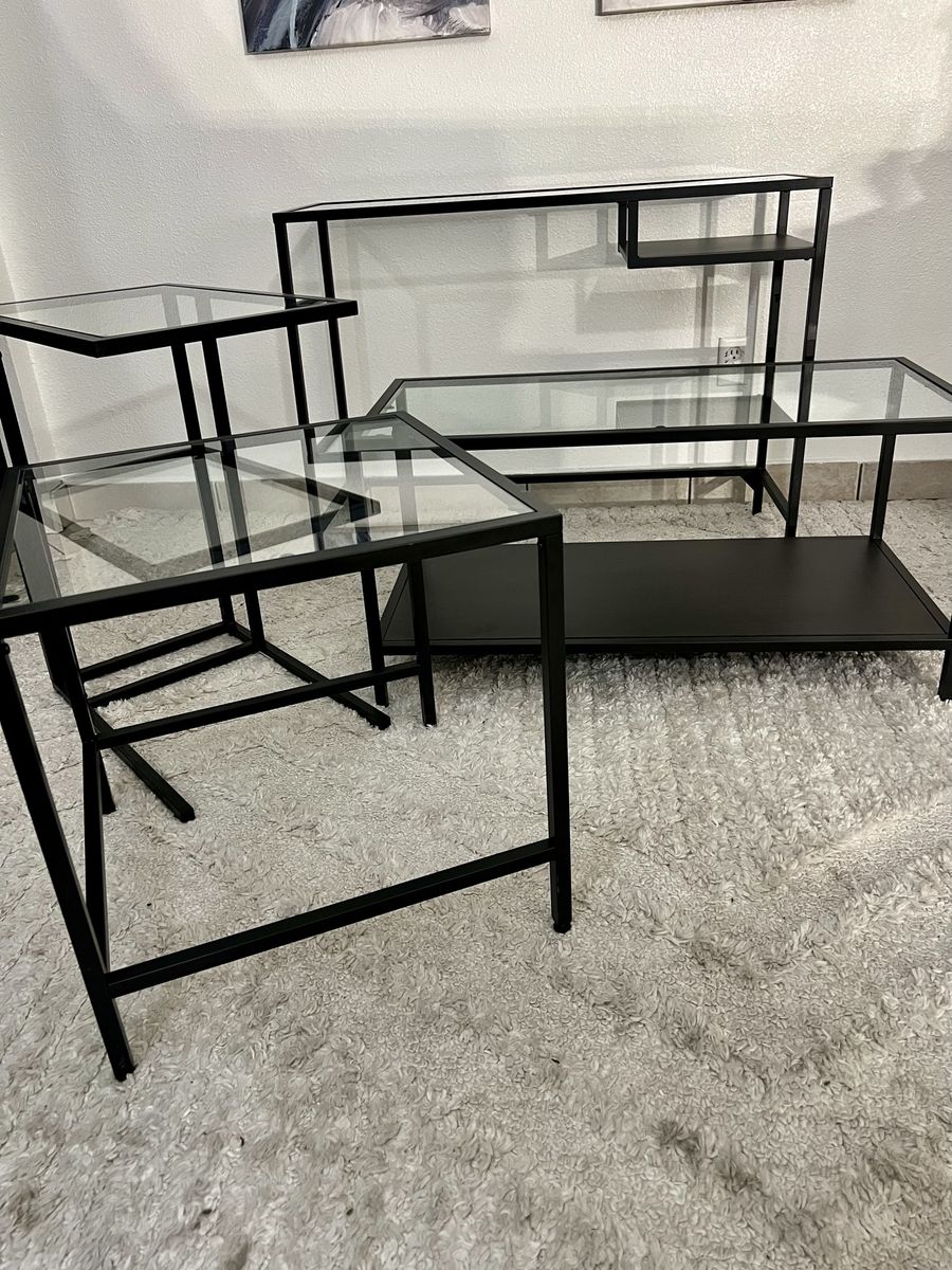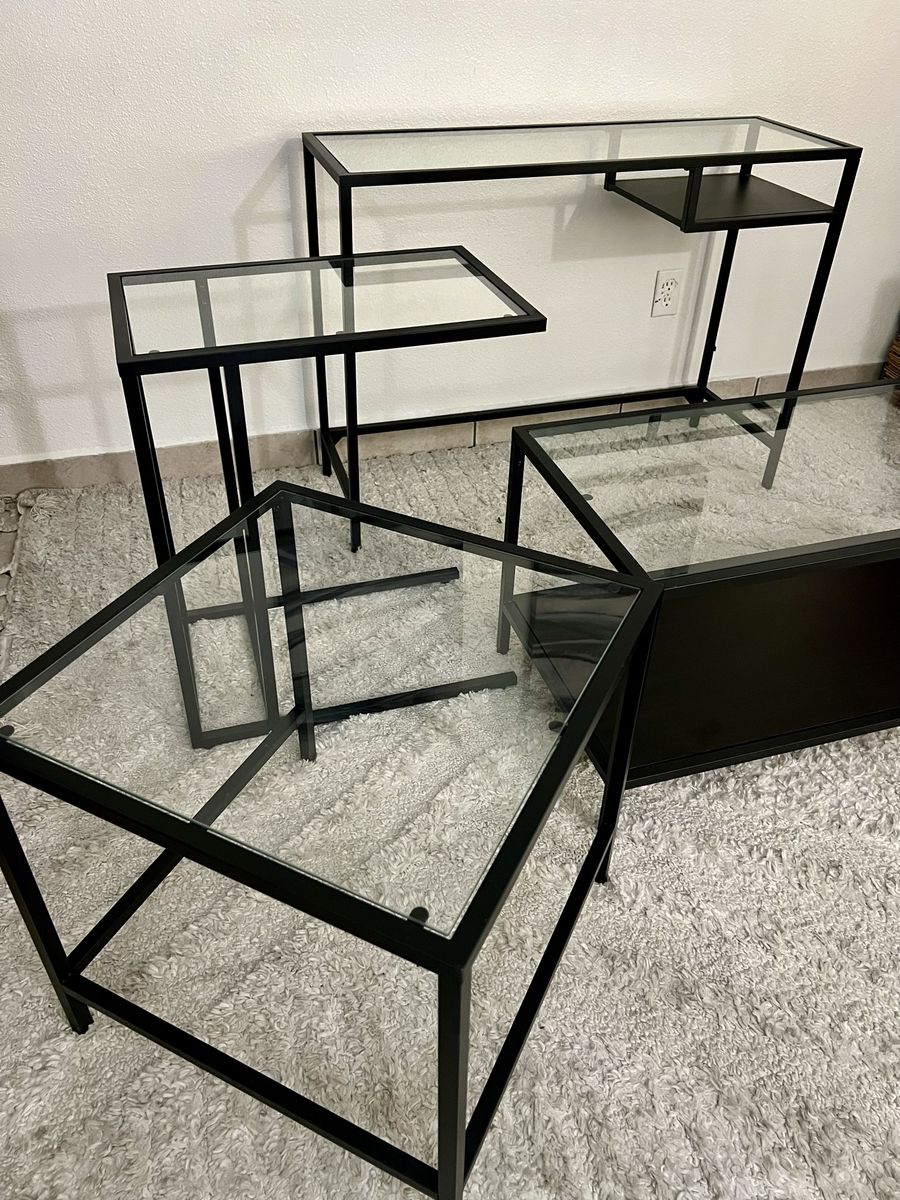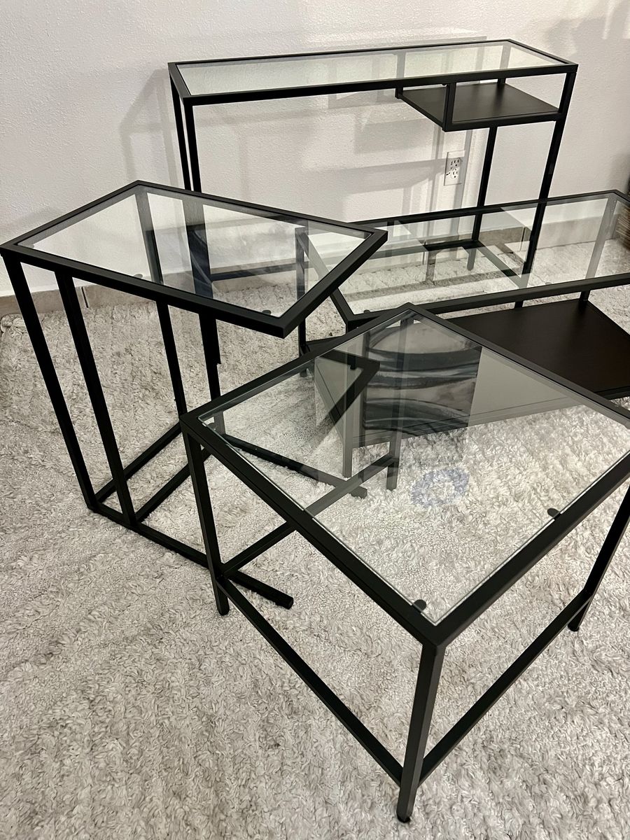 ApplePaySelling a modern IKEA glass‑top table set, all in great condition. Includes a glass coffee table, a square side table that slides right over it for a layered look, a handy L‑shaped side table, and a tall laptop desk that was used as an entry table.