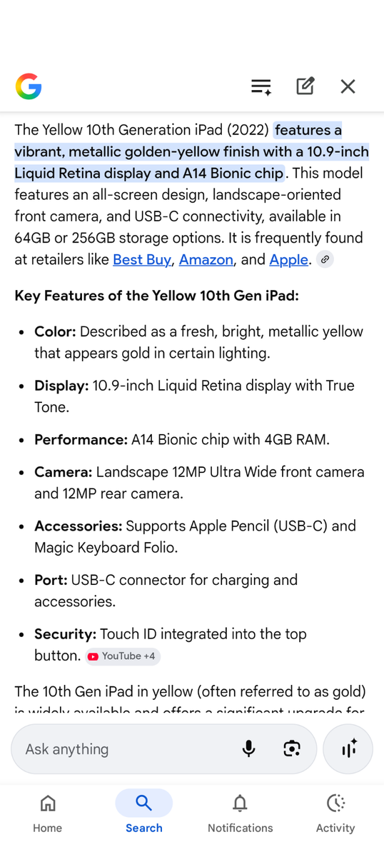 VenmoI'm selling my like new iPad. Yellow/gold with magic folio keyboard/case. 64 gb 10.9 inch display. I bought it in 2023. No cracks in screen or dings on edges. Perfect condition. Cash or Venmo only. No trades.