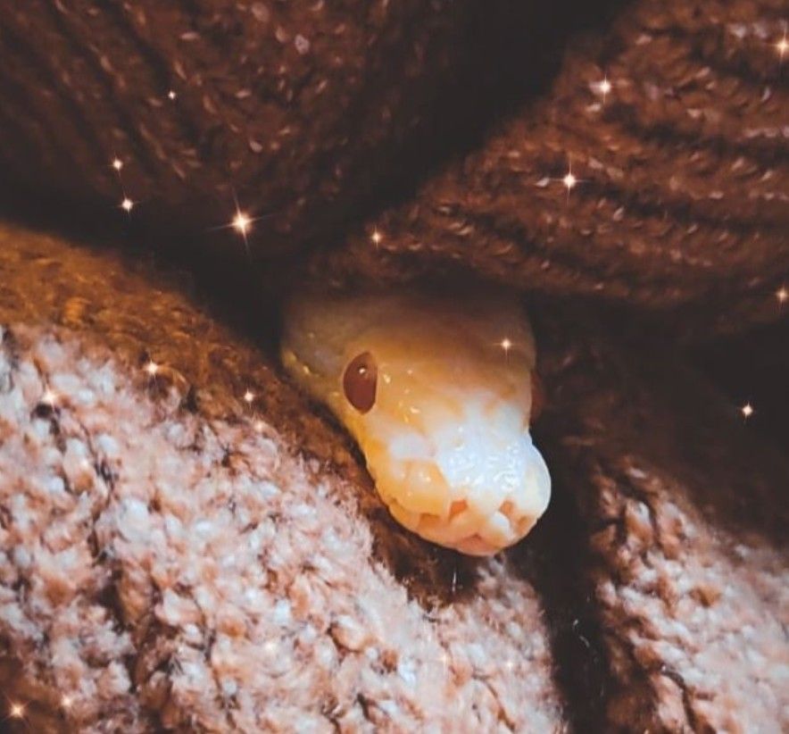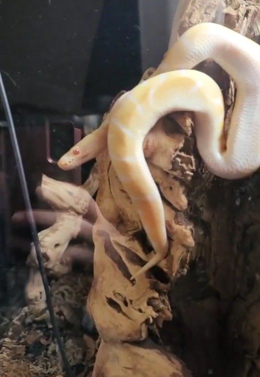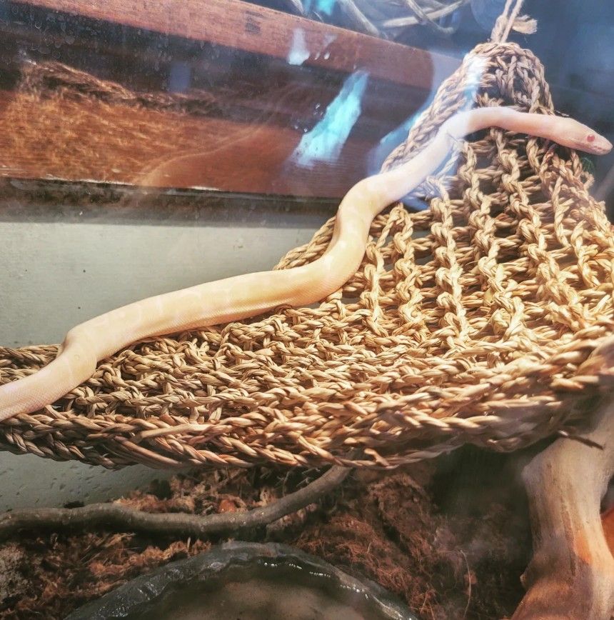 3-year-old albino Woma python available. Beautiful yellow and cream coloring with red eyes. She has a really unique look and a lot of personality.