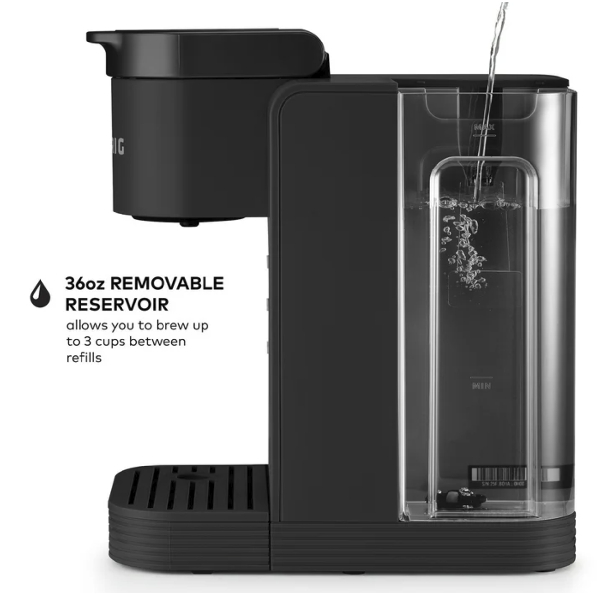 CONVENIENT 36oz REMOVABLE WATER RESERVOIR: Allows you to brew up to 3 cups between refills.