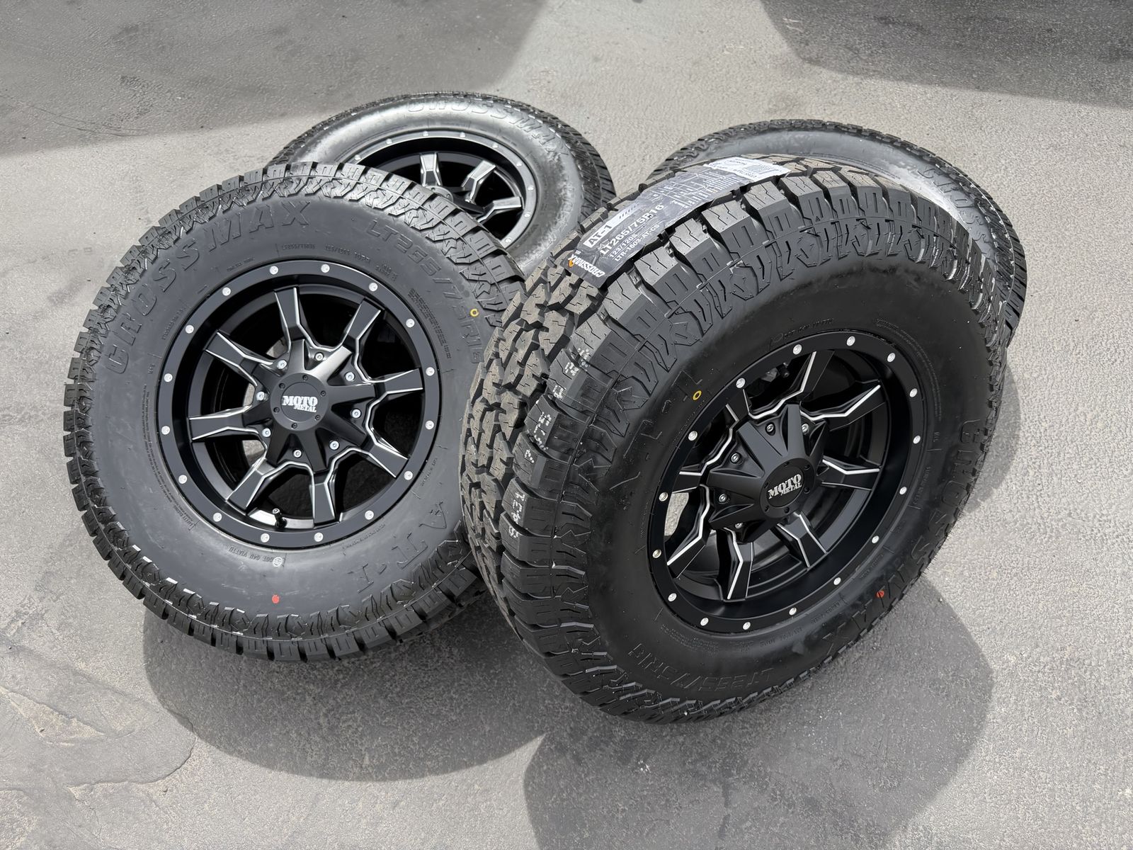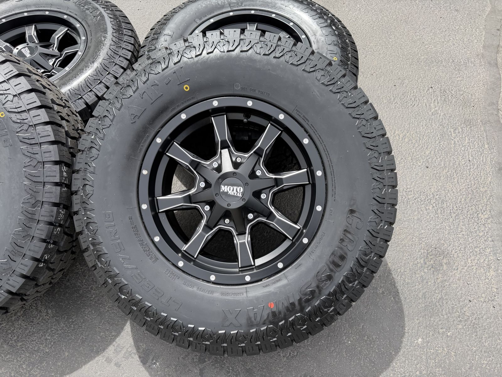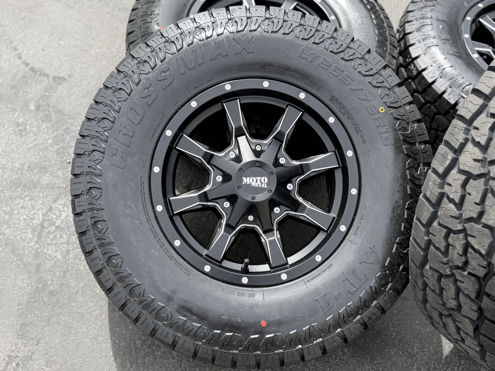 LT265/75r16 Load e 10 ply Crossmax AT tires. Mounted and balanced on new 16x8 00et offset Moto Metal Mo970 wheels. 6x5.5 bolt pattern (6x139.7). These fit Chevrolet Silverado 1500 GMC Sierra yukon tahoe Suburban. Huge savings! Call or txt 801-876-0324