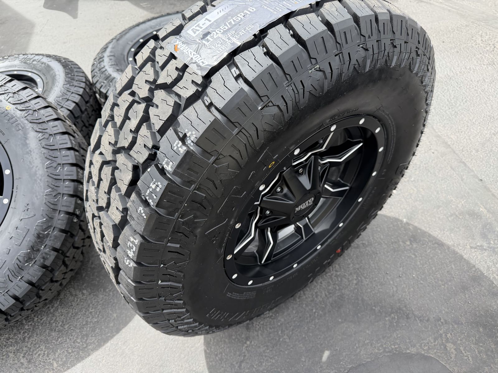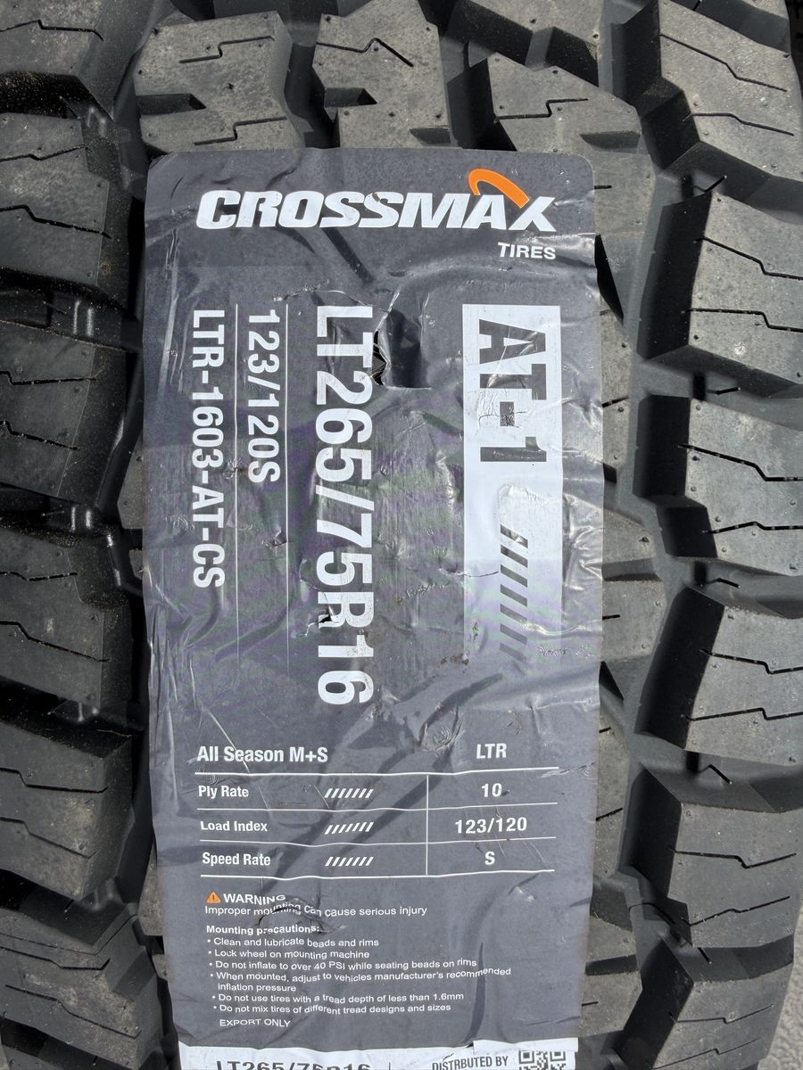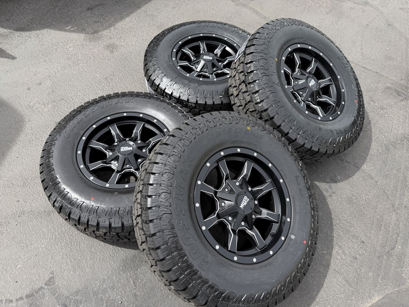 LT265/75r16 Load e 10 ply Crossmax AT tires. Mounted and balanced on new 16x8 00et offset Moto Metal Mo970 wheels. 6x5.5 bolt pattern (6x139.7). These fit Chevrolet Silverado 1500 GMC Sierra yukon tahoe Suburban. Huge savings! Call or txt 801-876-0324