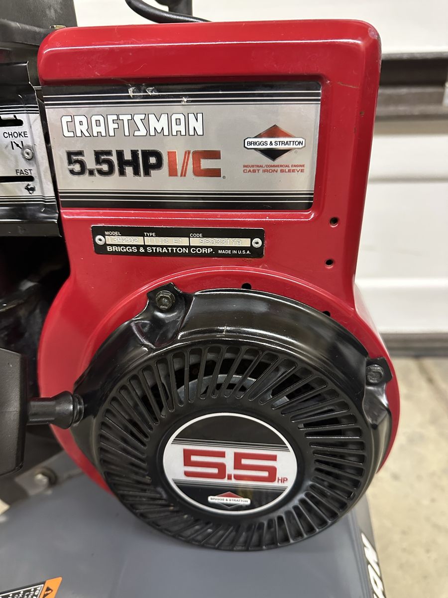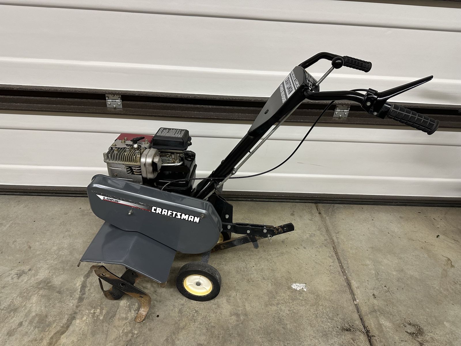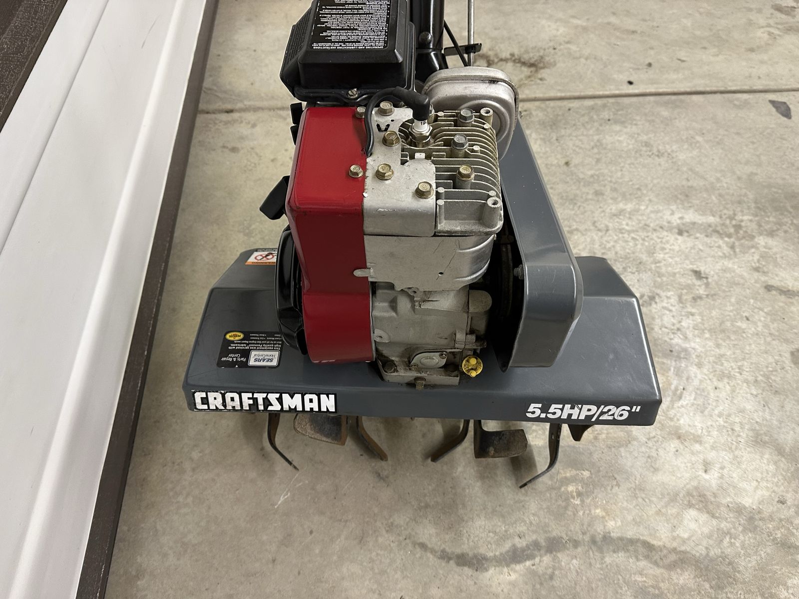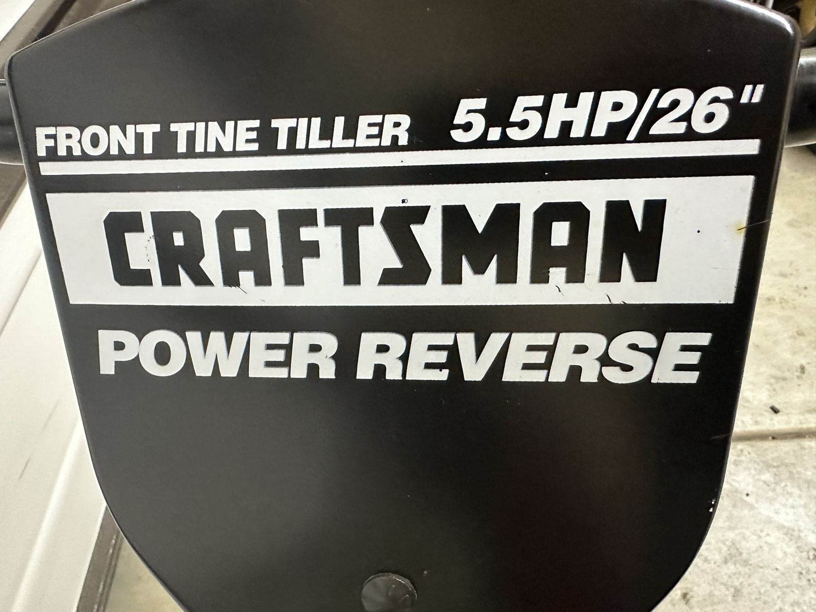 Fantastic Condition Craftsman 5.5HP Front Tine Tiller This is easily one of the best-maintained tillers I have ever seen or worked on. It is in nearly new shape and mechanically perfect. • Engine: Reliable 5.5HP Briggs & Stratton I/C (Industrial/Commercial). • Path: Large 26" tilling width. • Features: Power Reverse for easy maneuvering and transport wheels. • Condition: Pristine. Starts right up and runs exceptionally strong.
