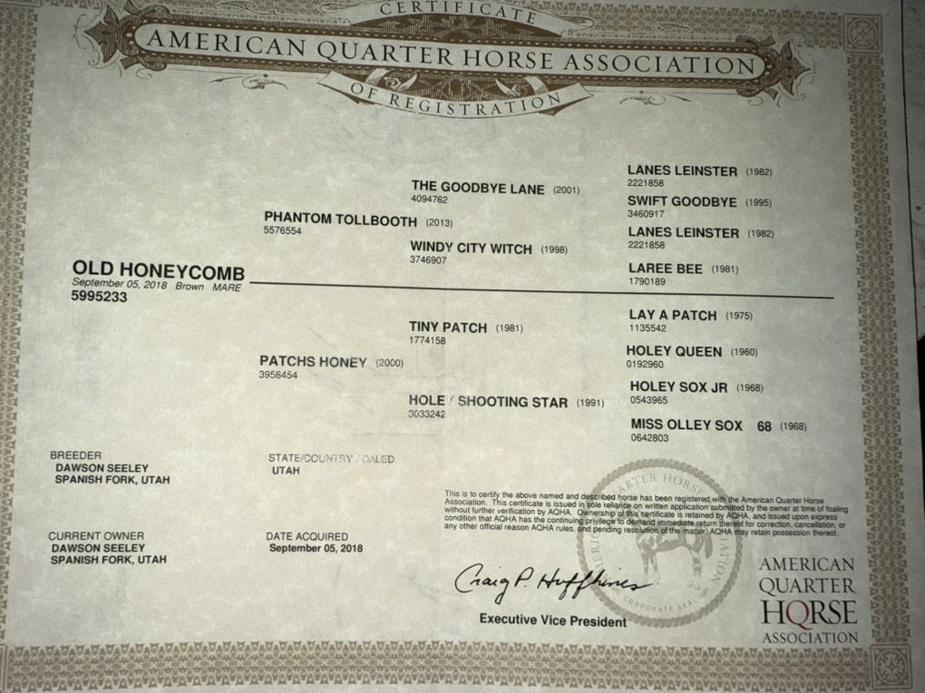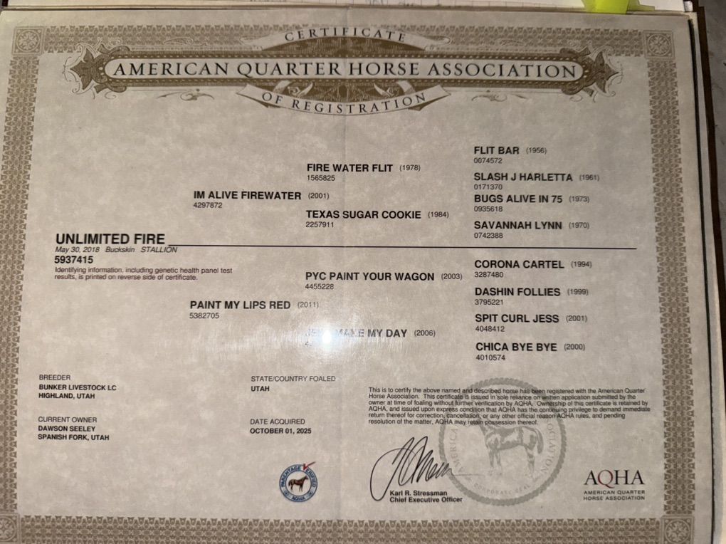 Fire is out of registered parents (papers below) and we are currently working on his registration as well. We guarantee papers on this colt if he is purchased before they are sent back.