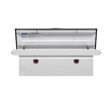 VenmoWeather Guard 128 Saddle Box - 71.5in full extra wide steel saddle box. 15.1 cu ft storage capacity. Extreme Protection lock system. Automotive rotary latch. Full weather seal. Fits over bed rails. Includes steel divider tray. Brite White powder coat. Lifetime warranty. Classic and durable truck bed storage.