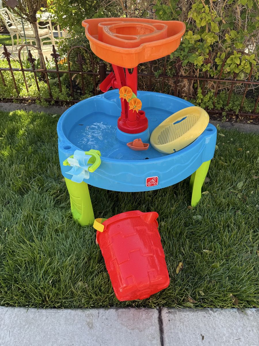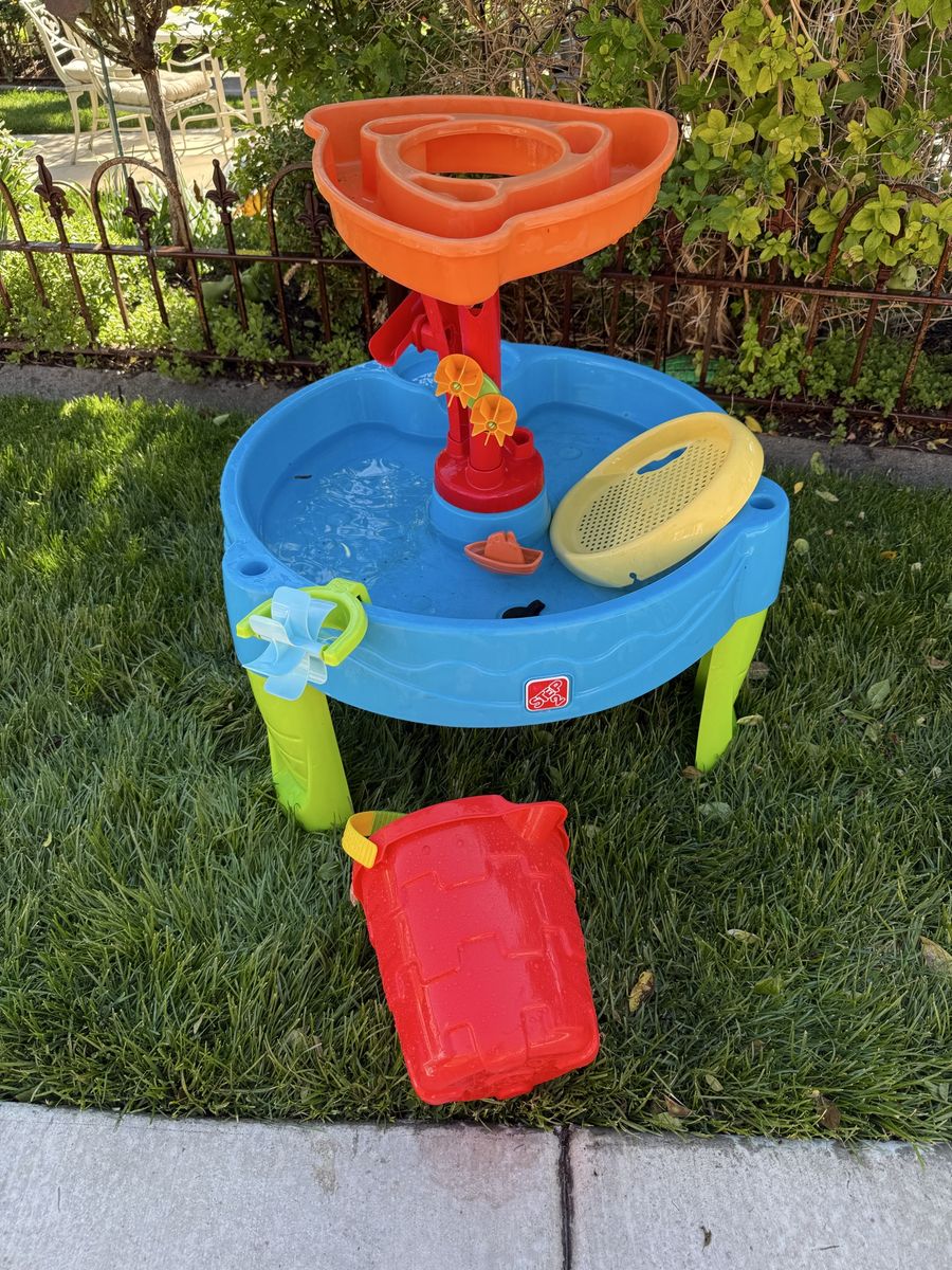 Sand and water table with all shown. It only has two braces instead of three but works just fine the way that it is.