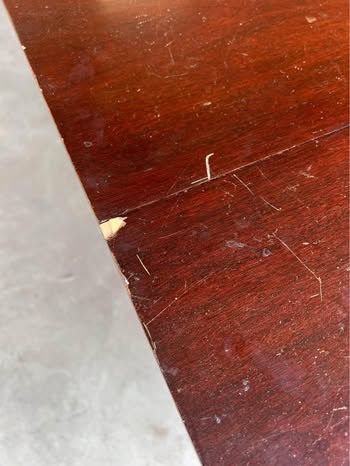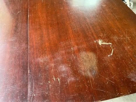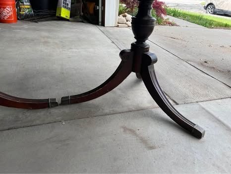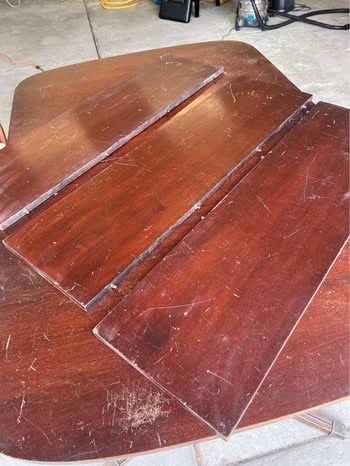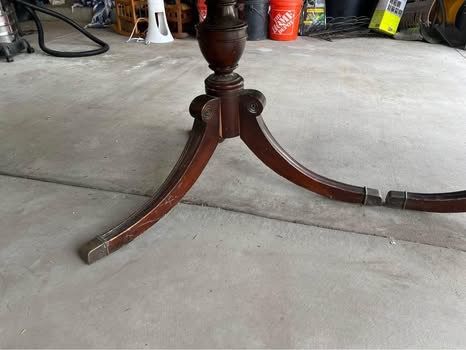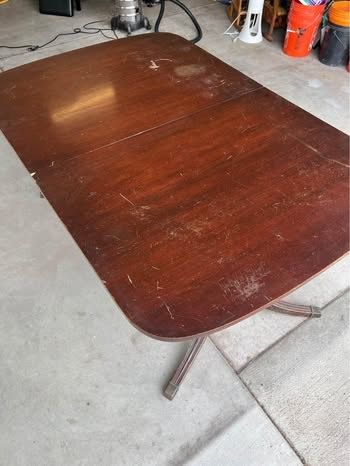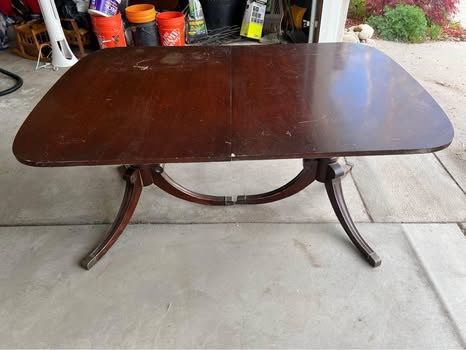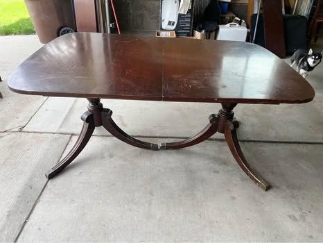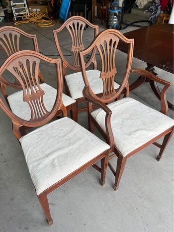 VenmoVintage/antique solid wood dining room table set with 4 chairs. Good bones, needs some love (see pictures for wear and tear - scratches and one table leg needs some wood glue). Chairs are newly upholstered (rust stains on one) and comes with extra matching fabric to re-do the one with rust stains, if desired. Table includes three leaves (all fit nicely). Measurements without leaves are: 63 3/4 inches long x 42 inches wide x 29 3/4 inches tall. Each additional leaf adds 12 inches in length.