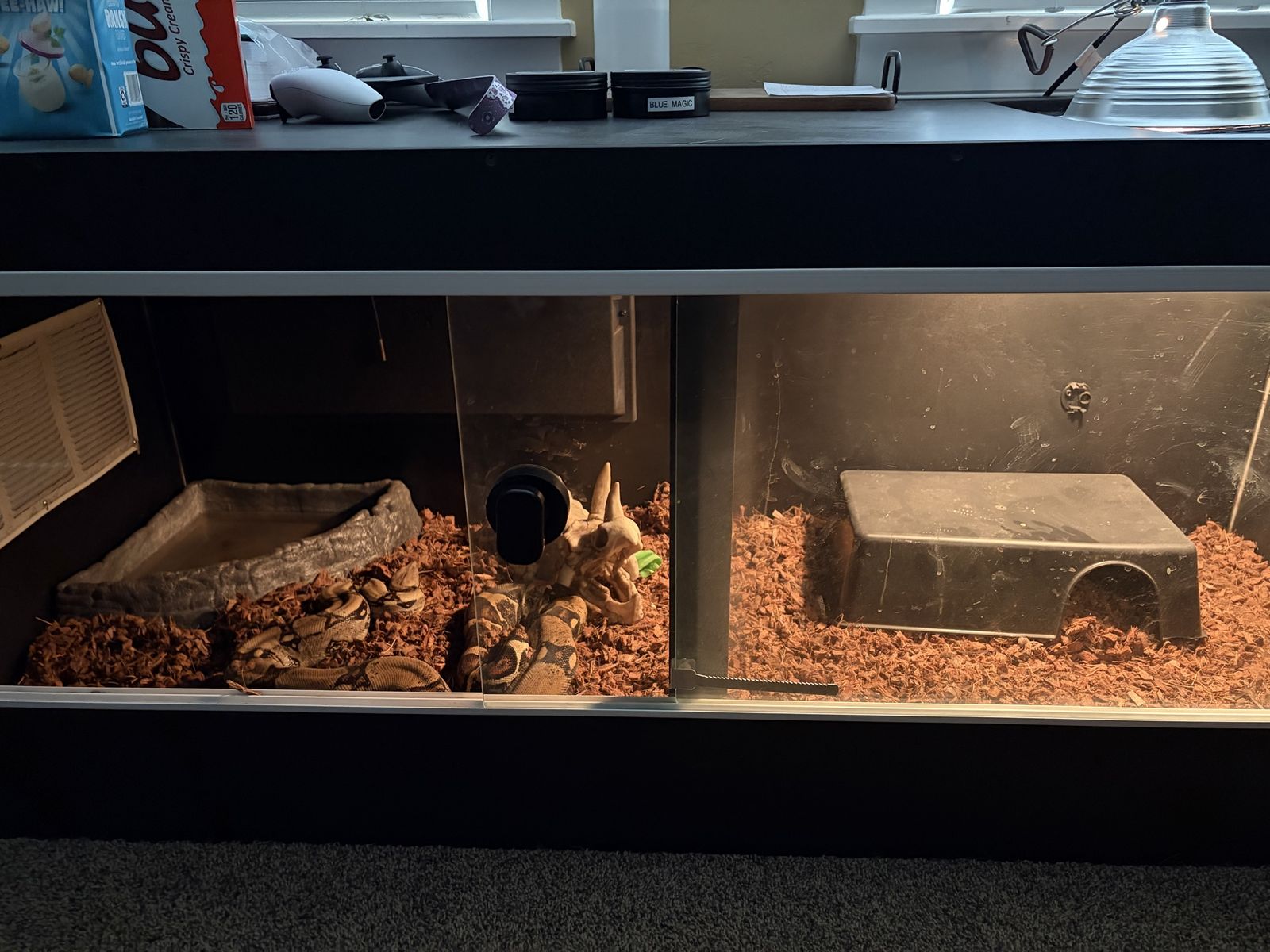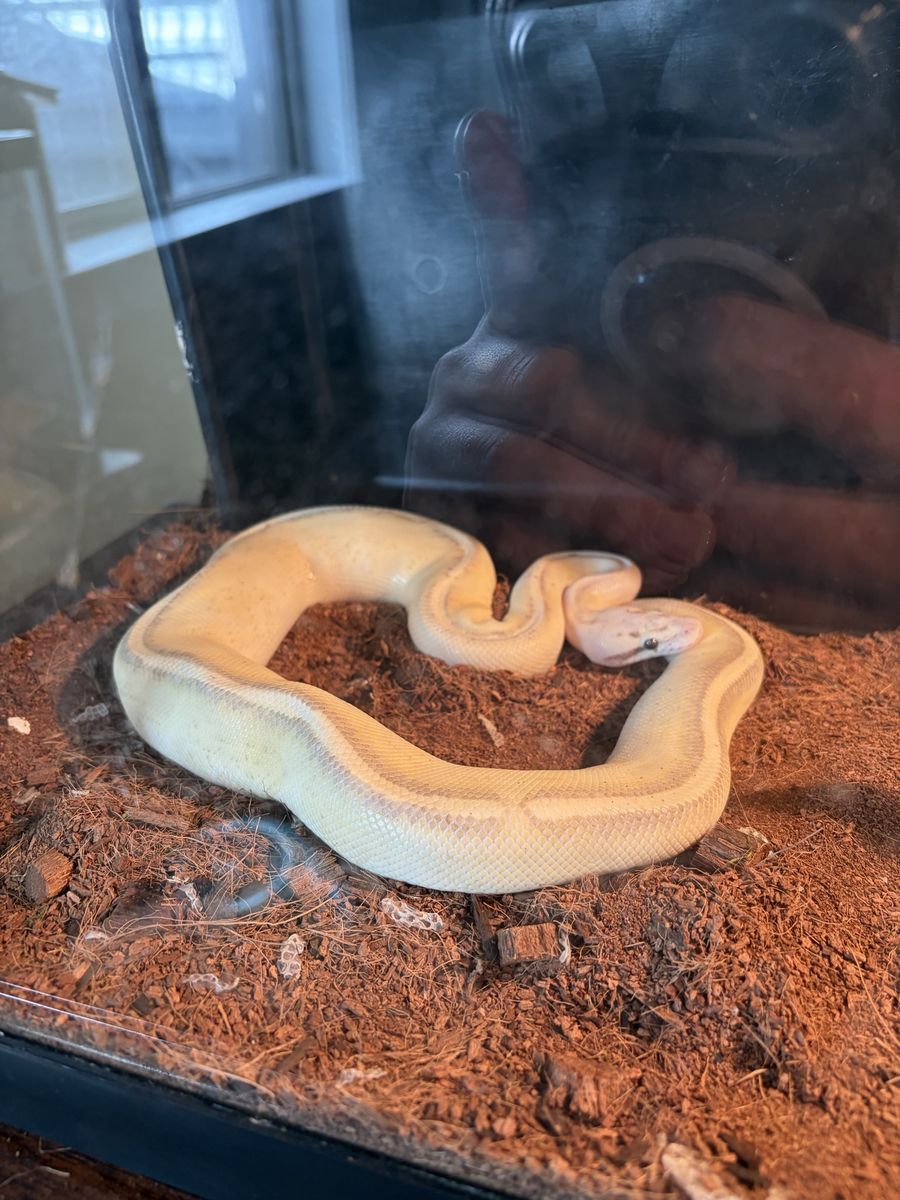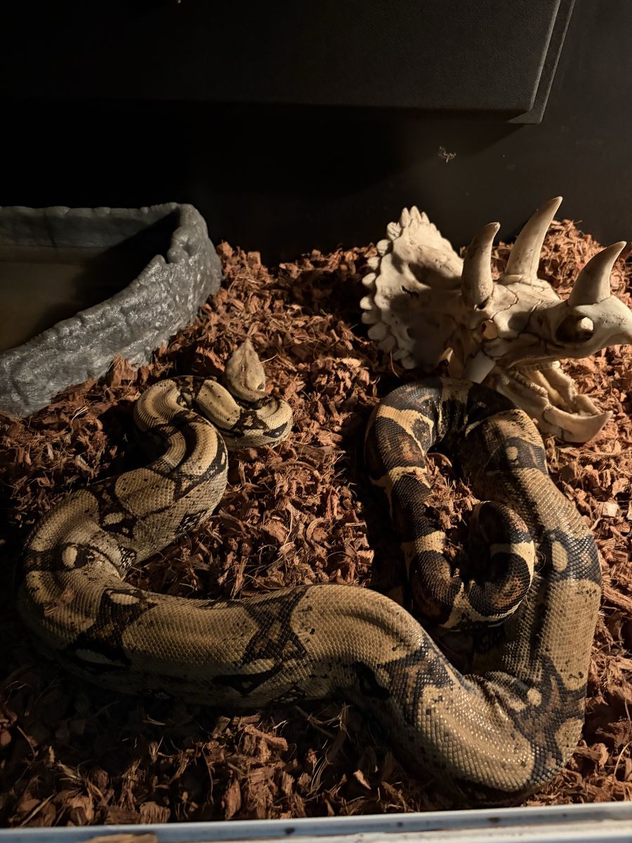 i’ve got a baby on the way and i’m sadly having to down size my collection, i’ve got a tiger reticulated python, a black pinstripe and a white pinstripe ball python, two normal ball pythons and a cinnamon white ball python and a fully grown killer bee ball pythons. i have a normal red tail boa and a the lighter one in pictures is an ivory boa im pretty sure. all snakes will come with enclosure all eat amazing frozen thawed and all have amazing temperaments. will be asking more for the boas with there enclosure. enclosure was 800$ alone. Retic tiger - 500 white and black pinstripes are 250 each regular ball pythons are 100 each white cinnamon is 200 asking 800 for the two boas and enclosure asking 300 for my killer bee only females i have are the lighter colored boa and full grown killer bee ball python reach out with any questions