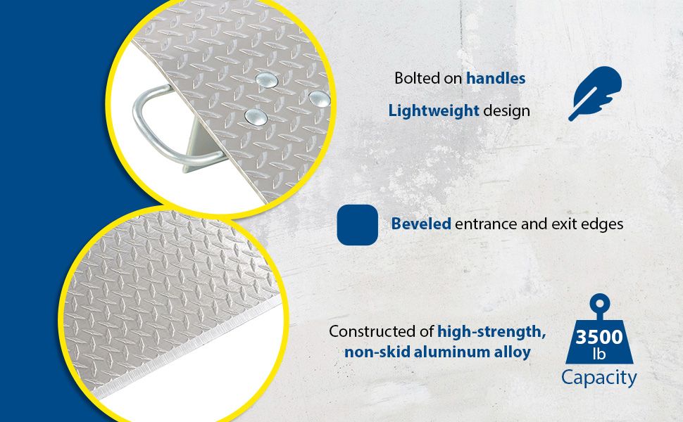 The aluminum economizer dock plate is an economical way to speed up truck loading and unloading. The unit spans the opening between dock and trailer to allow pallet or hand trucks along with traffic to safely move in and out of the trailer. The dock plate is constructed of high strength, non-skid aluminum alloy tread plate. The lightweight design with bolt on zinc plated legs and handles on each side makes portability easy. Locking legs for OSHA compliance. Not for use with fork trucks.