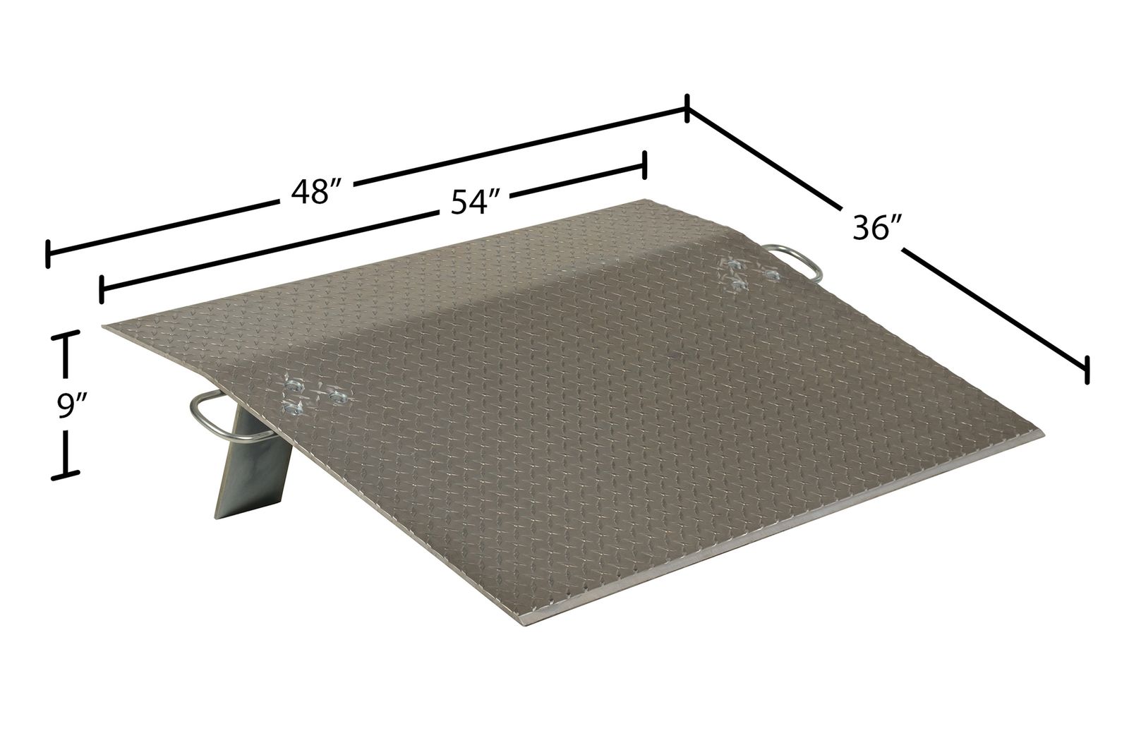 Uniform Capacity (lb.): 3500Bend or Crown (degrees): 11Distance Between Bend or Crown From Dockplate Edge (in.): 9Usable Width (in.): 48Usable Length (in.): 36Plate Thickness (in.): 3/8Height Difference Between Truck and Door (in.): 5Leg Height (in.): 9OSHA: 1910.30(a)ANSI: MH 30.2